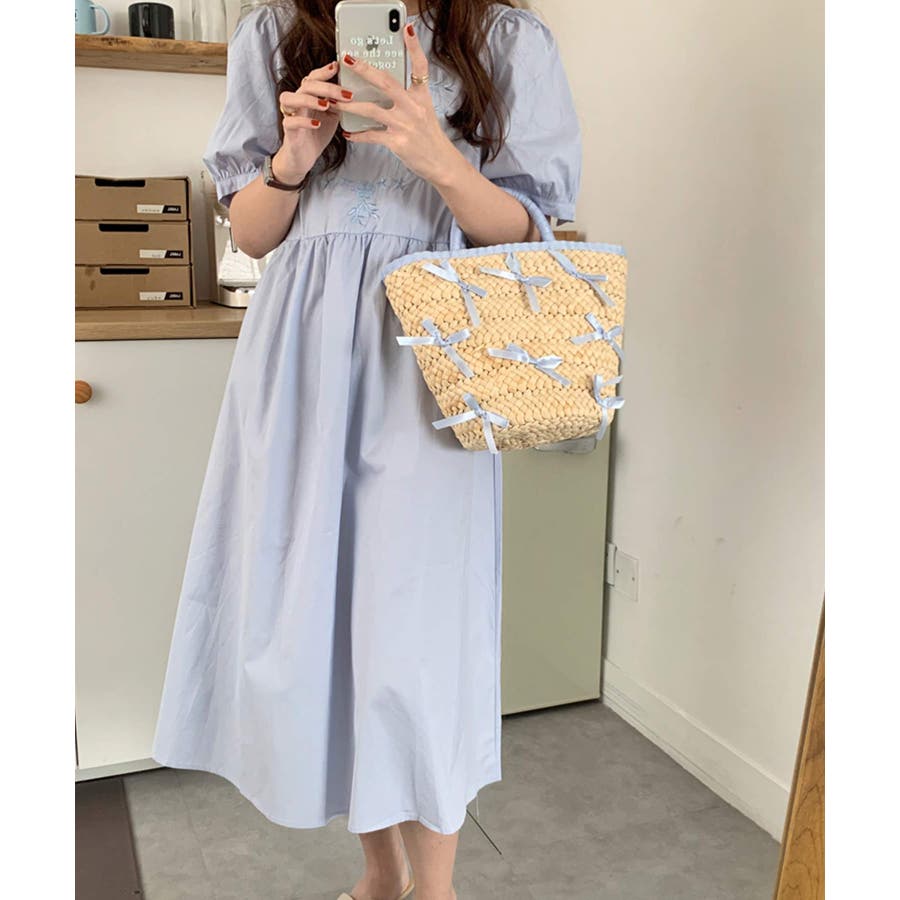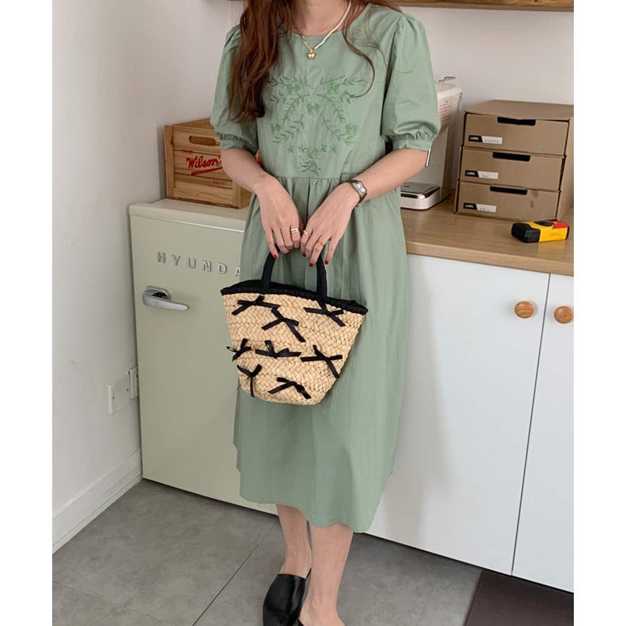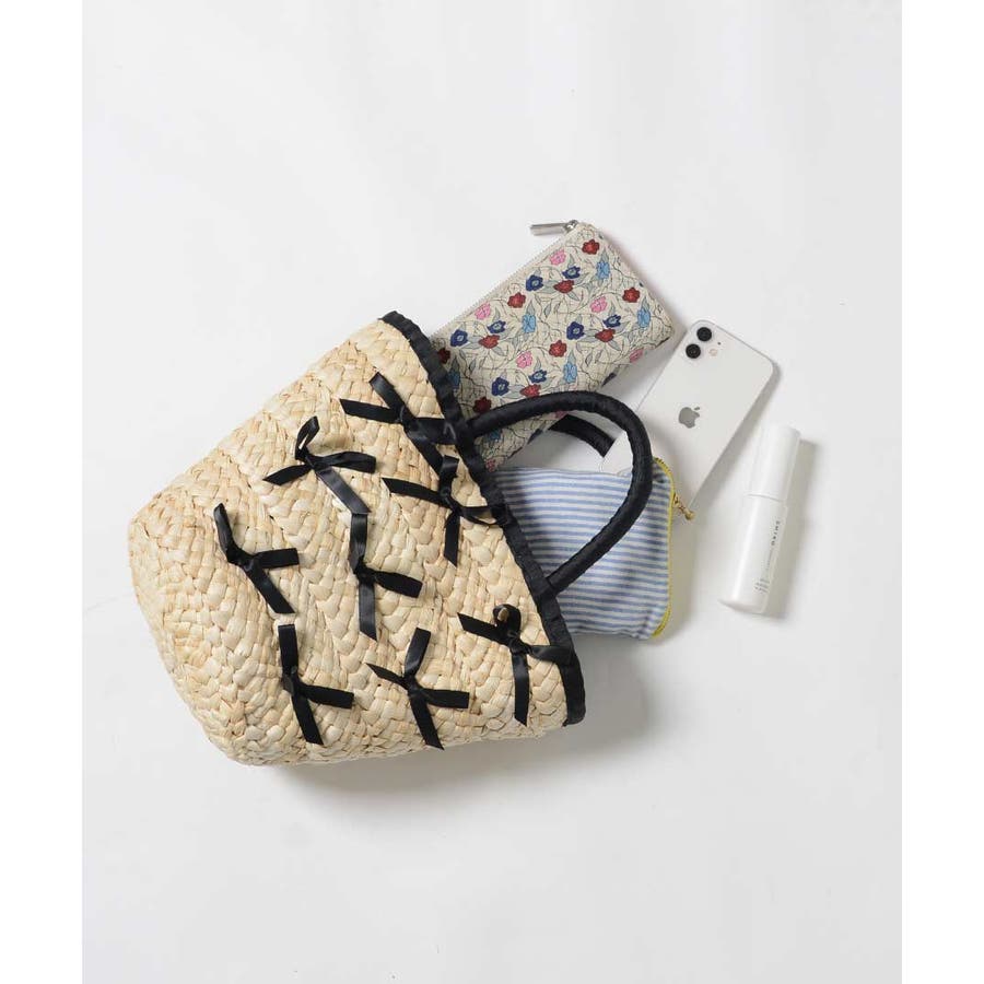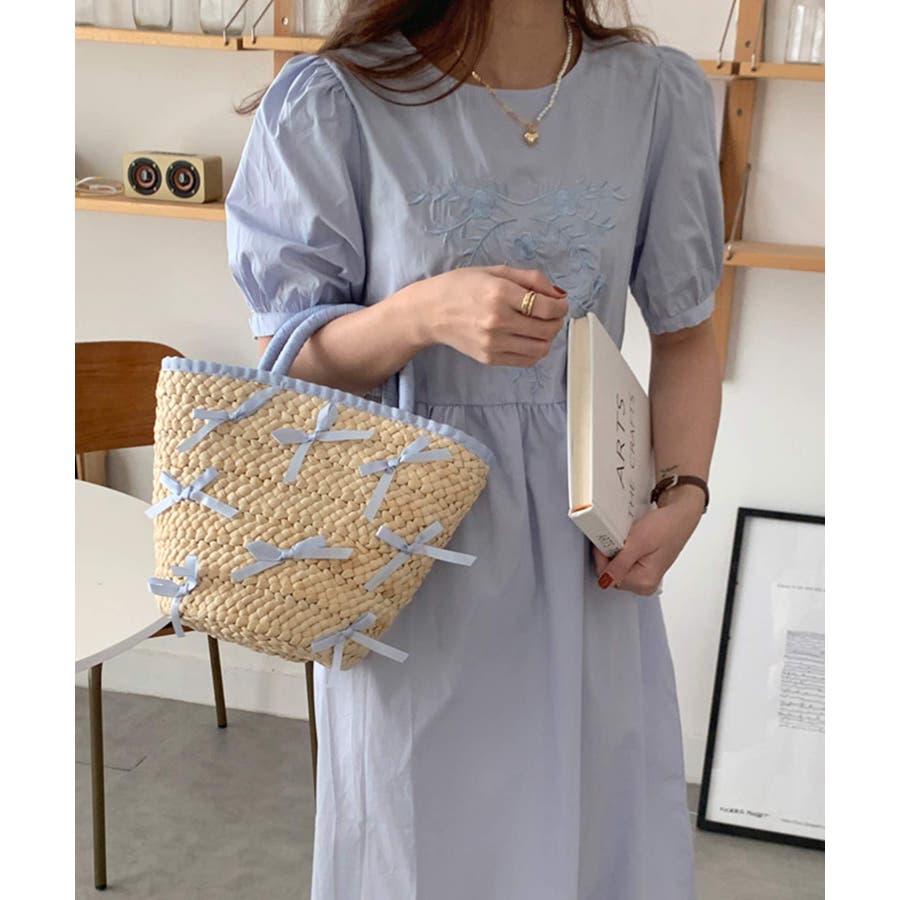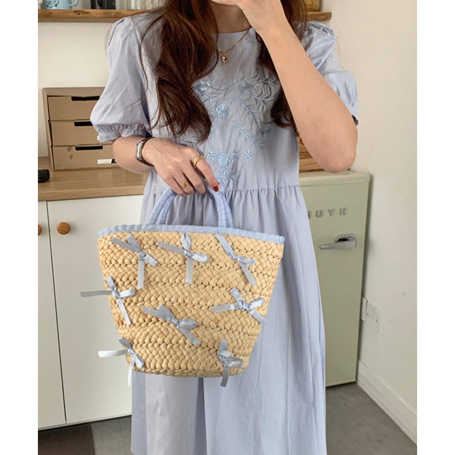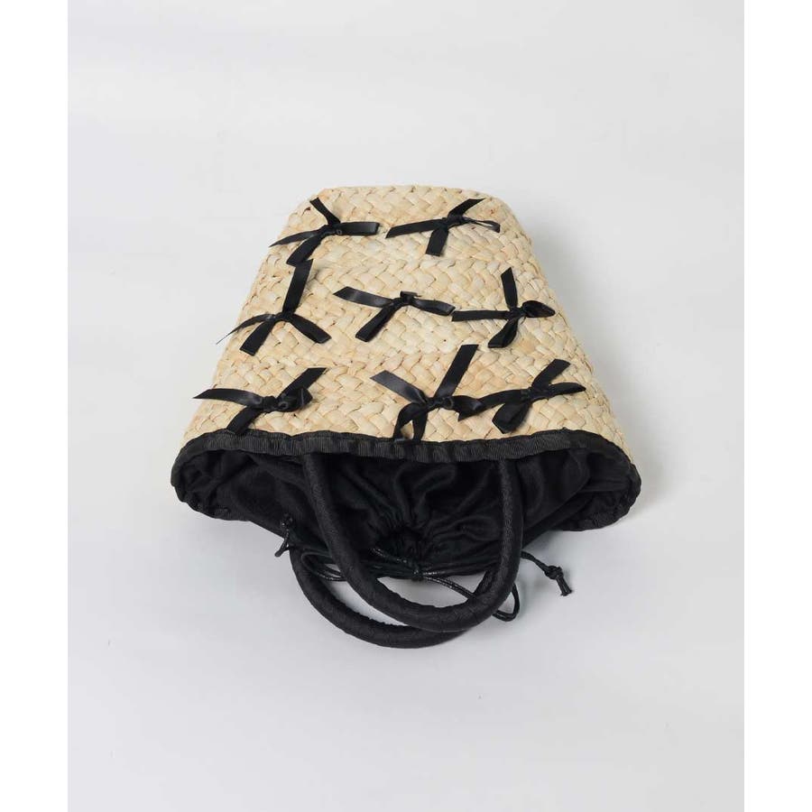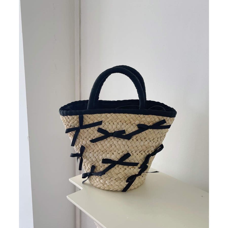 シンプルなかごバッグにリボンがデコレーションされたかわいいバッグ。
