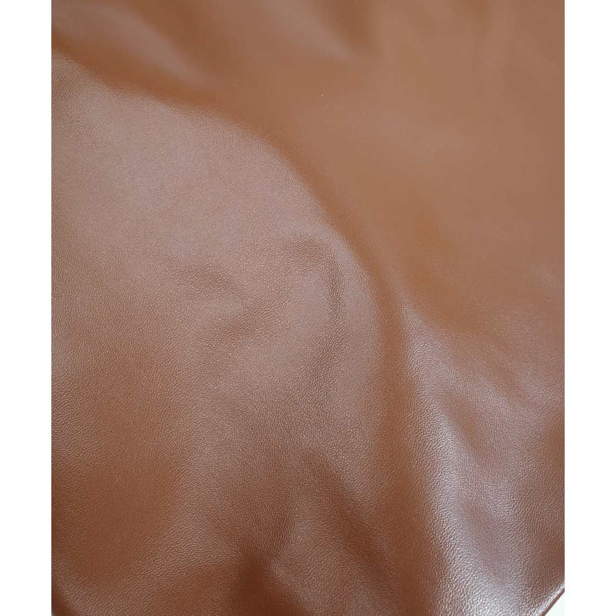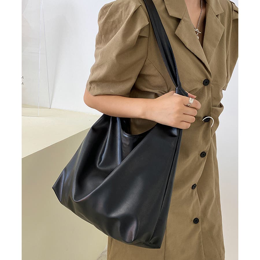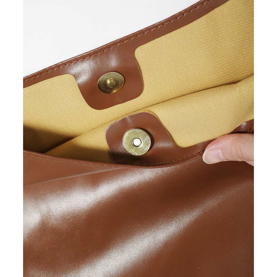 フェイクレザーでかっちりしすぎない雰囲気が余裕のあるトレンドスタイル。