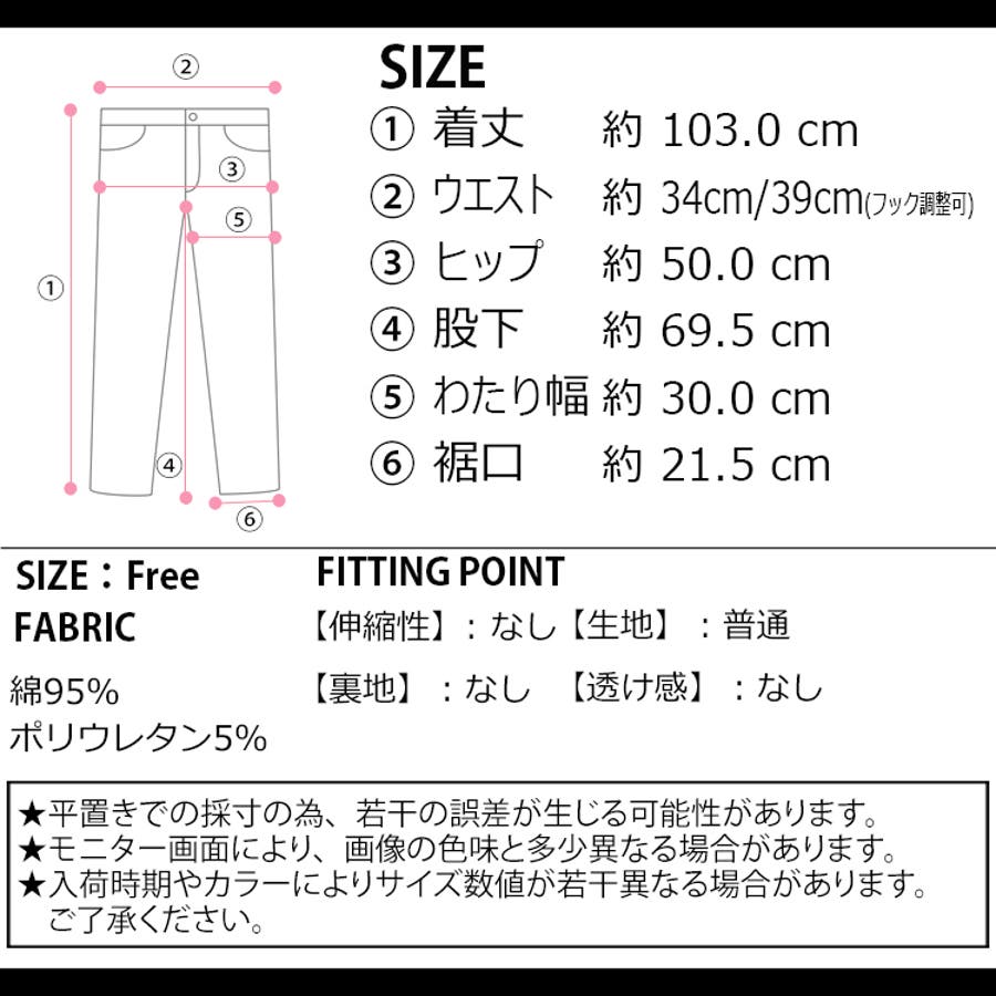 ■サイズ:着丈103cm ウエスト調節前34cm/調節後39cm(フック調整可) ヒップ50cm 股下69.5cm わたり30cm 裾幅21.5cm