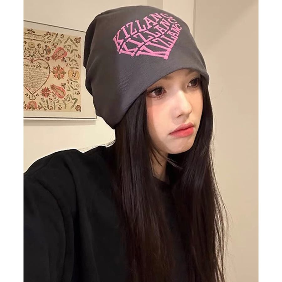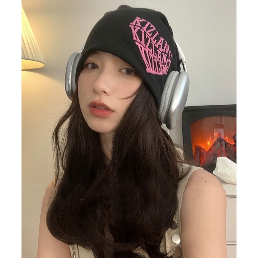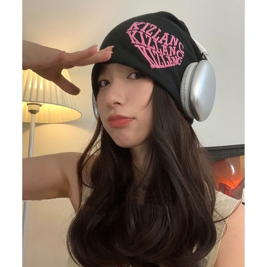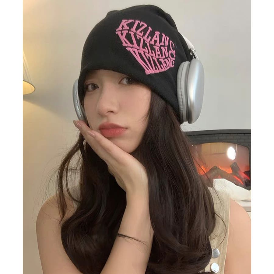 ピンクの英字ロゴとニット帽の色が