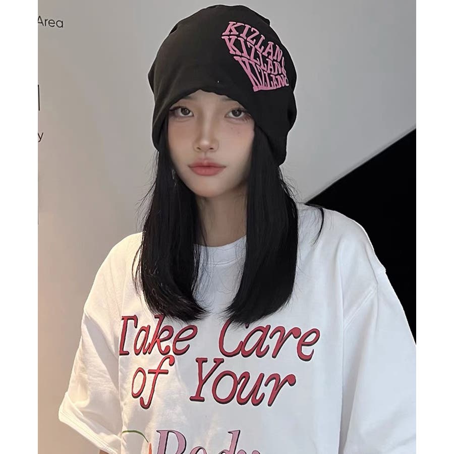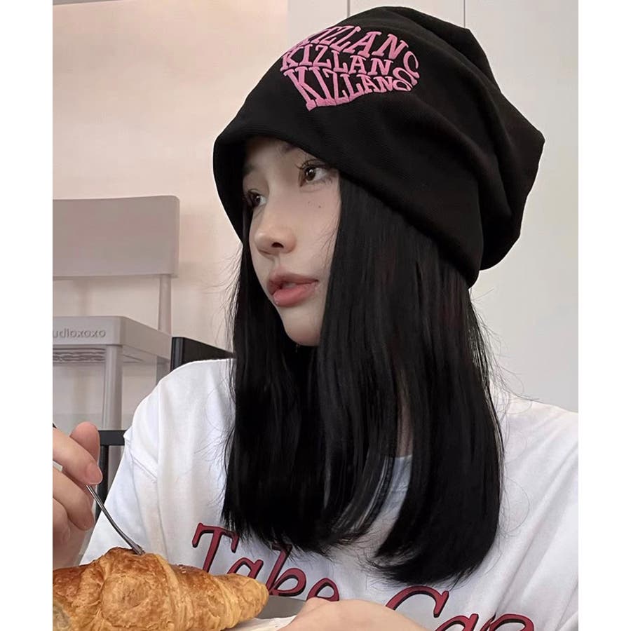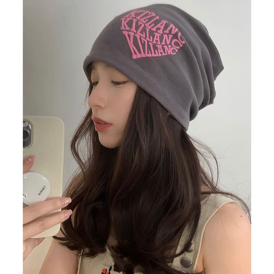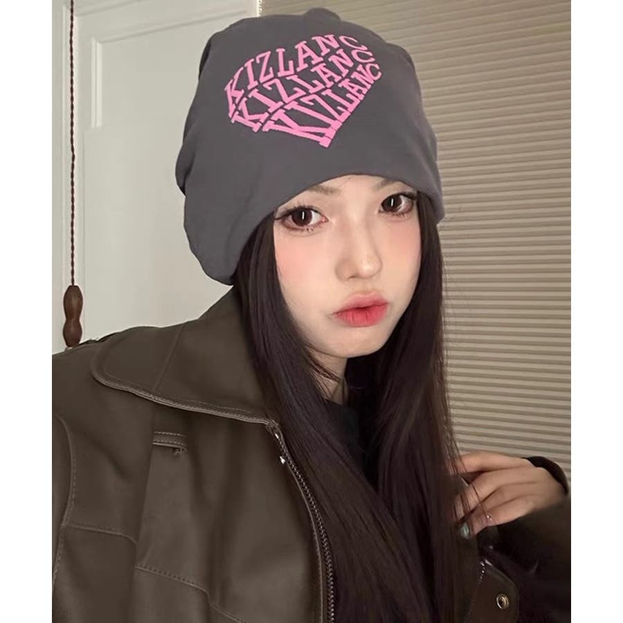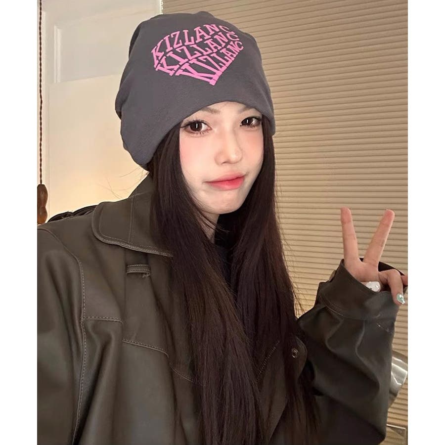 ピンクの英字ロゴとニット帽の色が