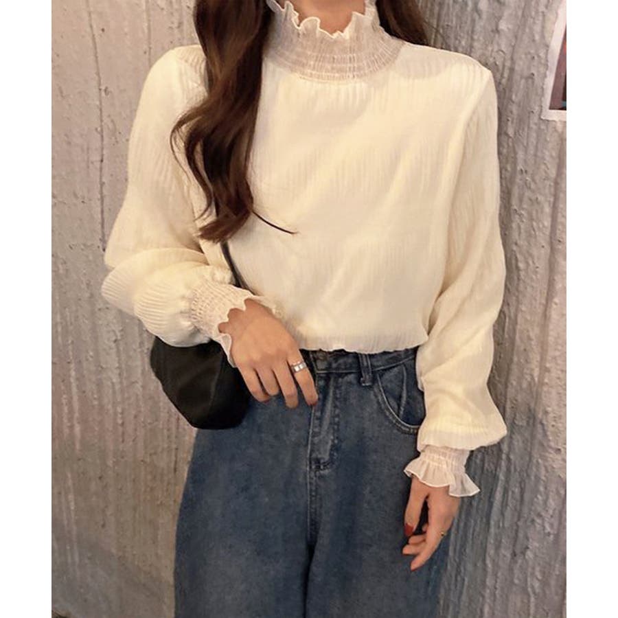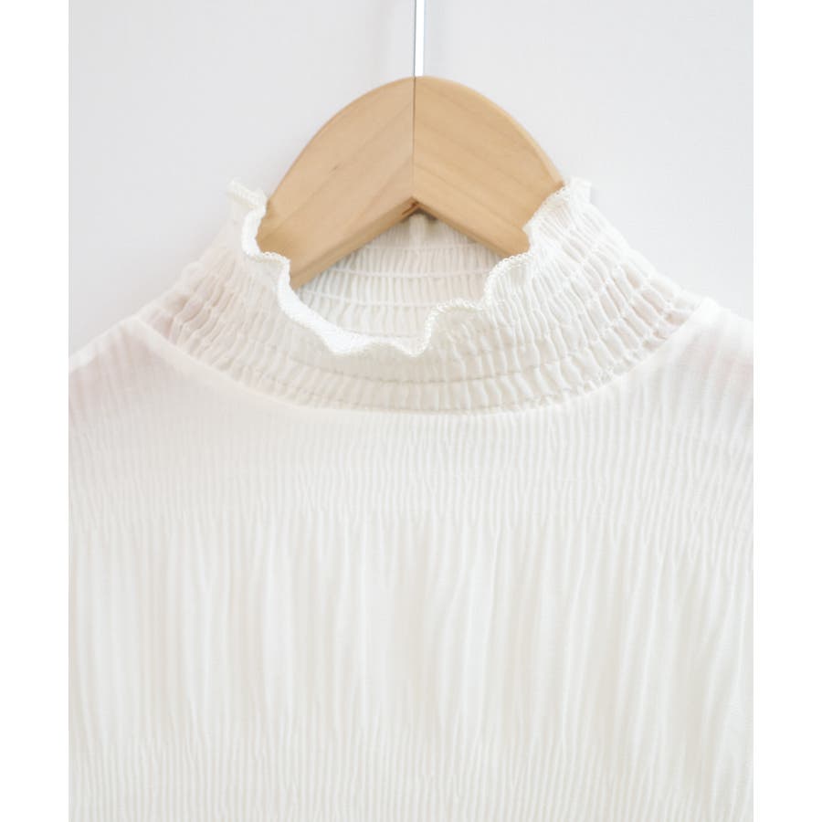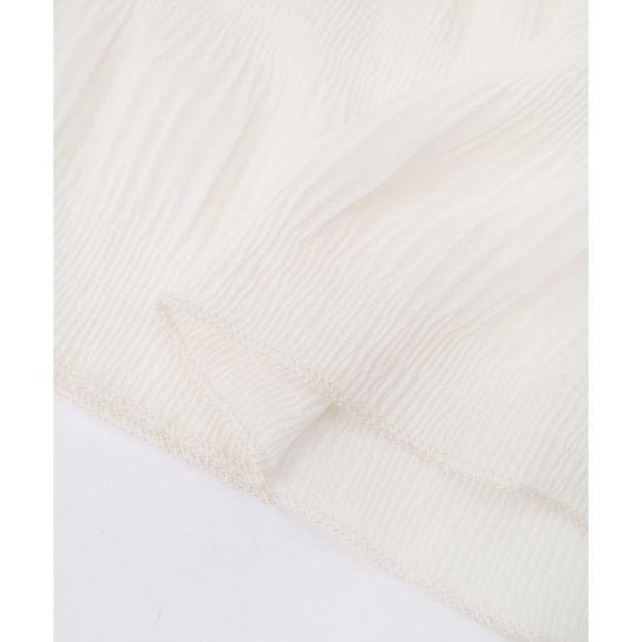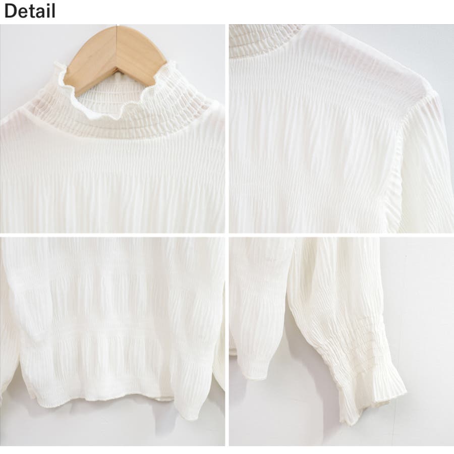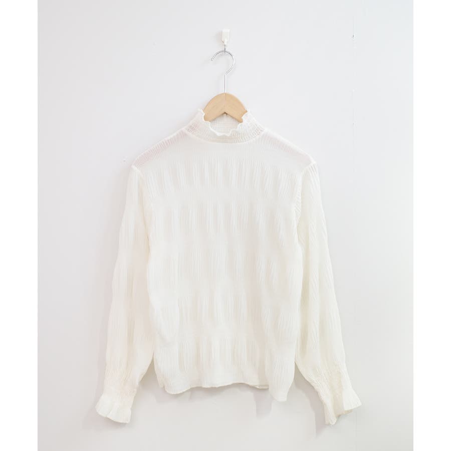 透け感のある細かなシャーリングが大人感を引き立てるブラウス。