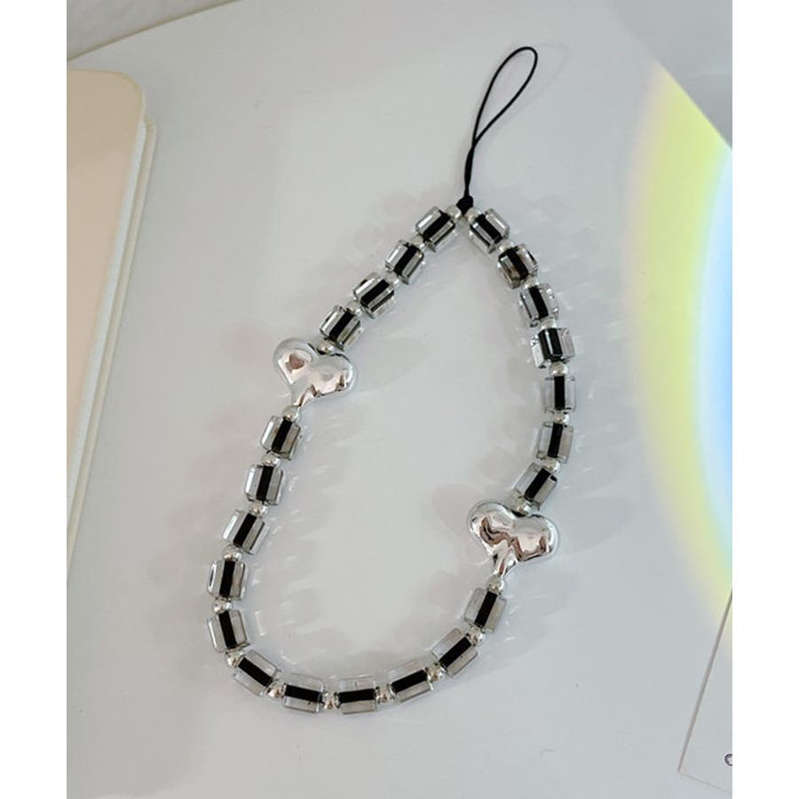 クリアビーズ×シルバーのハートモチーフがかわいいストラップ付。