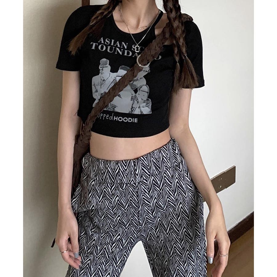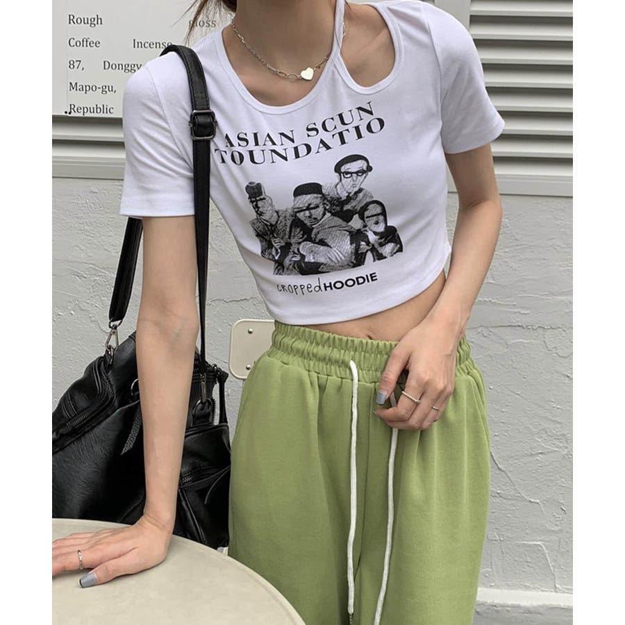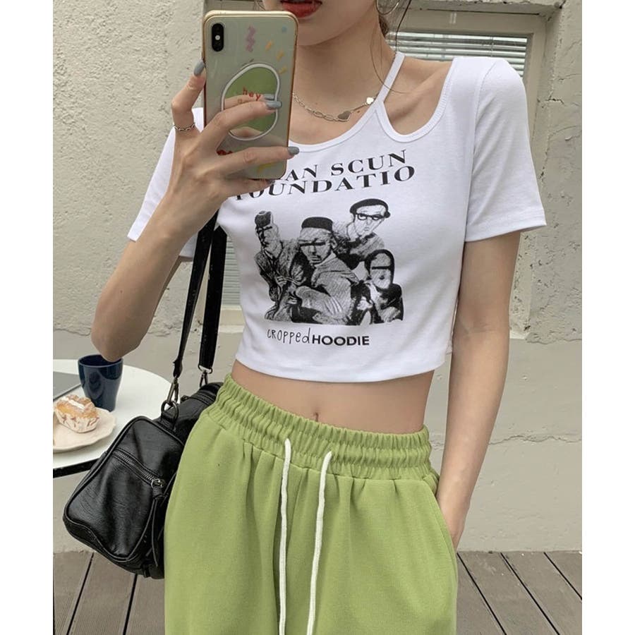 春新作 ショルダーカットアウト ショート丈チビTシャツ