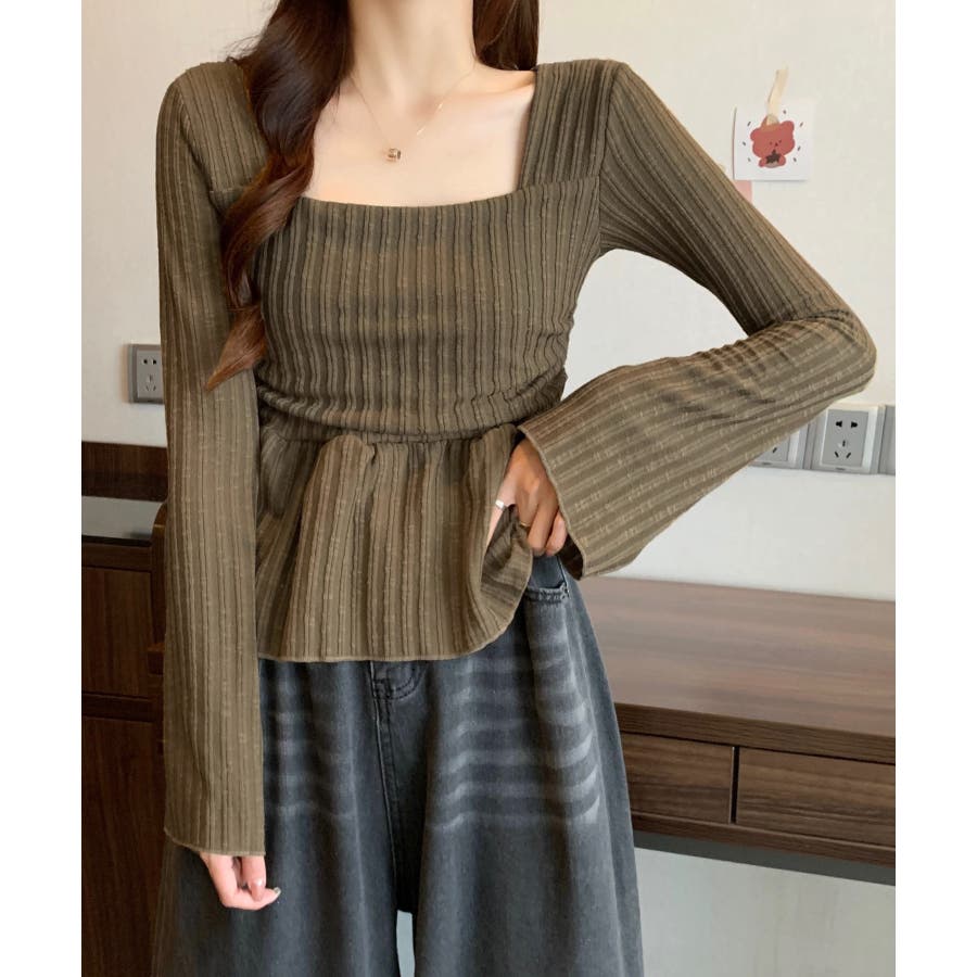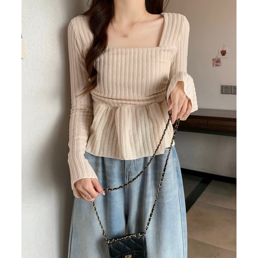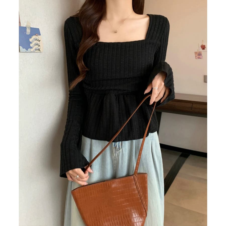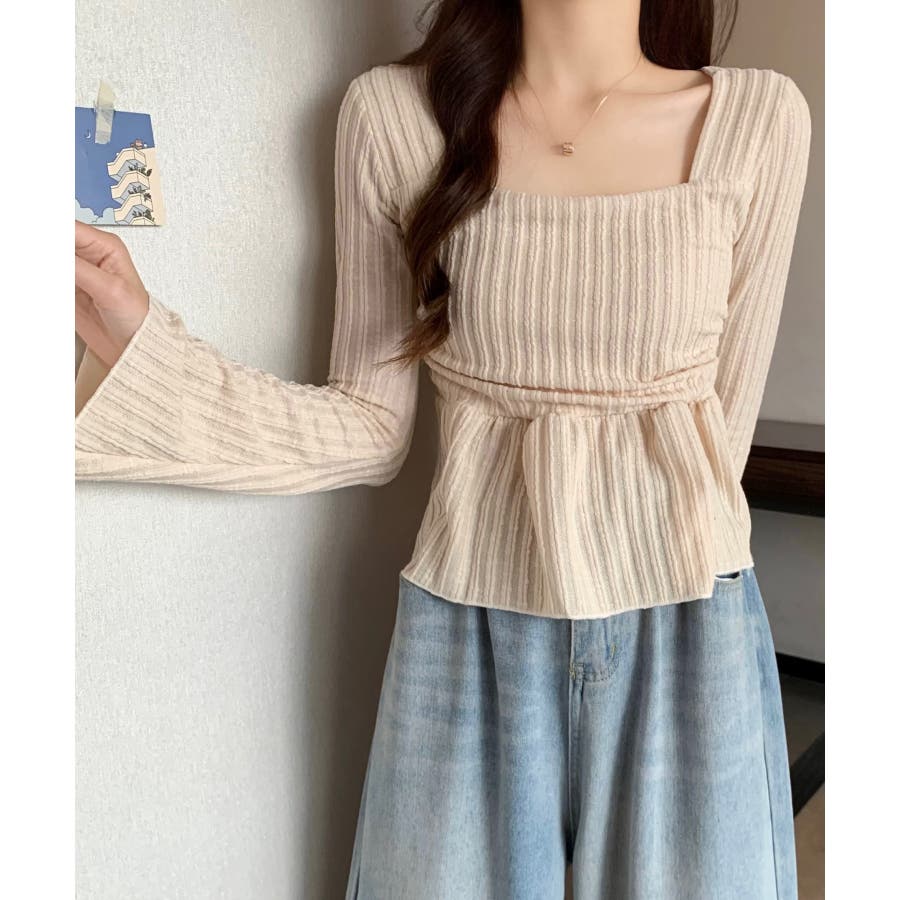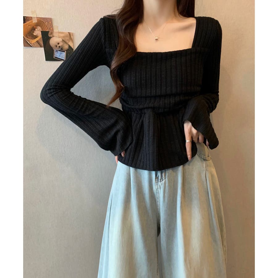深めのスクエアネックがデコルテを綺麗に