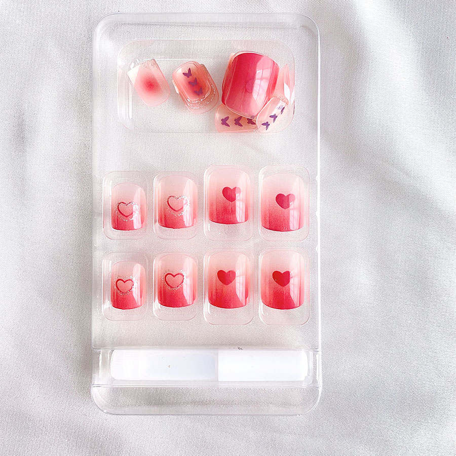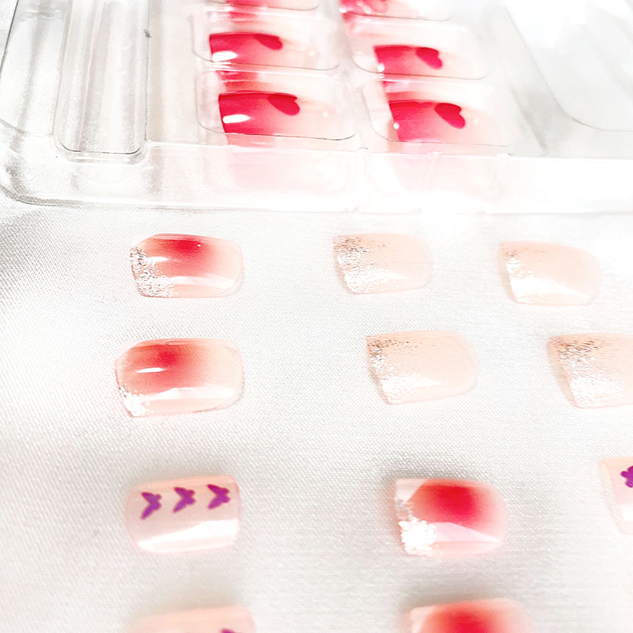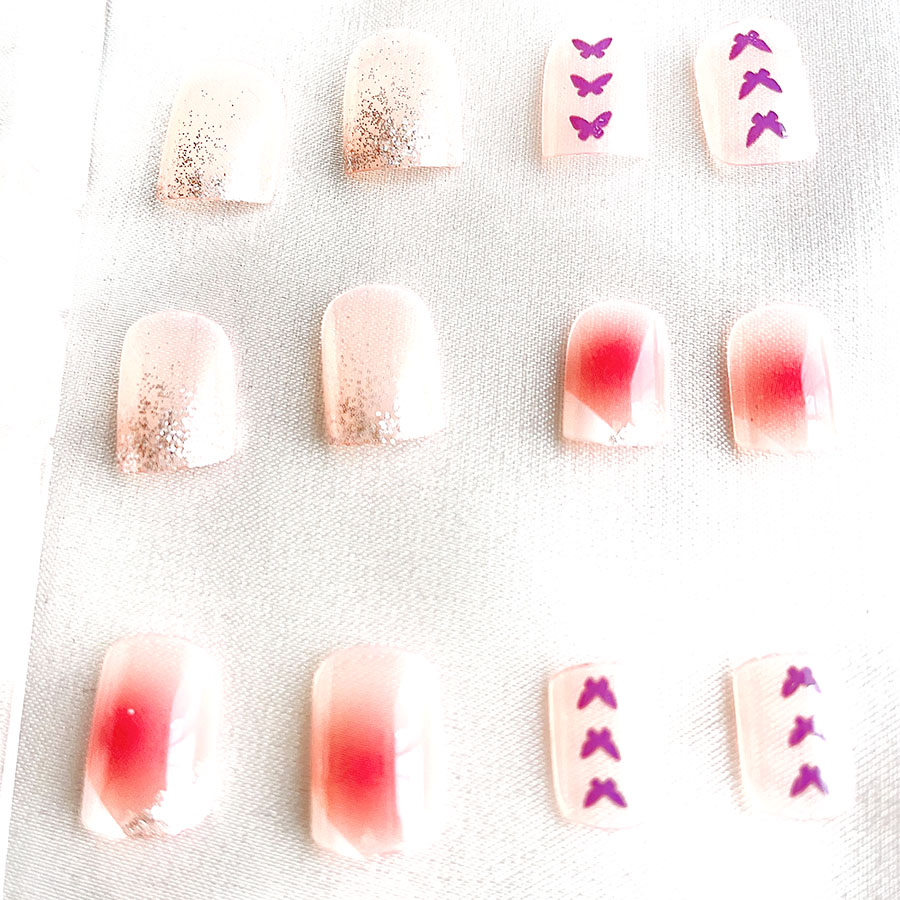 いろんなサイズが2枚ずつ入ってるから自分の爪にぴったり合わせることができます。デザインも可愛いいです。ただ、接着剤が爪にしっかり残るのは×。付属の接着剤は使わない方がいいです。接着力は落ちるけど両面テープがいいみたい。