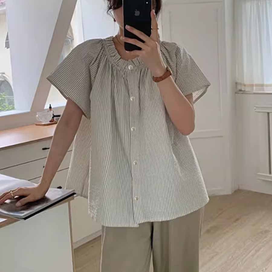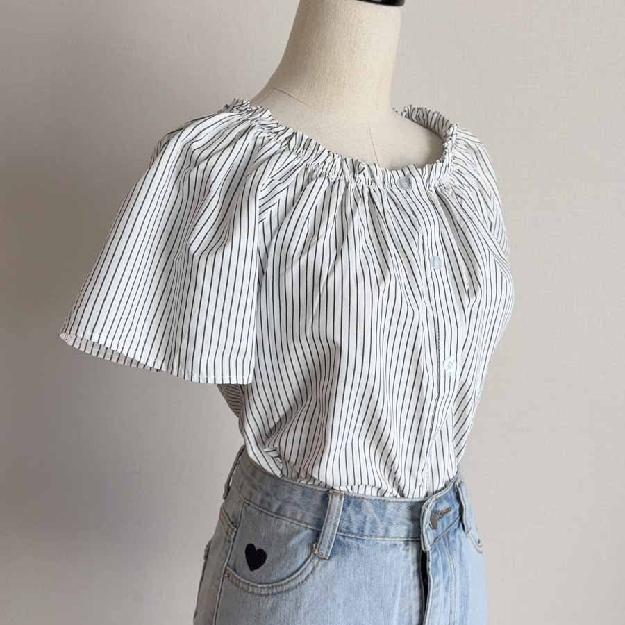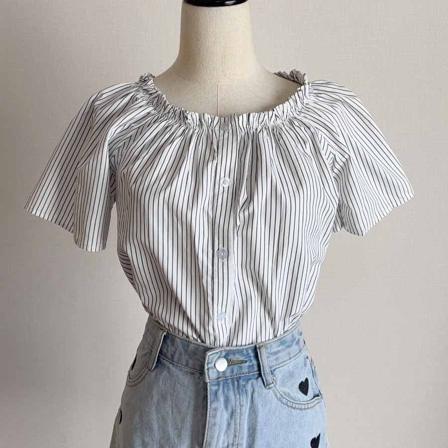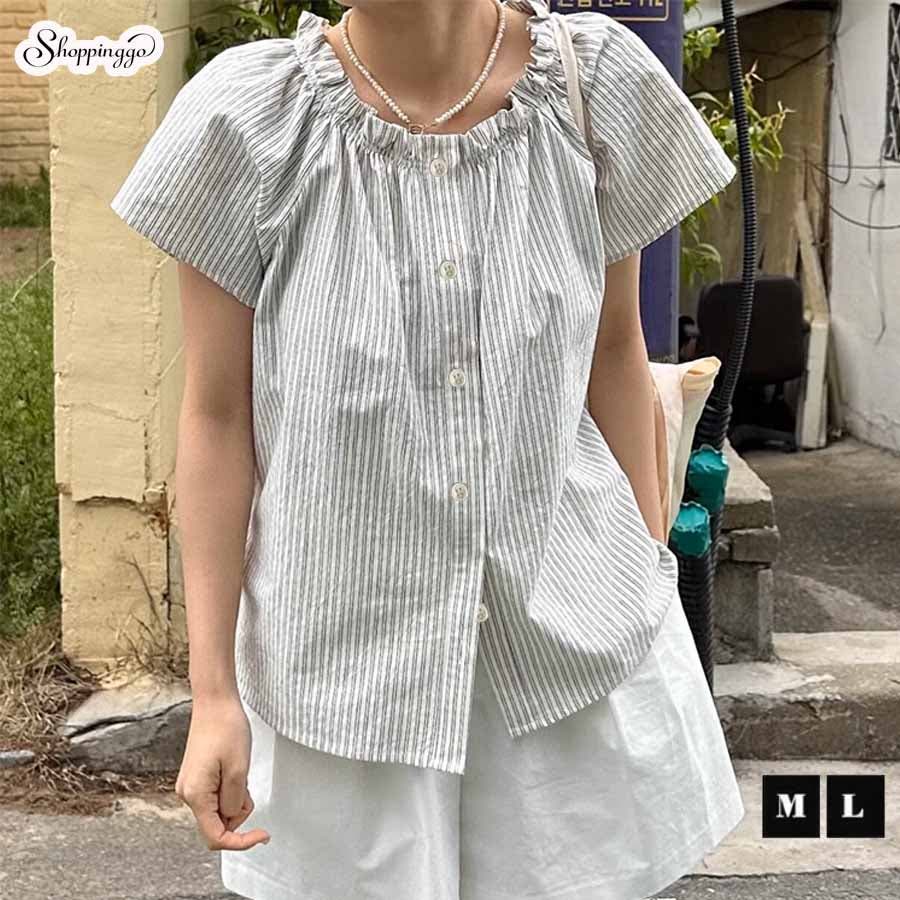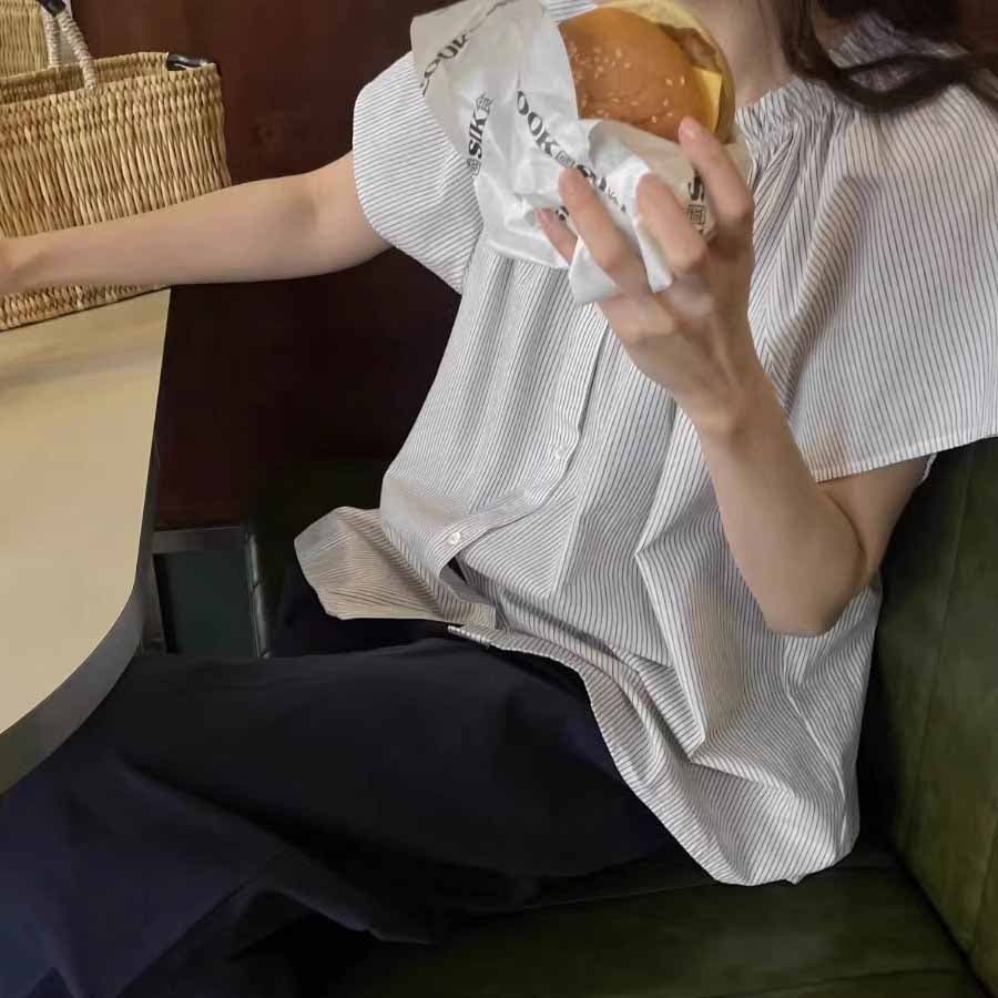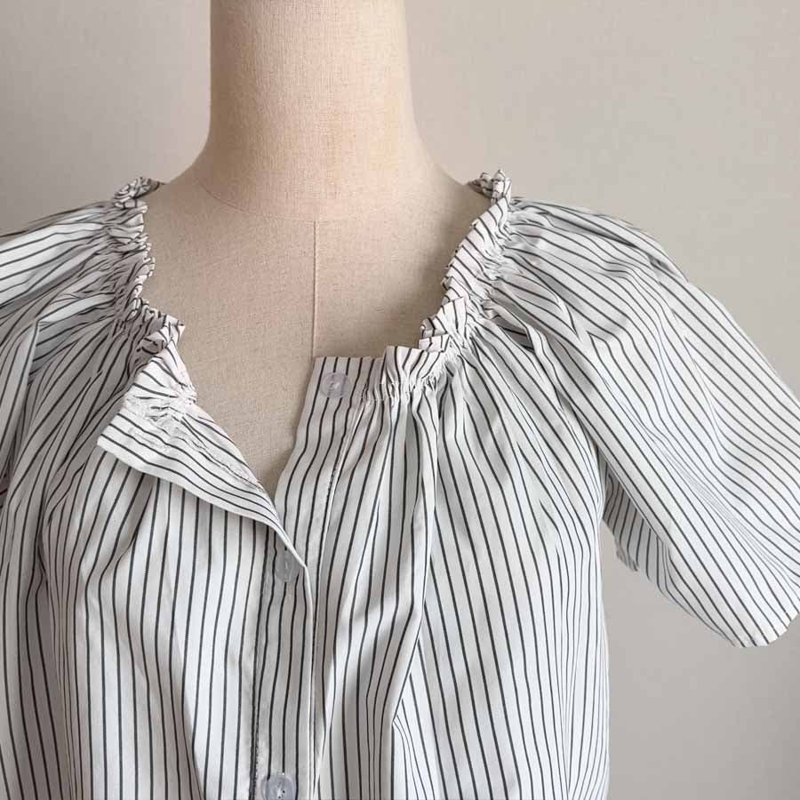 夏の季節にピッタリな前開きストライプ柄シャツブラウス。