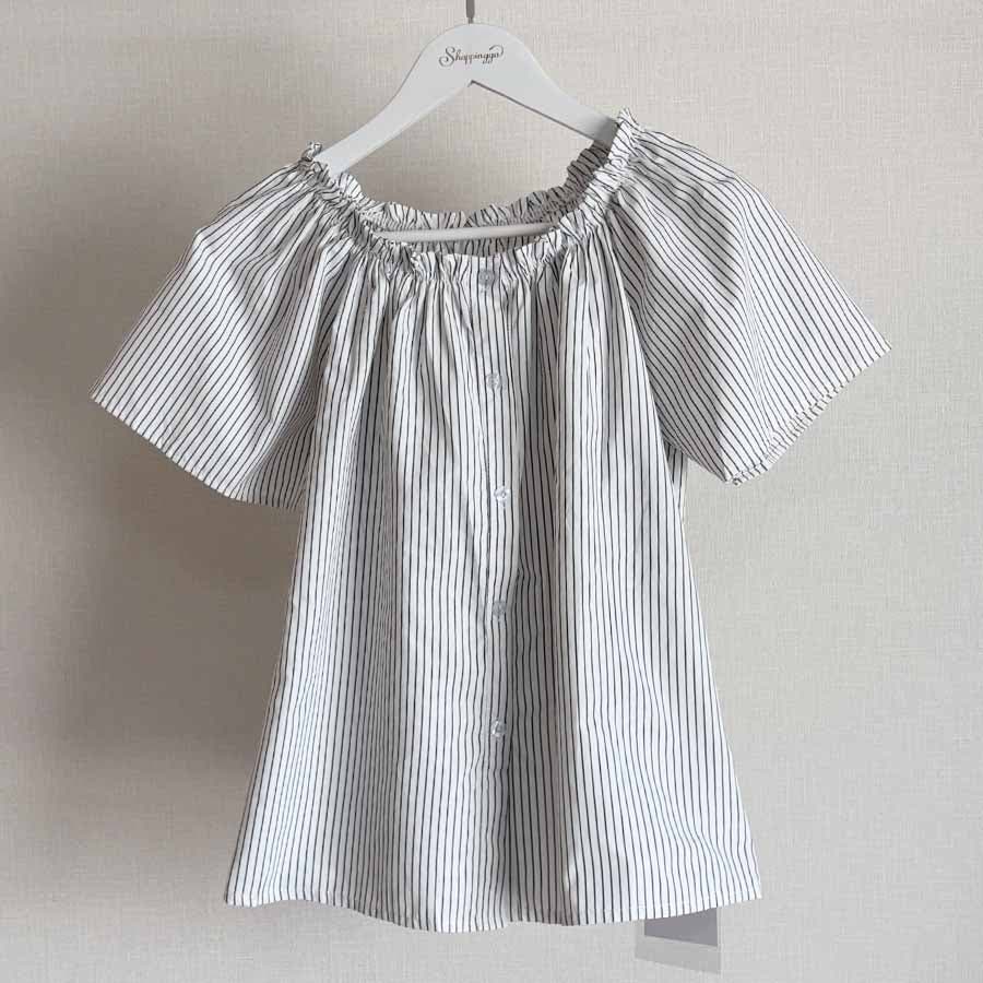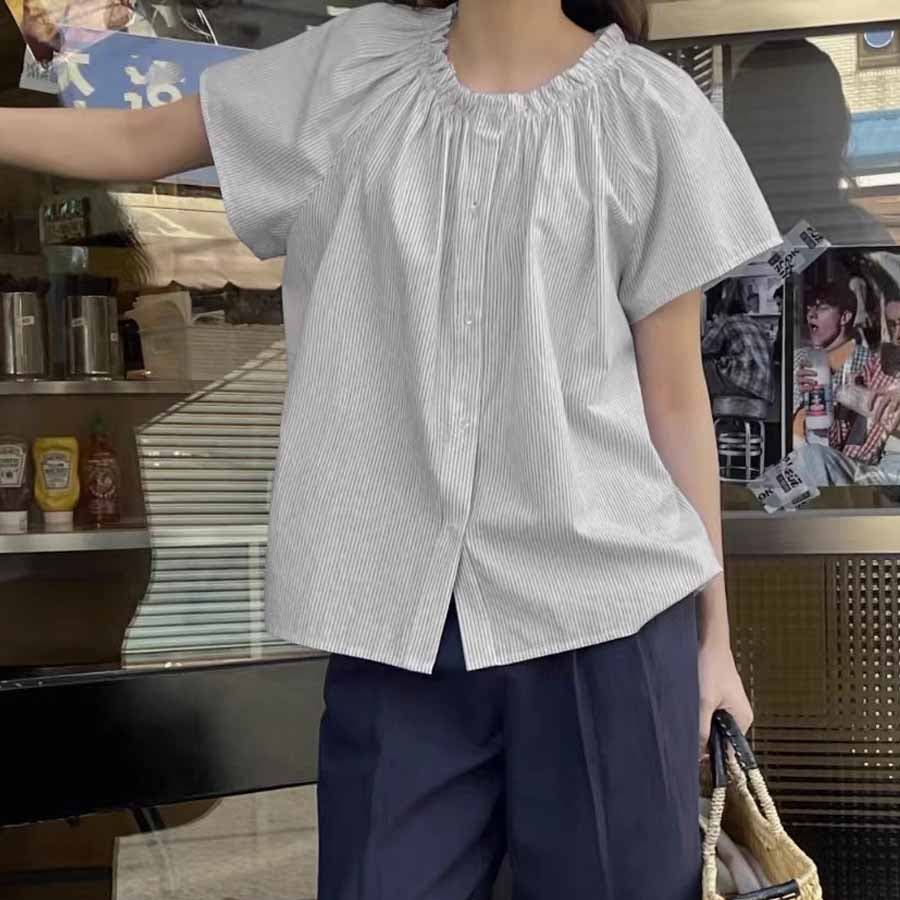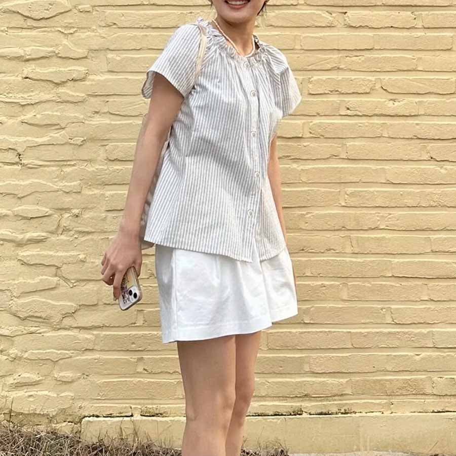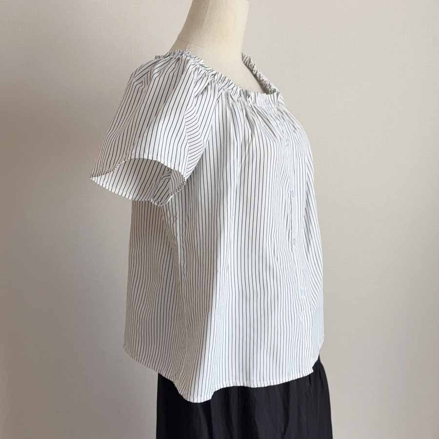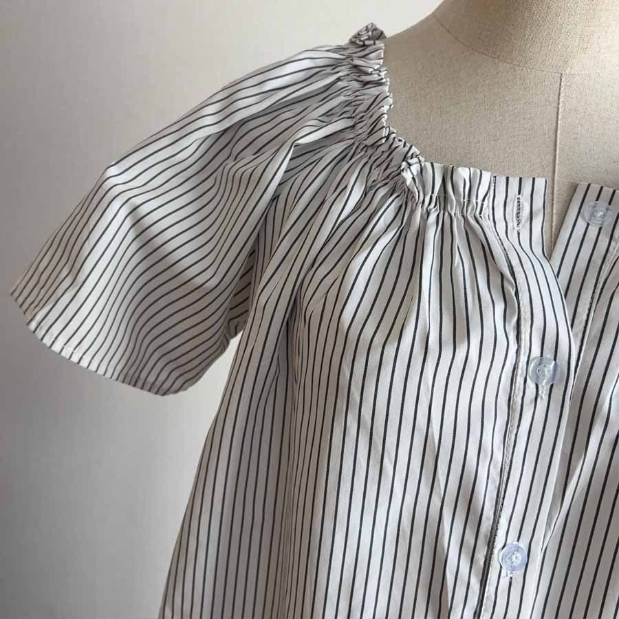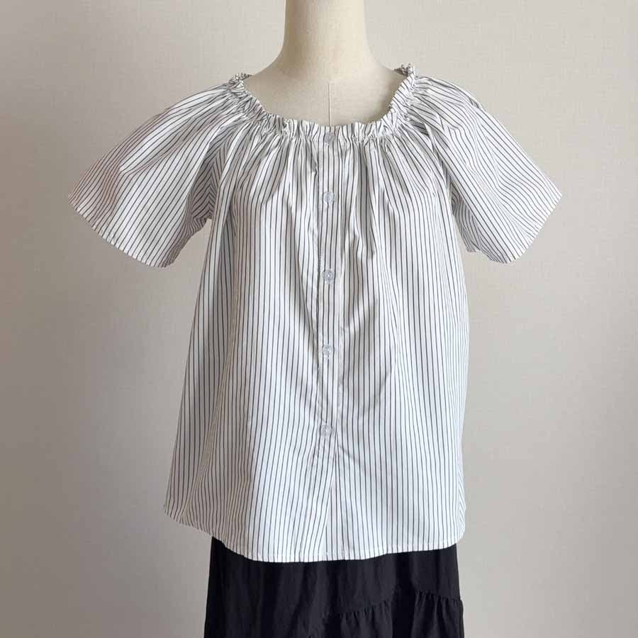 夏の季節にピッタリな前開きストライプ柄シャツブラウス。