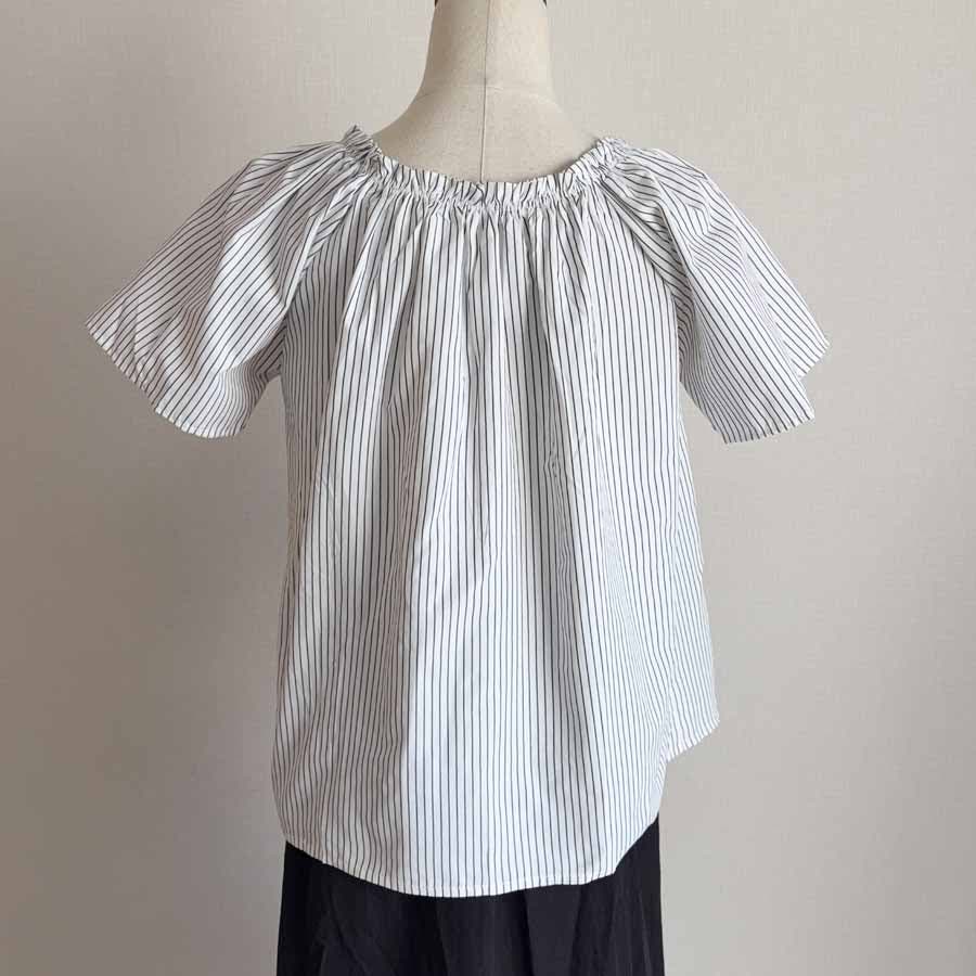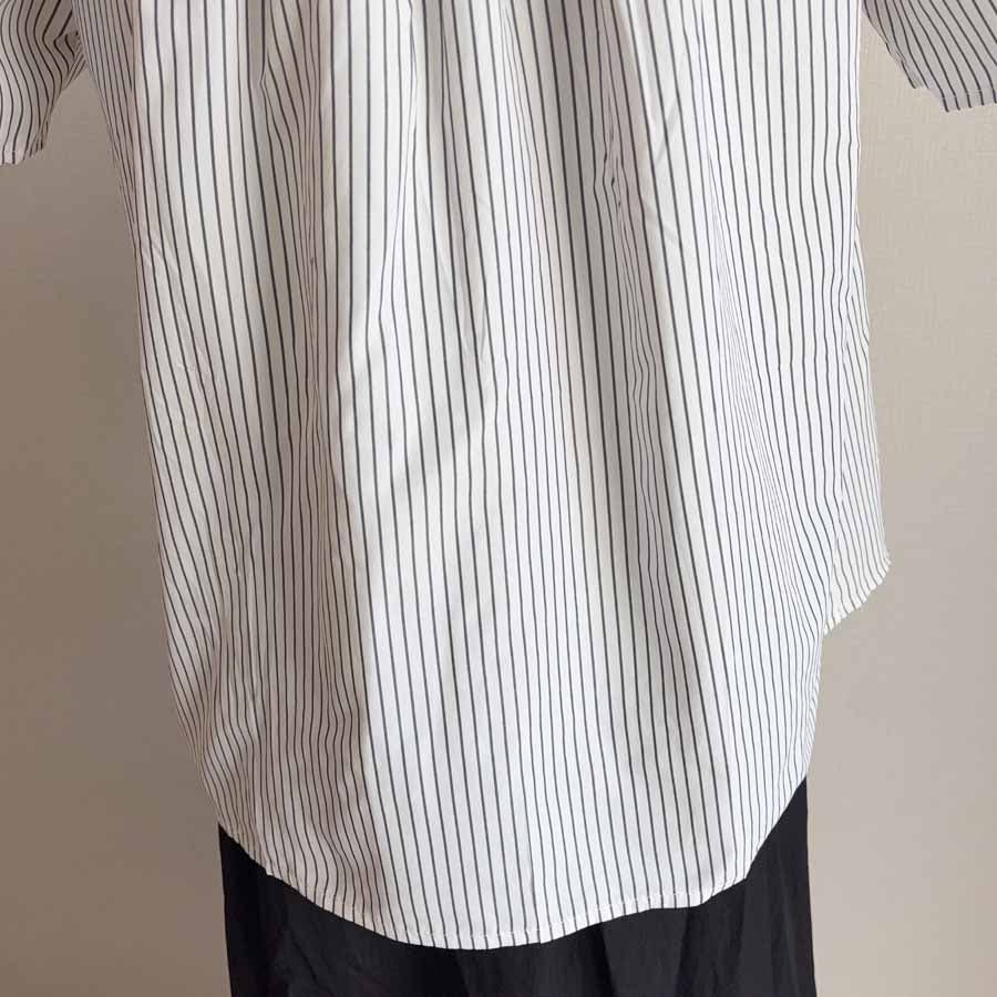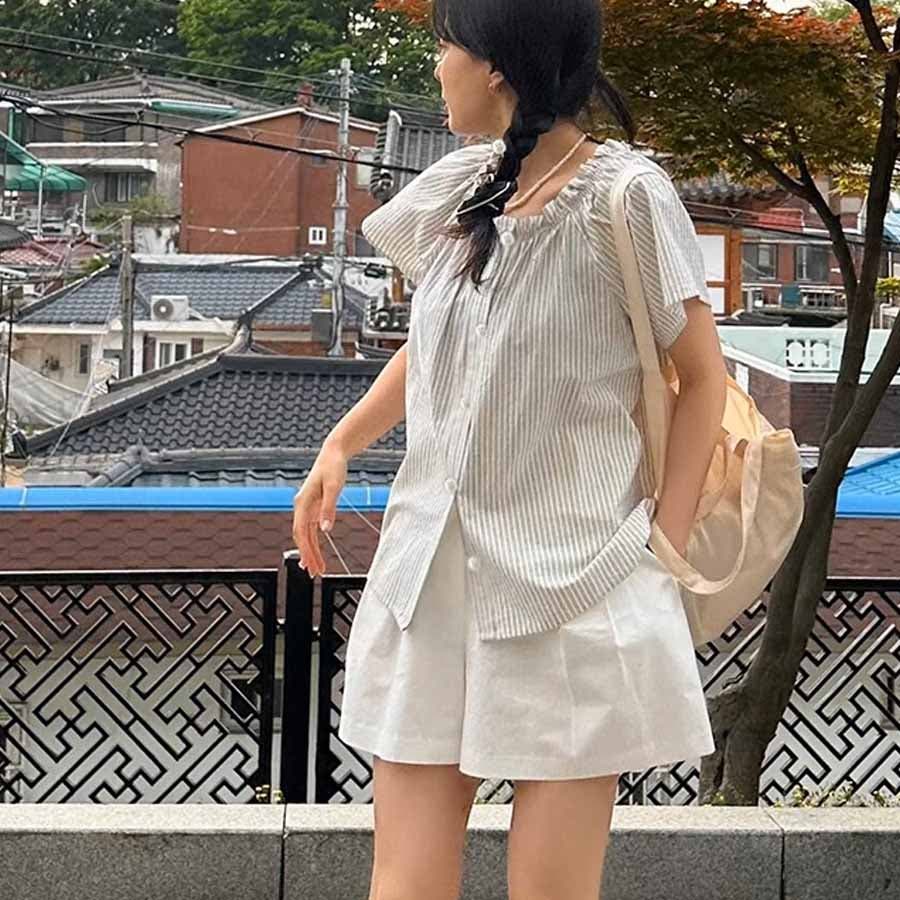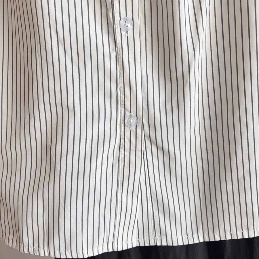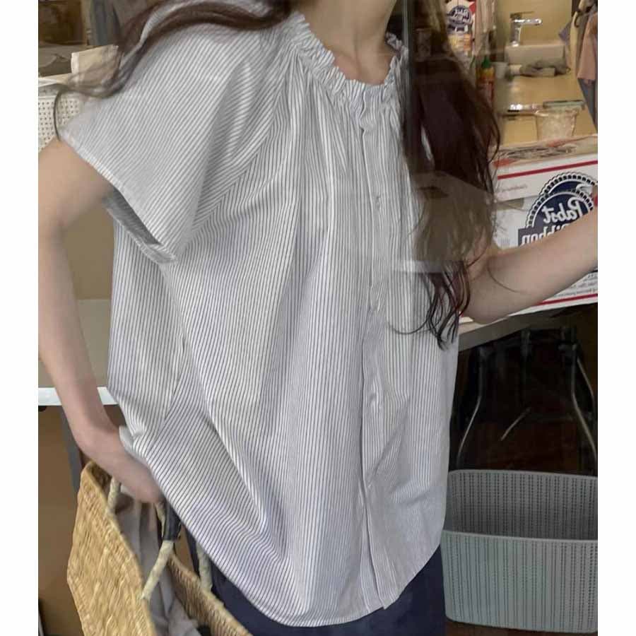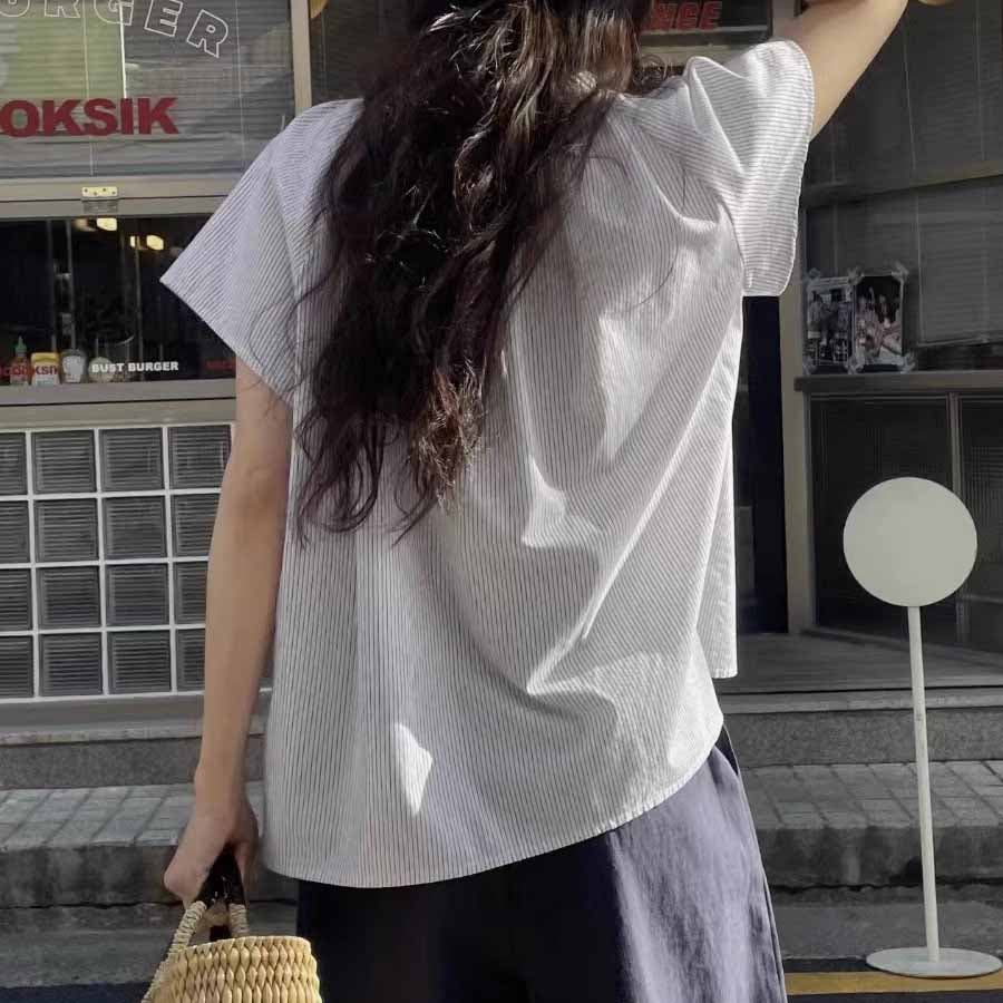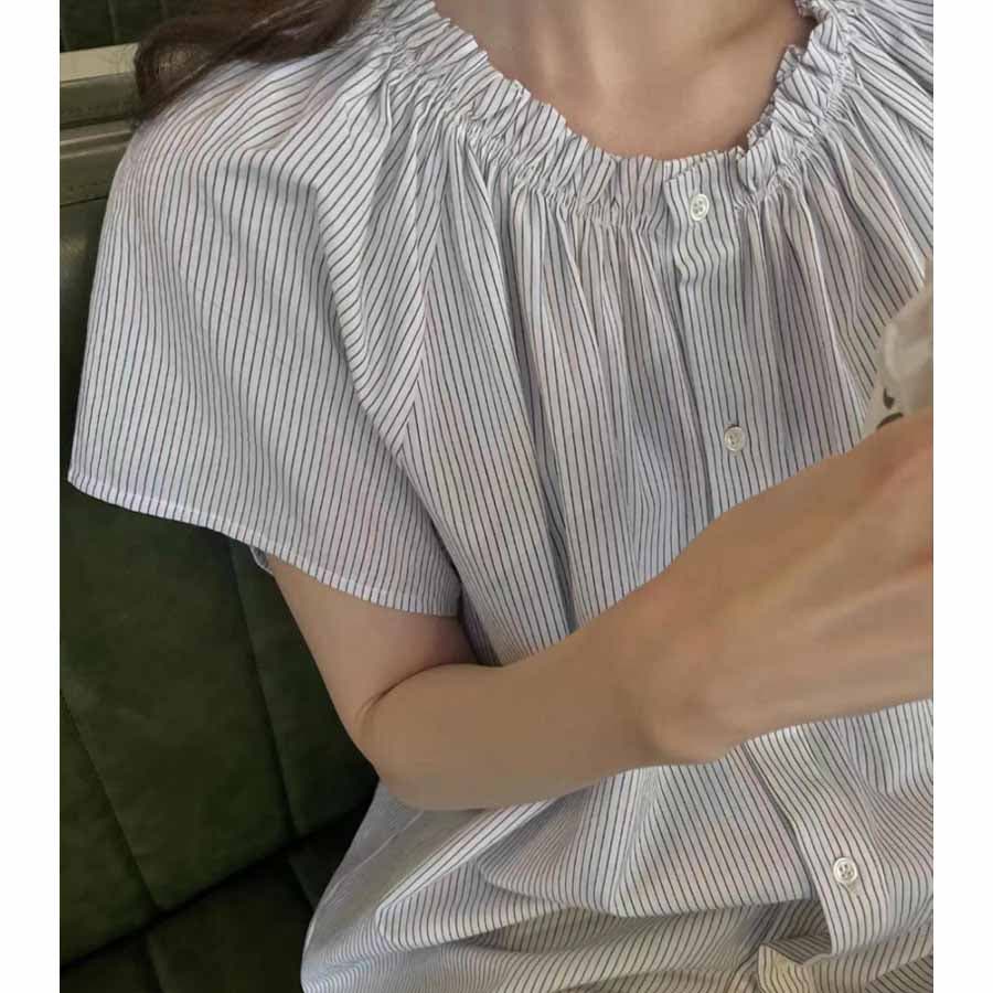 夏の季節にピッタリな前開きストライプ柄シャツブラウス。
