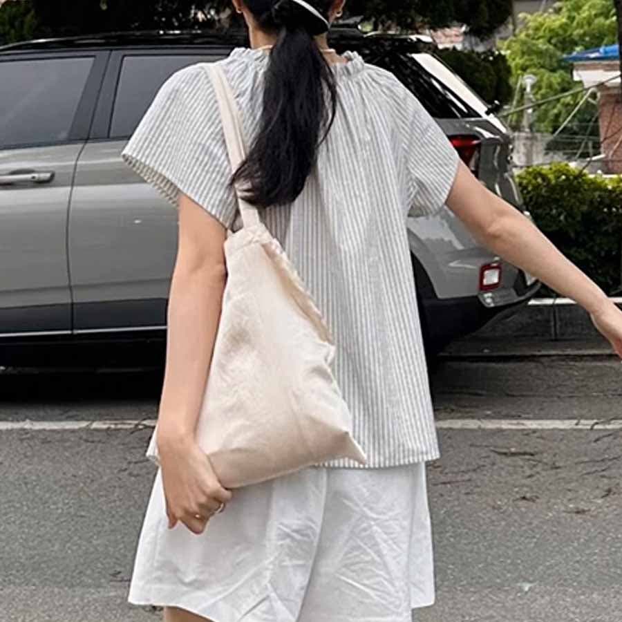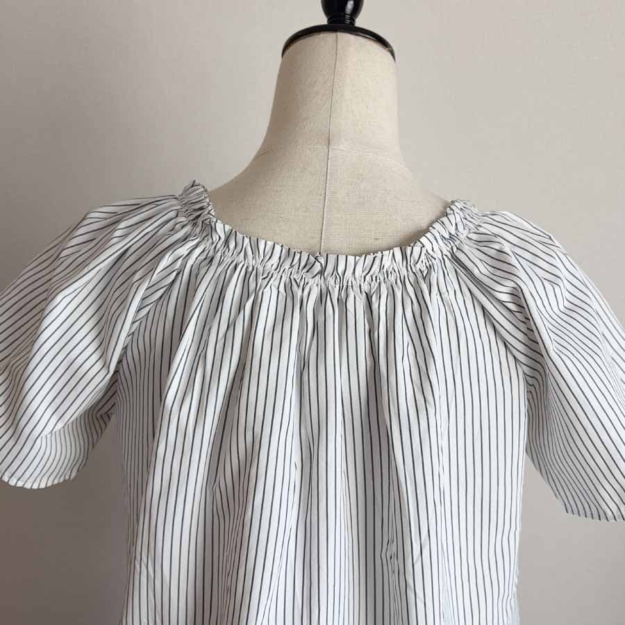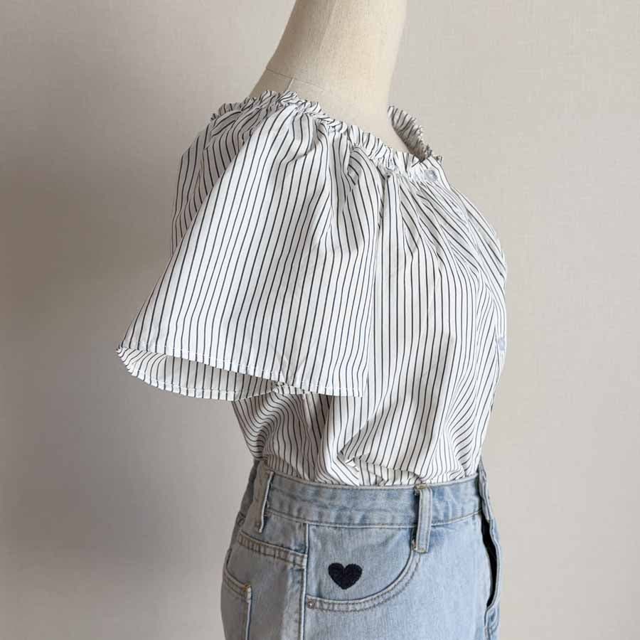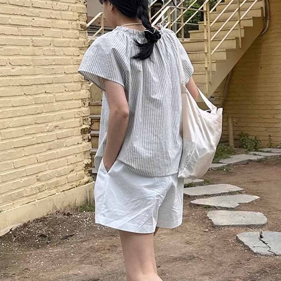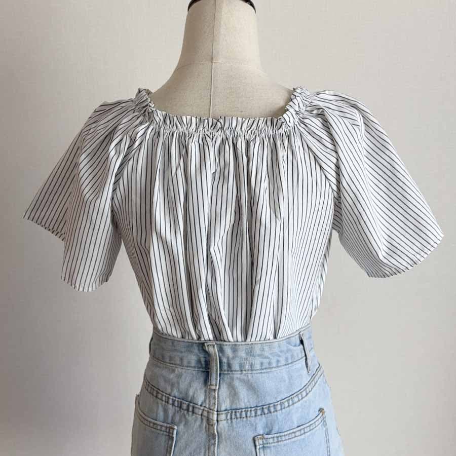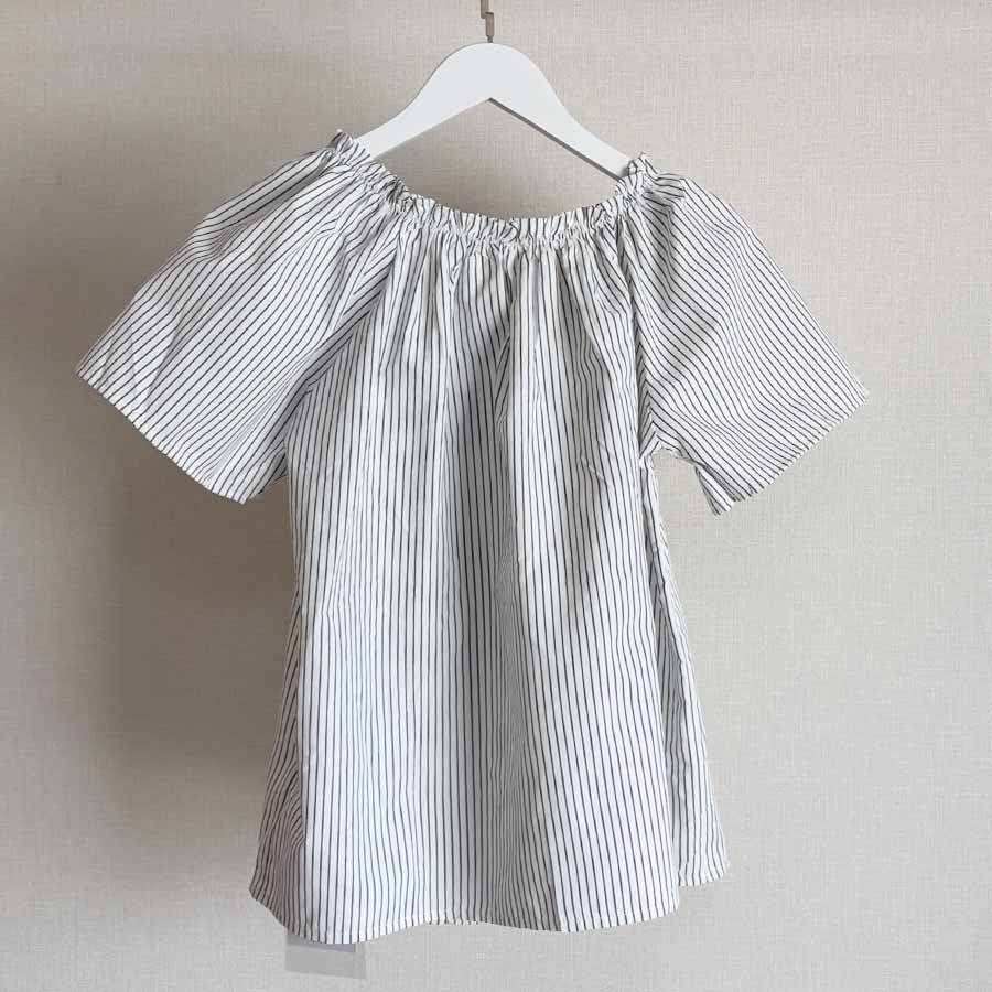 夏の季節にピッタリな前開きストライプ柄シャツブラウス。