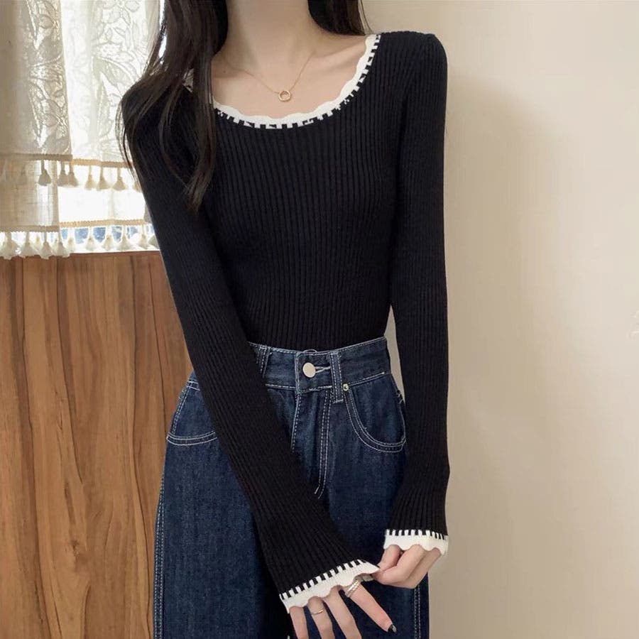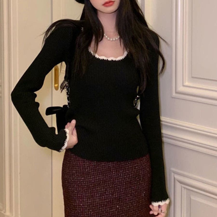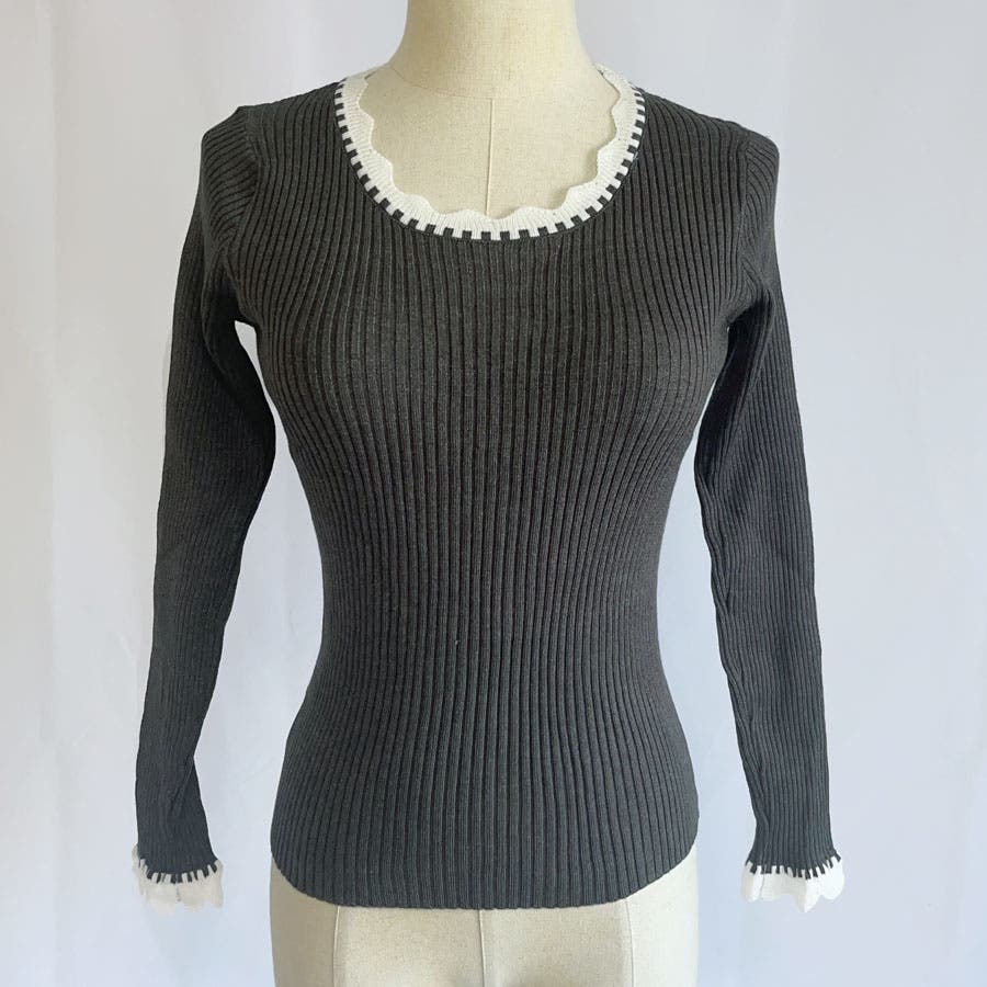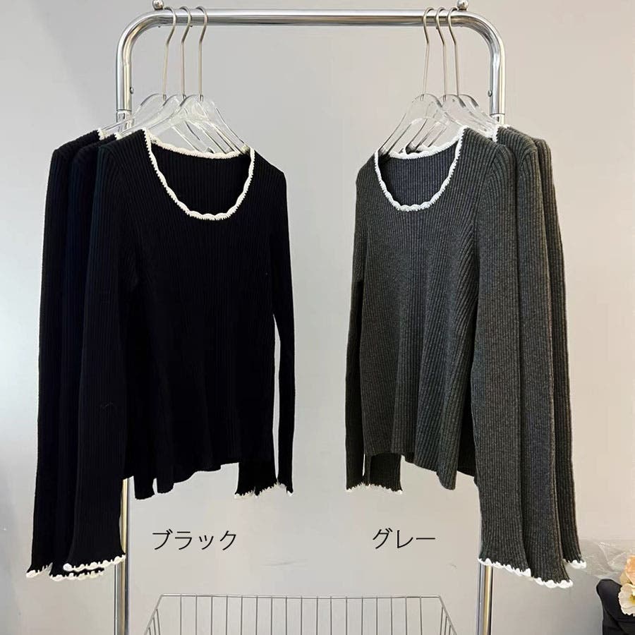 首元と袖口のバイカラーがデザインポイントのニットトップス。