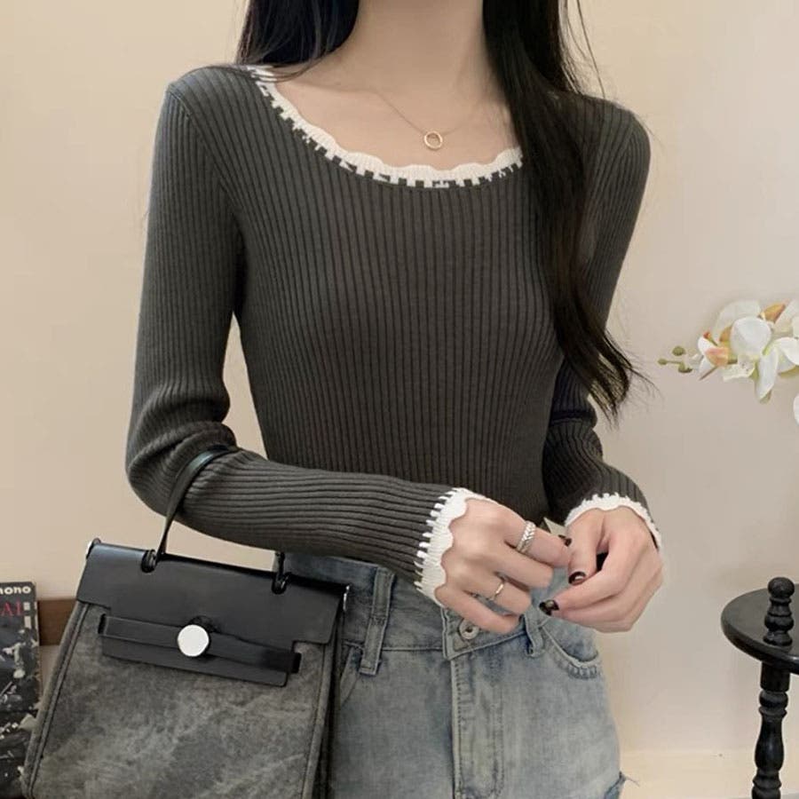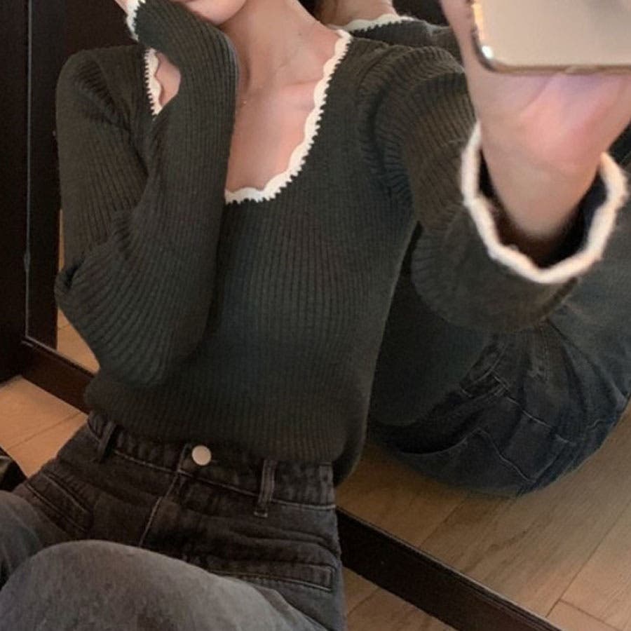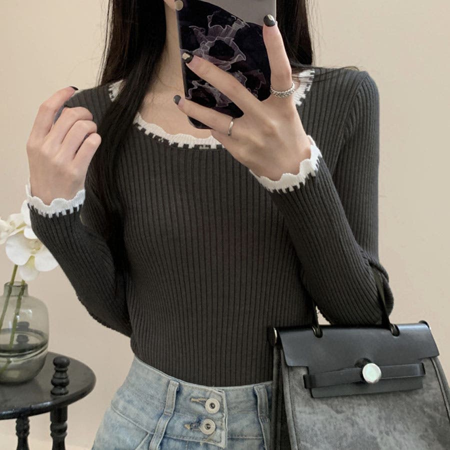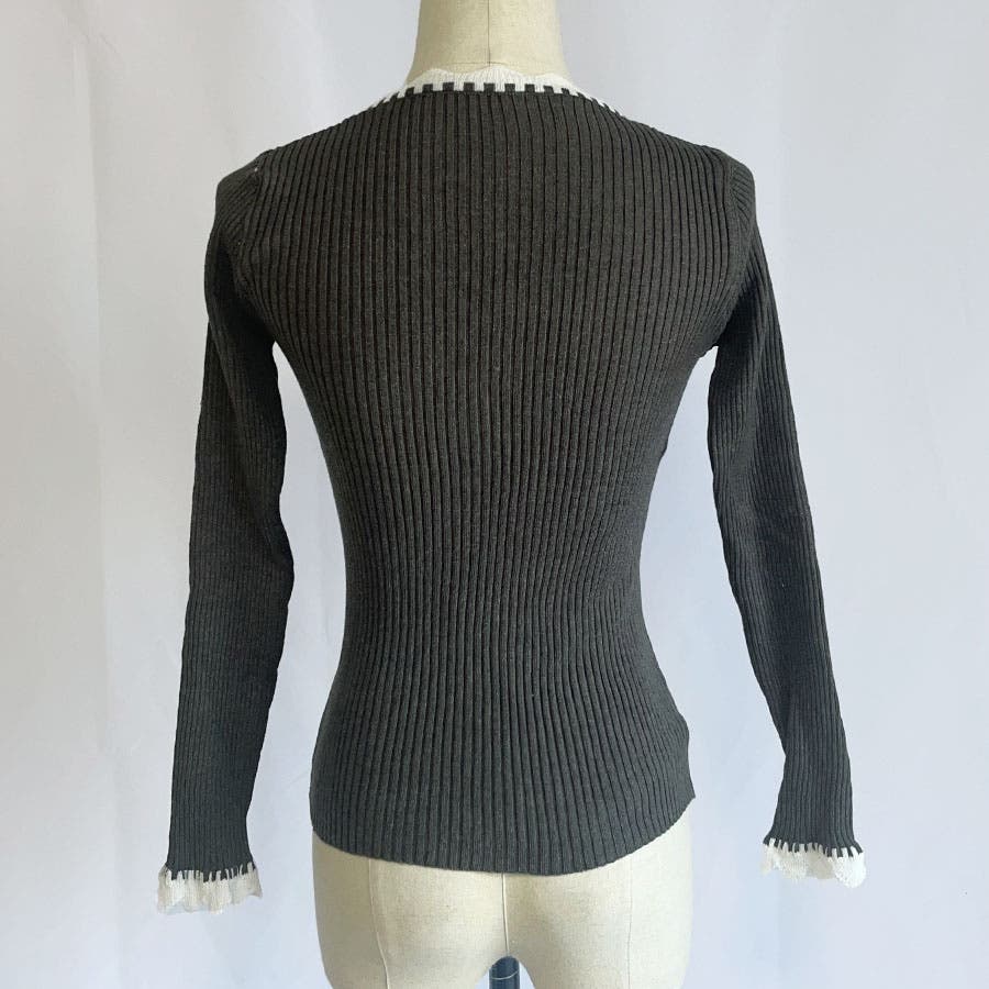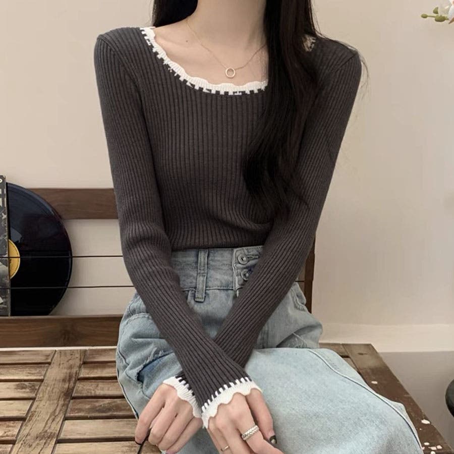首元と袖口のバイカラーがデザインポイントのニットトップス。