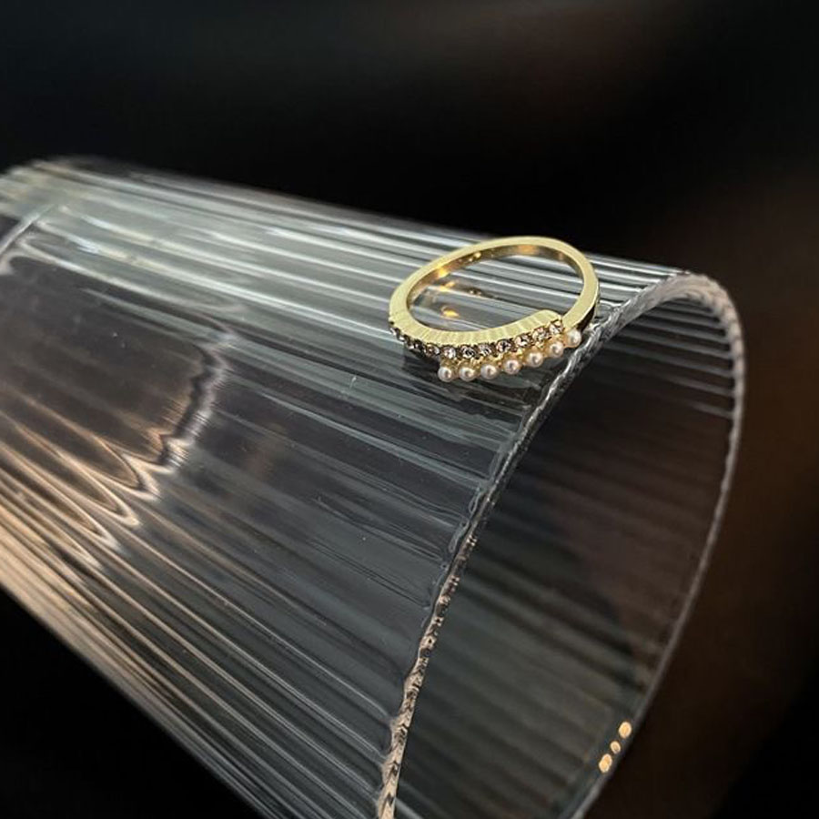 サイズ調節可能商品みたいなのですが、調節するとラインストーンとパールが平行でなくなってしまいます。