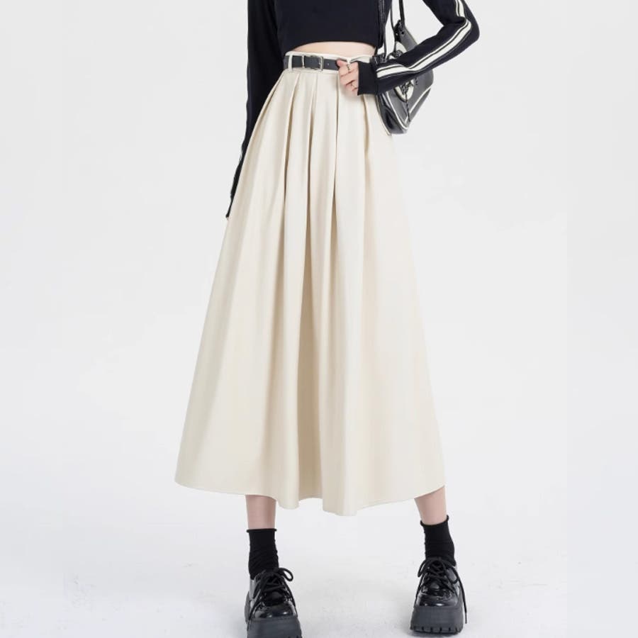 ハイウエストのロング丈なので、コンパクトトップスともボリュームのあるトップスとも相性抜群。