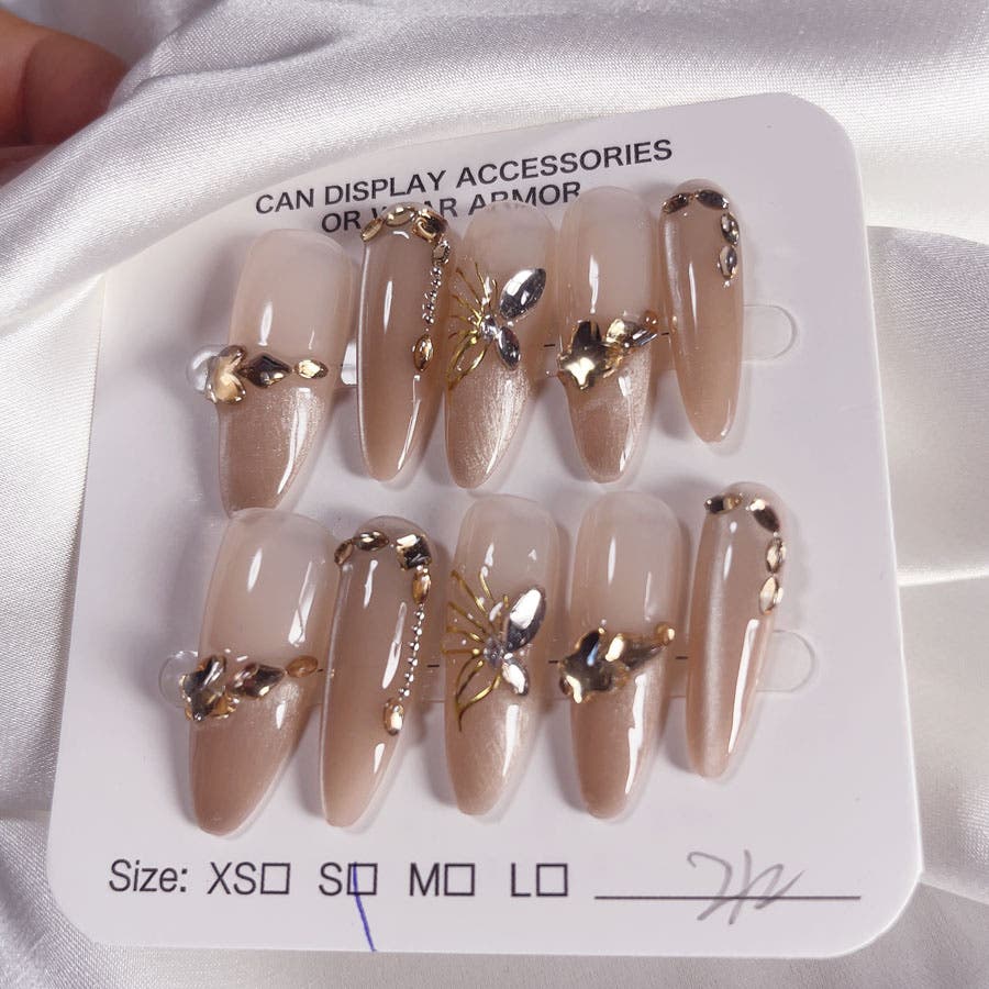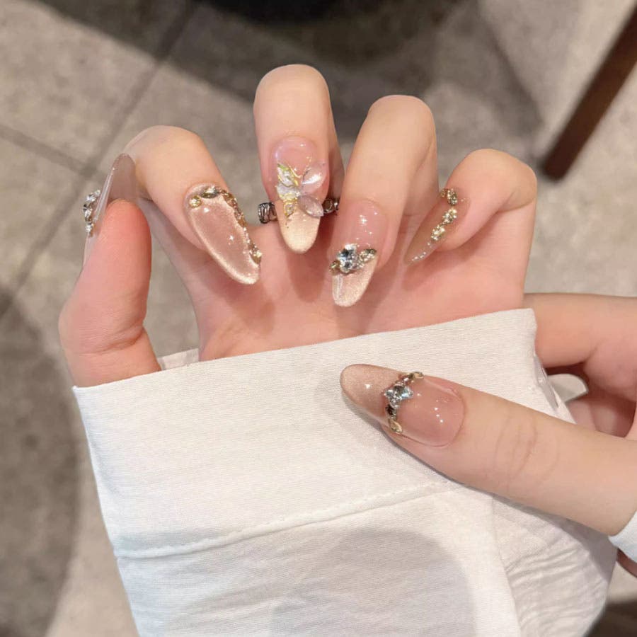 ネイルチップを爪の根本に合わせ、先端に向けて傾けるように貼れば完成です。