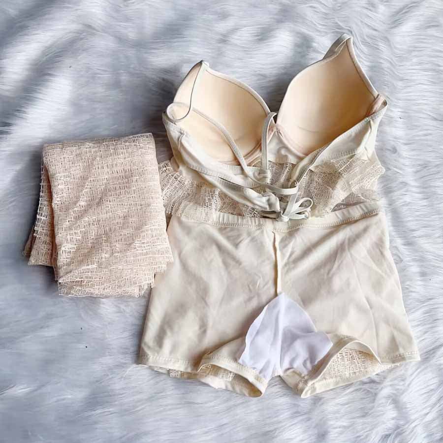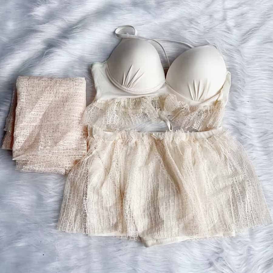 大判のパレオ付きで日焼け対策や体型カバーにも使える。