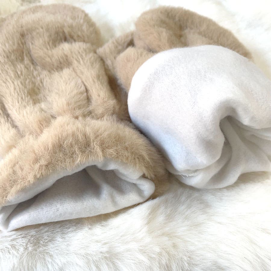 ファーは手袋の表面にたっぷりついているので冷たい風を通しにくく、内側は柔らかい起毛生地になっています。