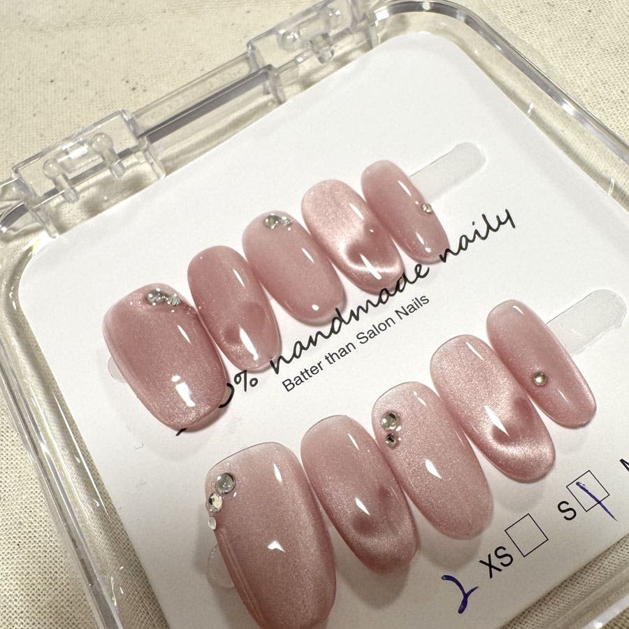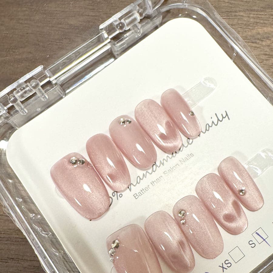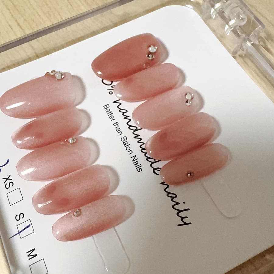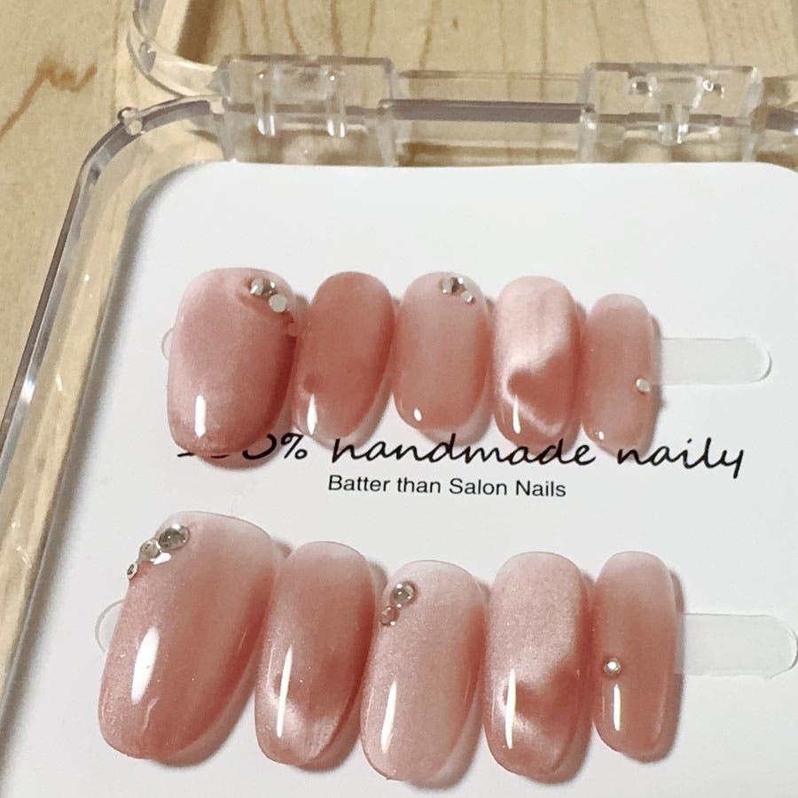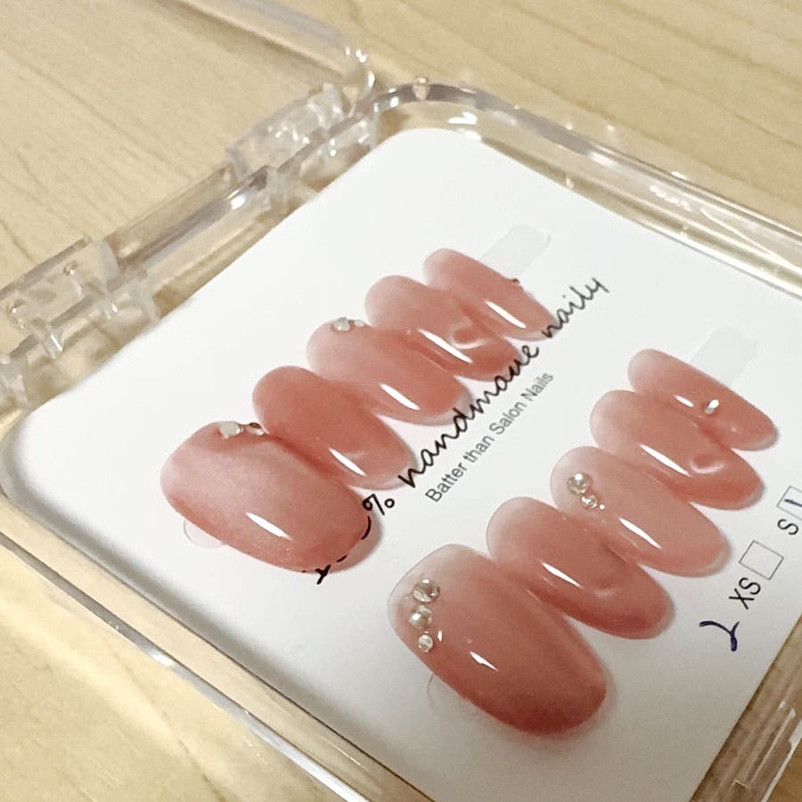 ネイルチップを爪の根本に合わせ、先端に向けて傾けるように貼れば完成です。