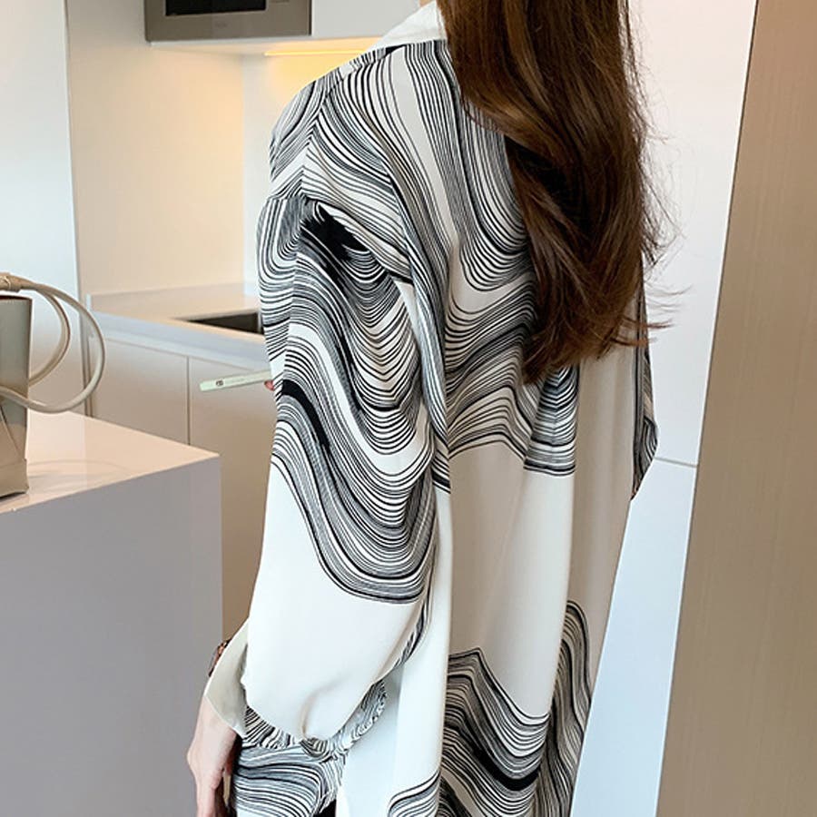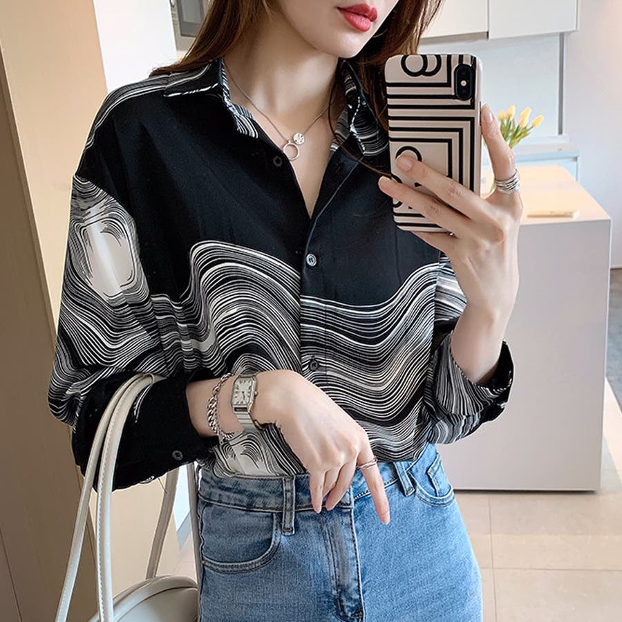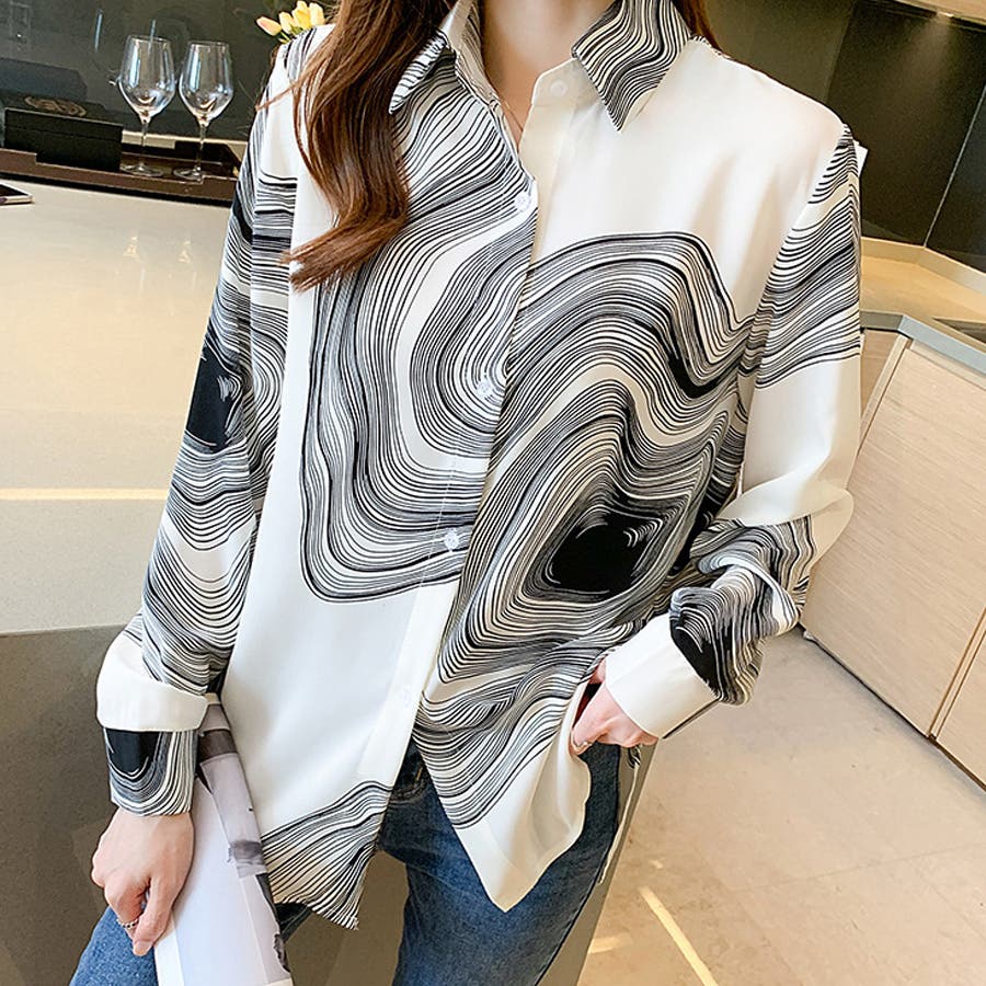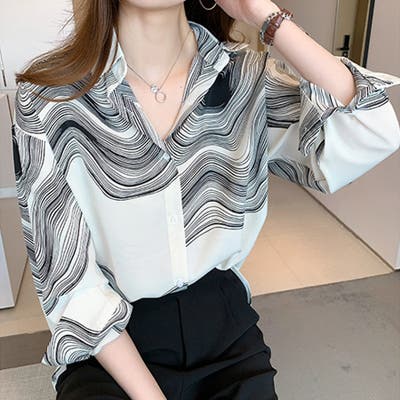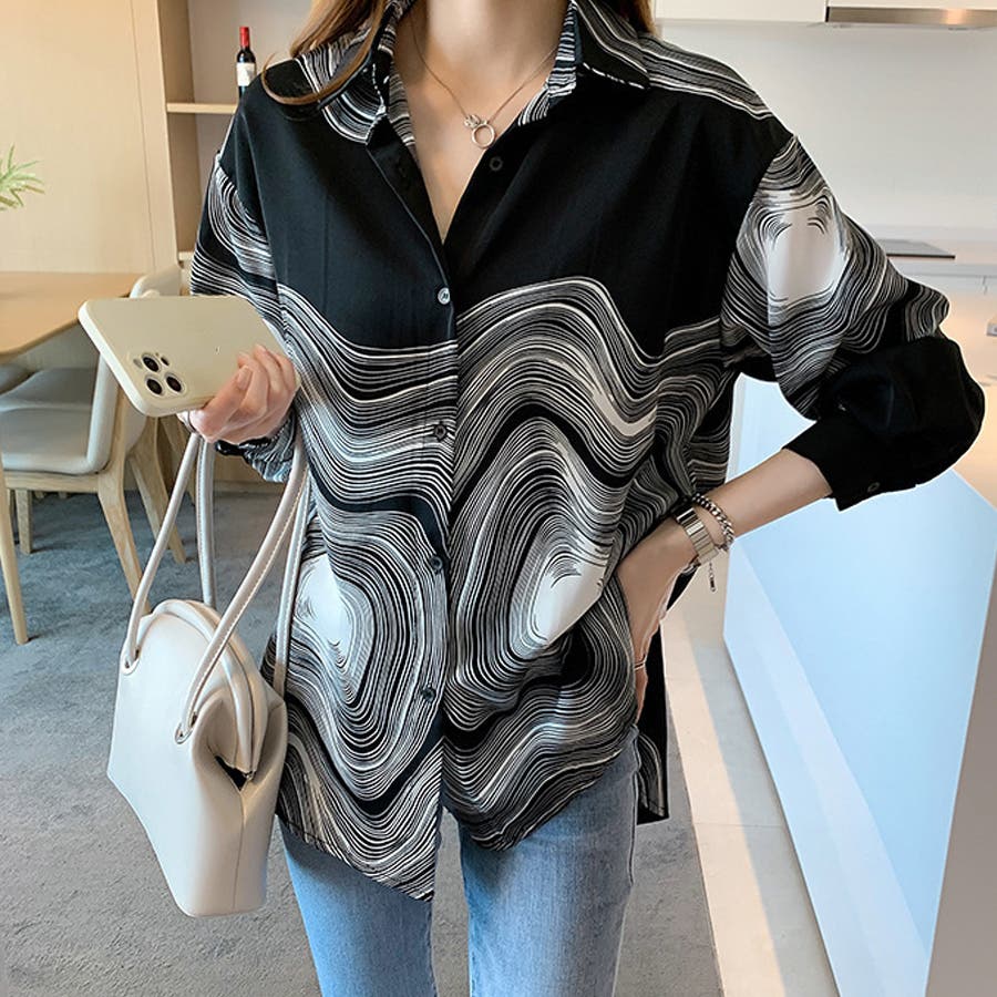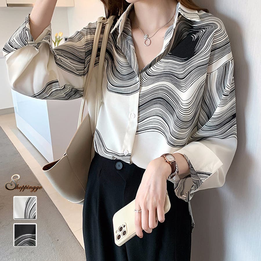 幾何学柄長袖シャツ 渦巻き 波柄プリントシャツブラウス