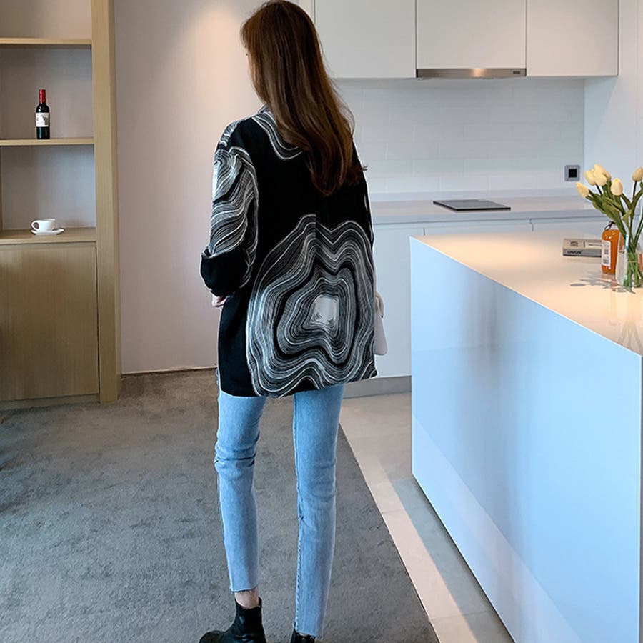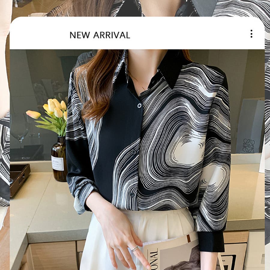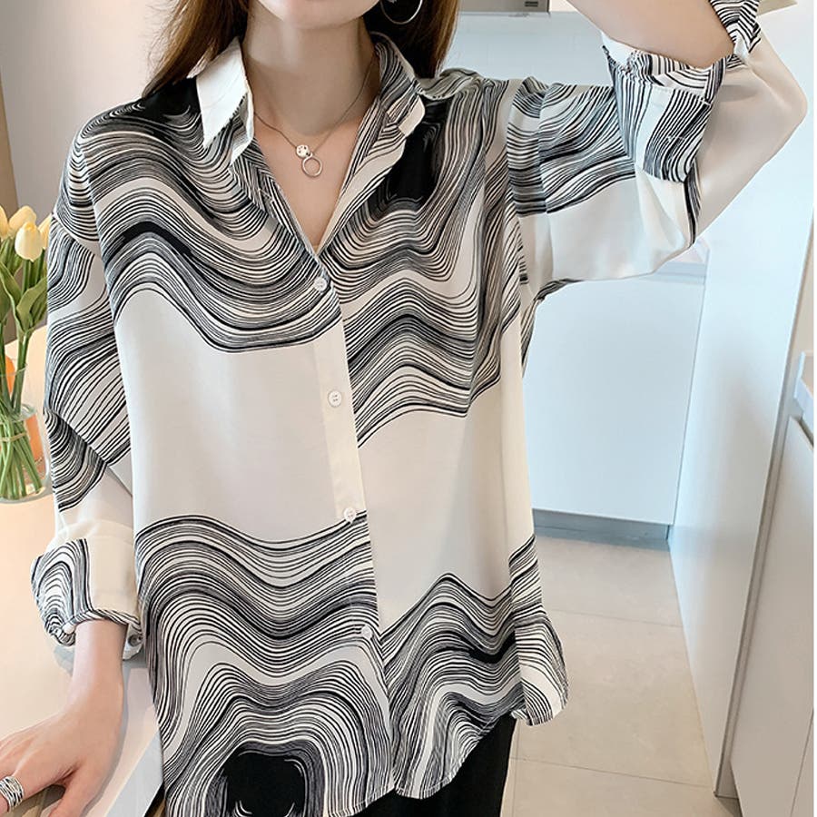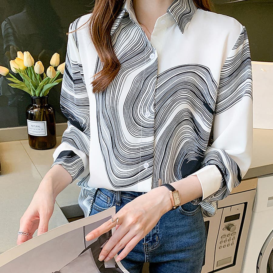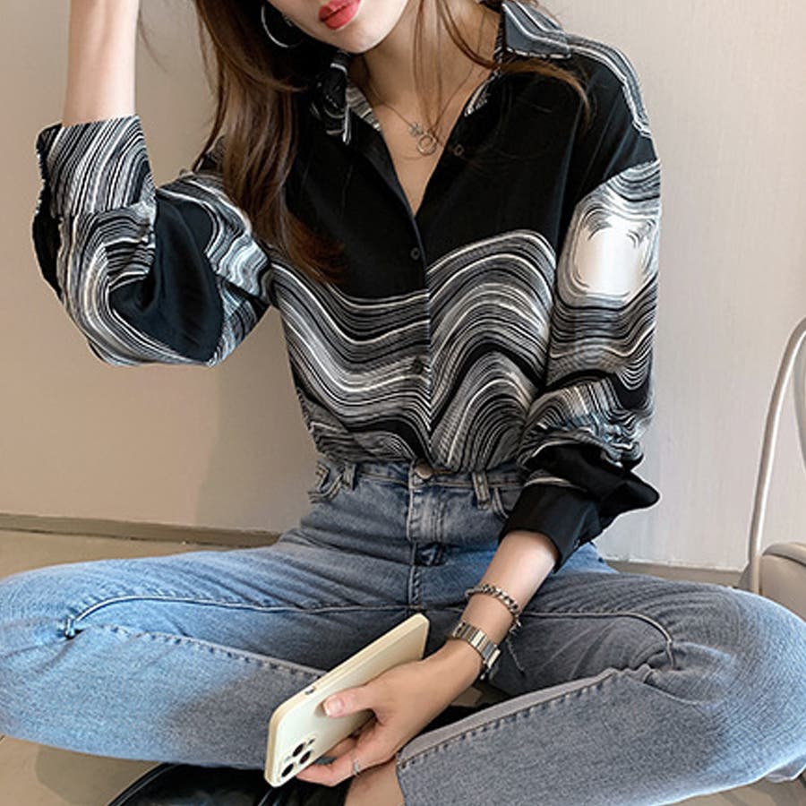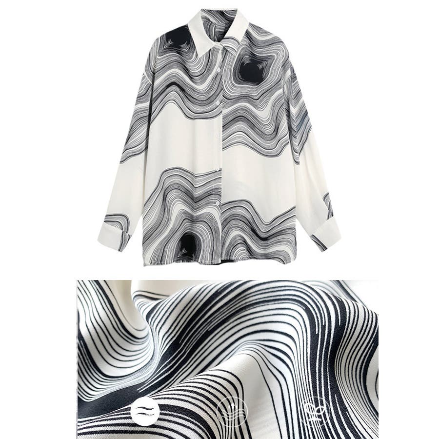 幾何学柄長袖シャツ 渦巻き 波柄プリントシャツブラウス