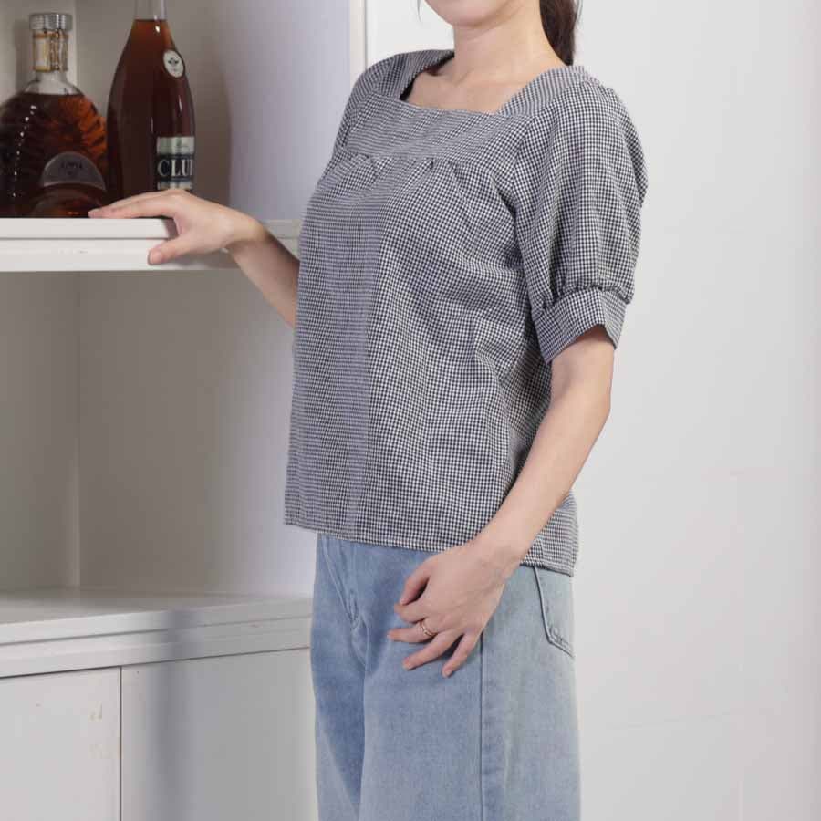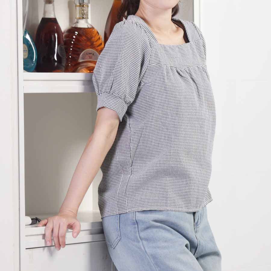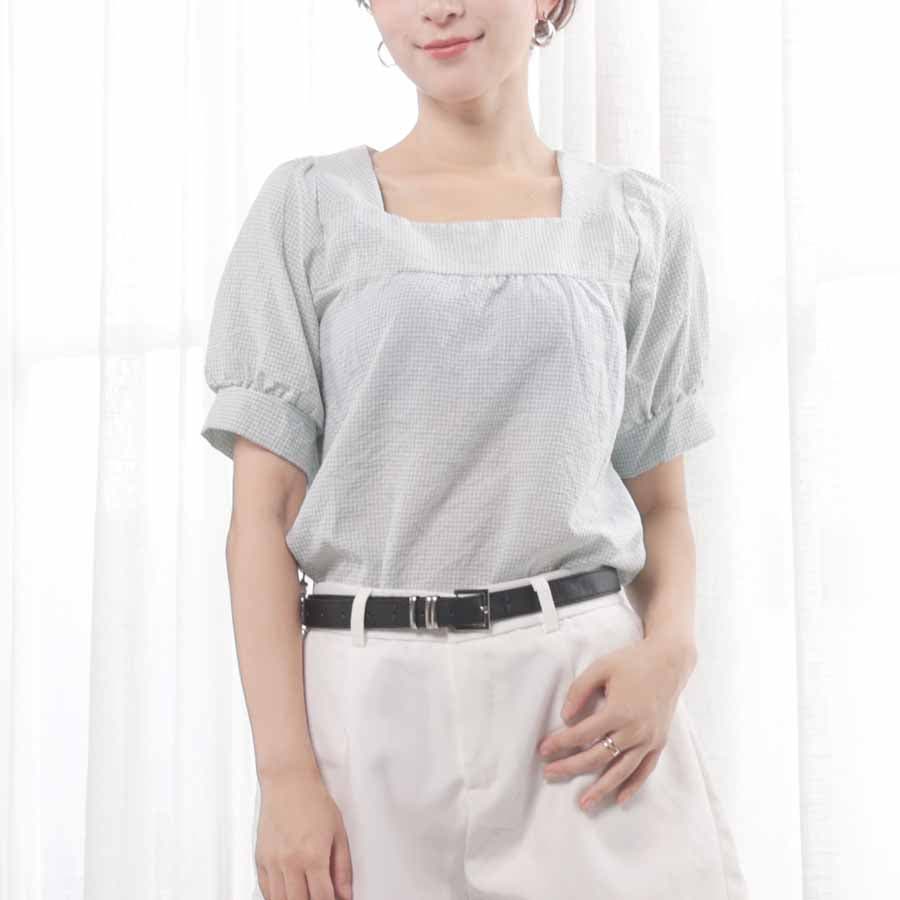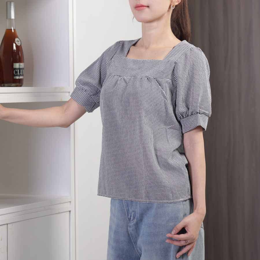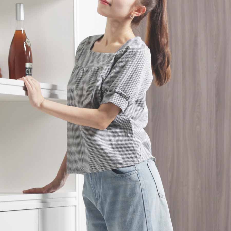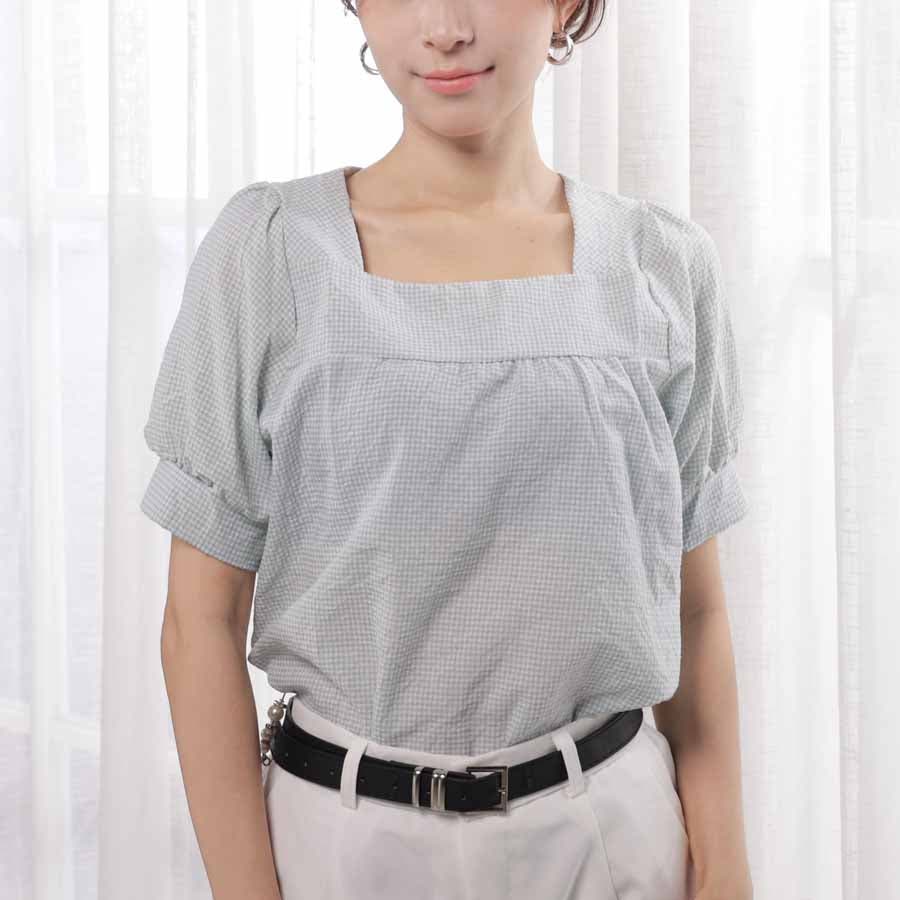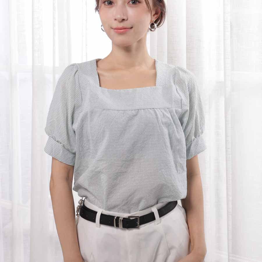 スクエアネックデザインが立体感を演出してくれるギンガムチェックブラウス。