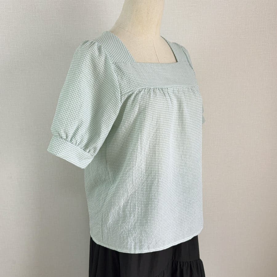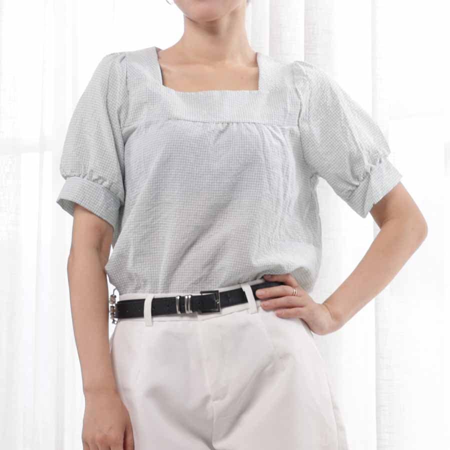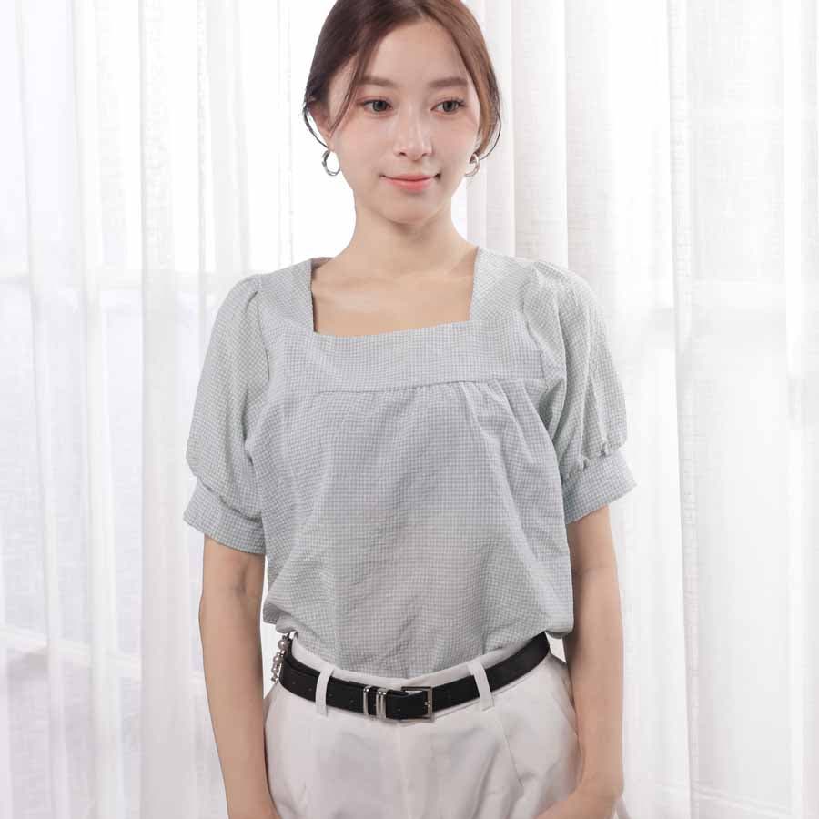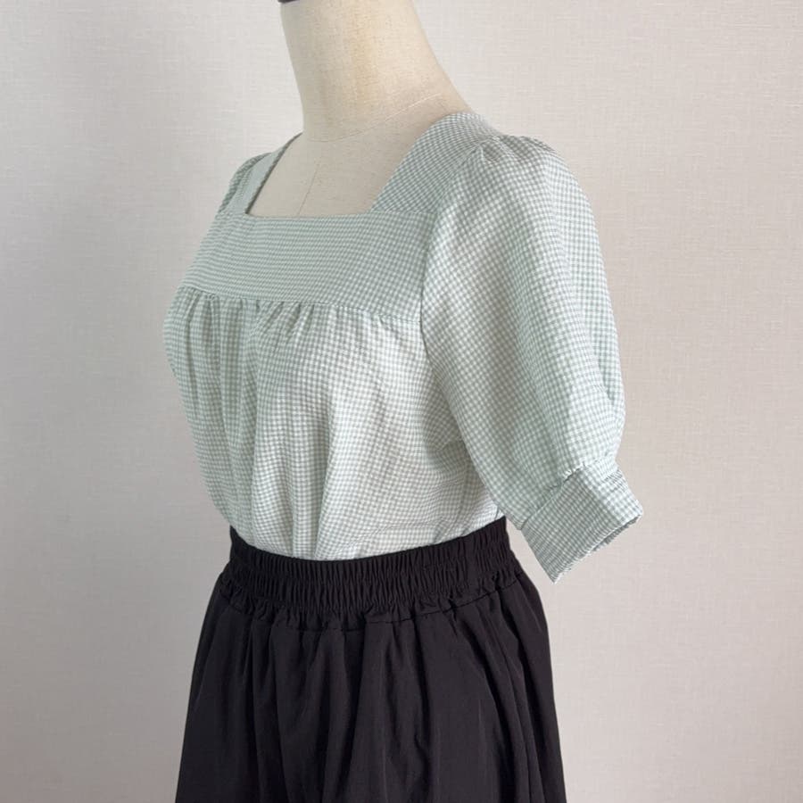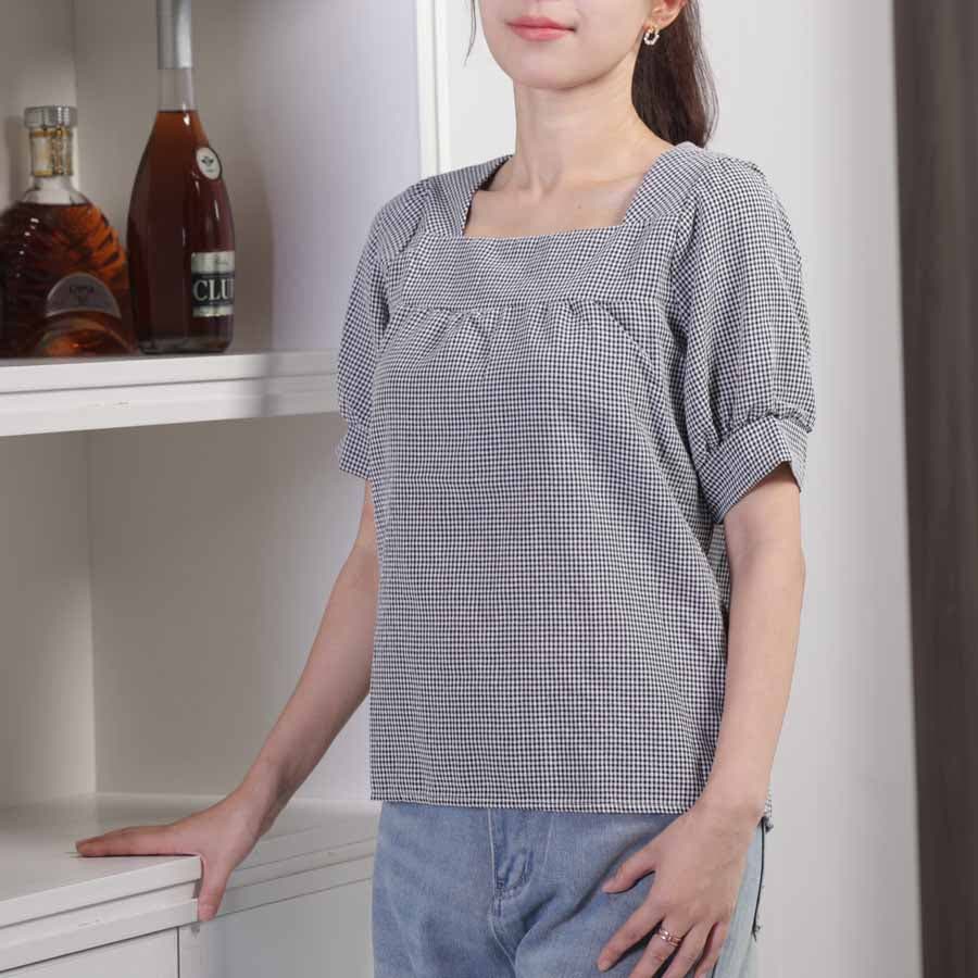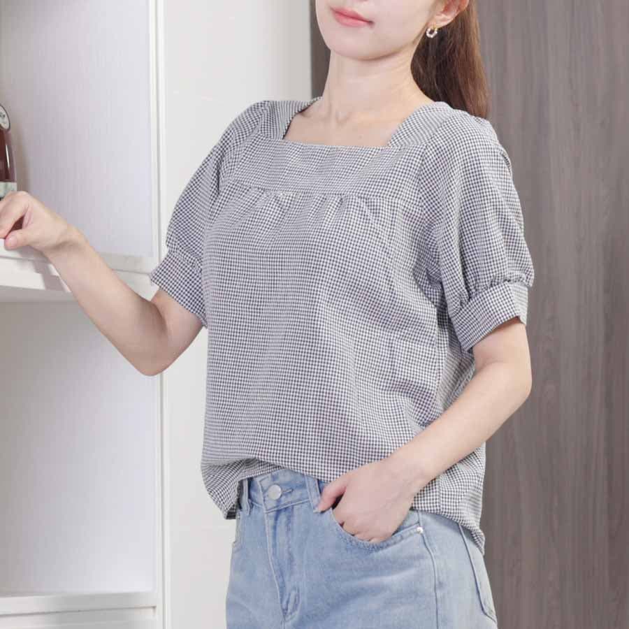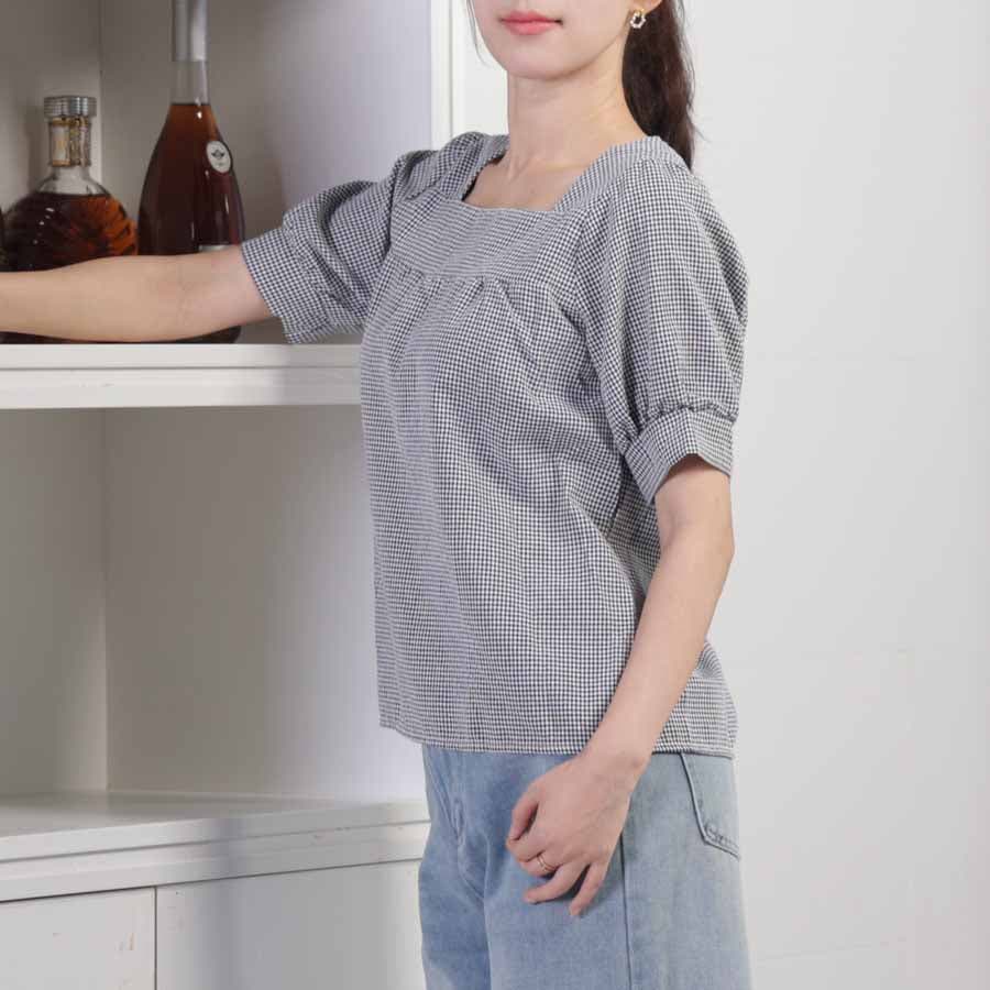 スクエアネックデザインが立体感を演出してくれるギンガムチェックブラウス。