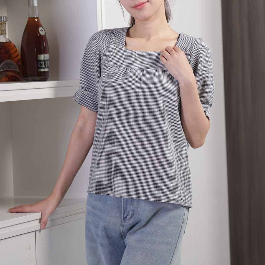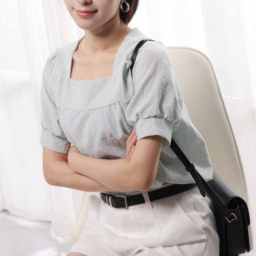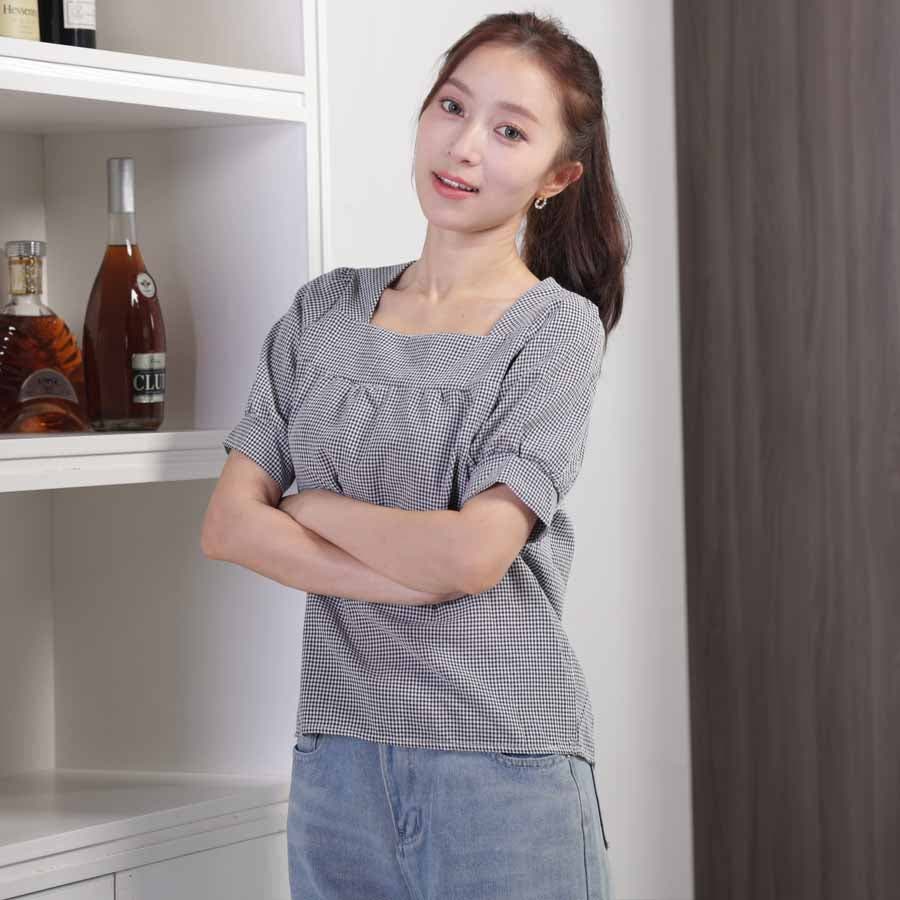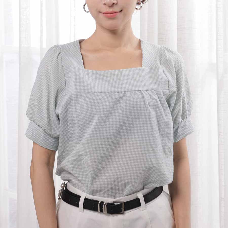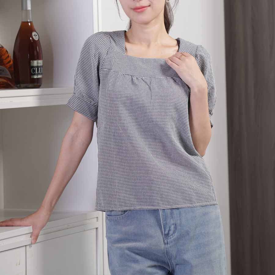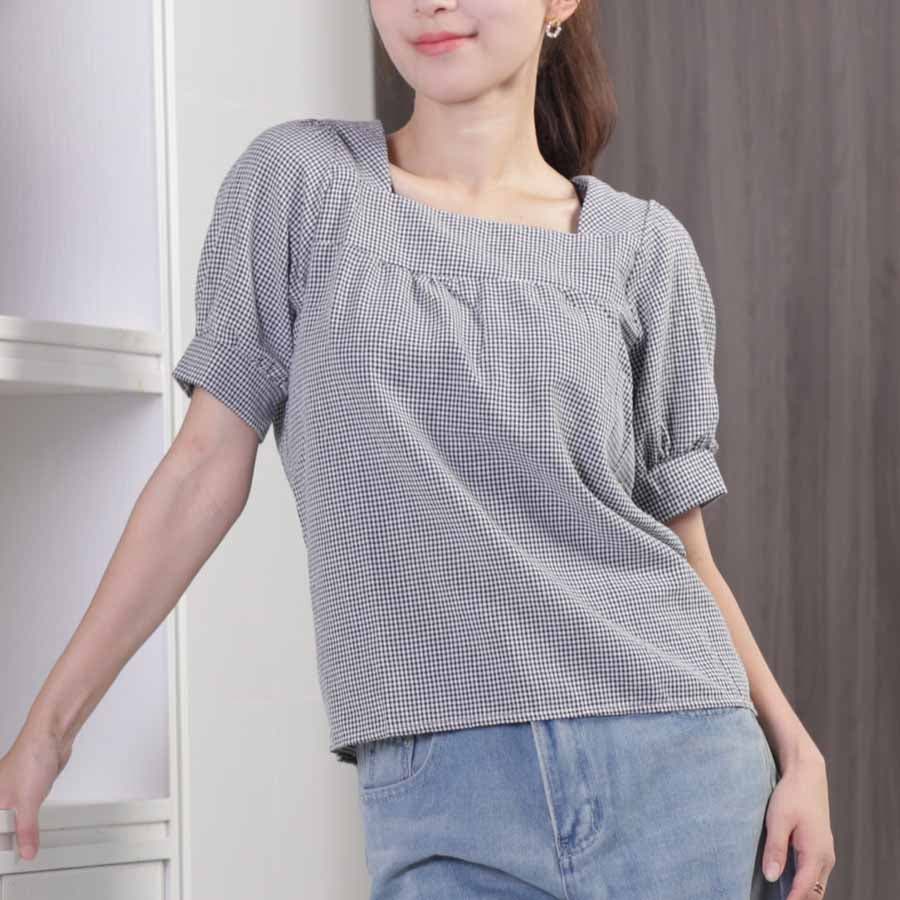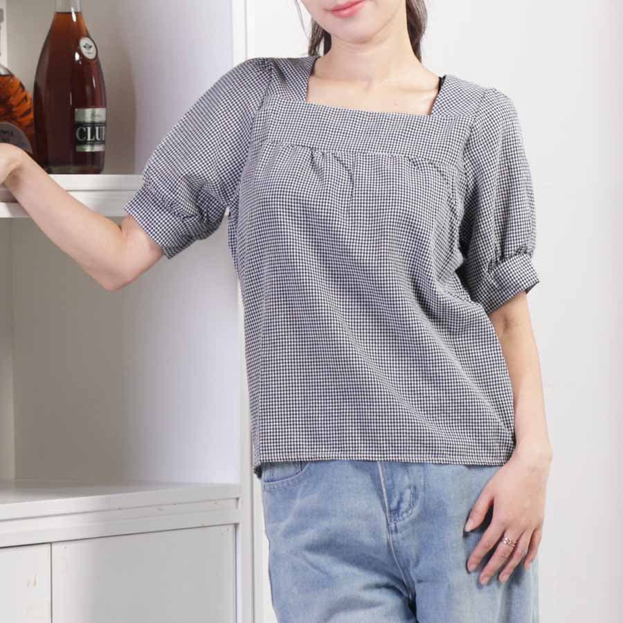 スクエアネックデザインが立体感を演出してくれるギンガムチェックブラウス。