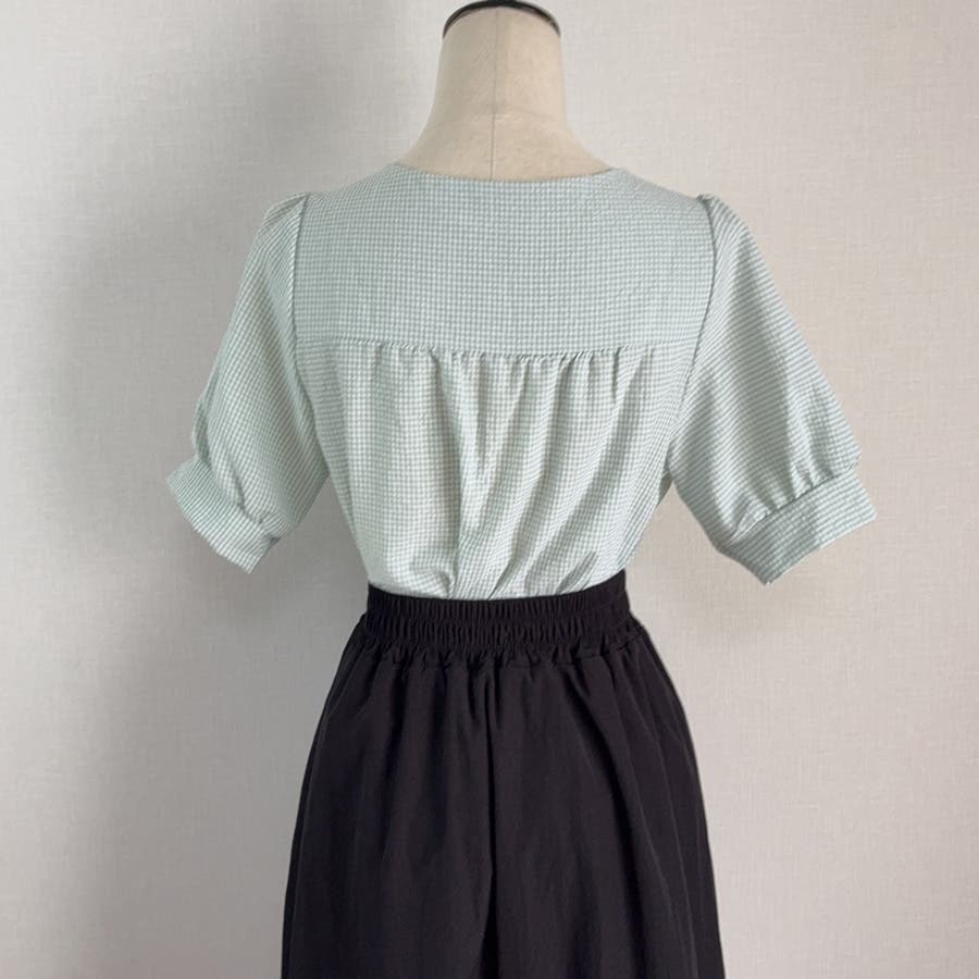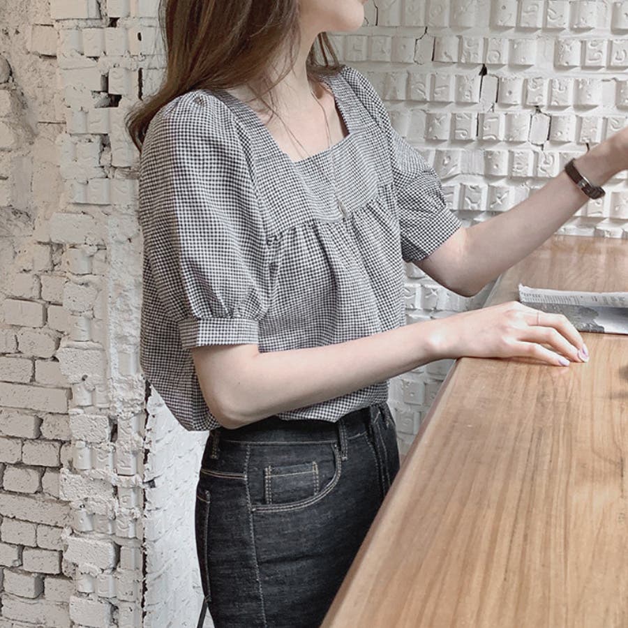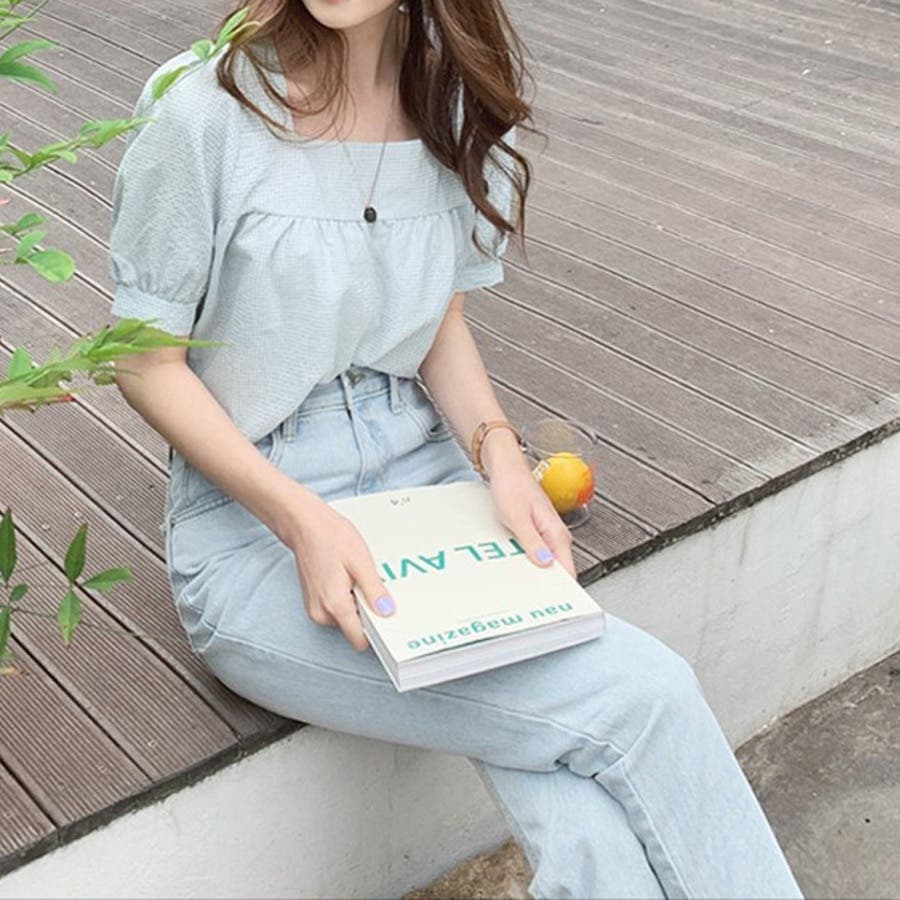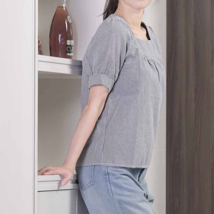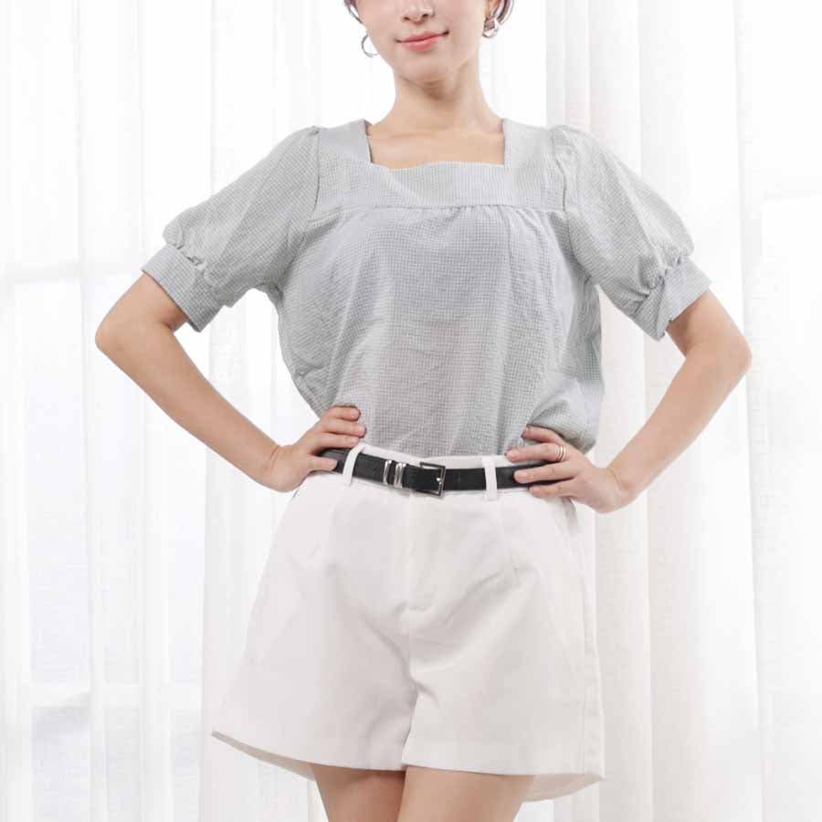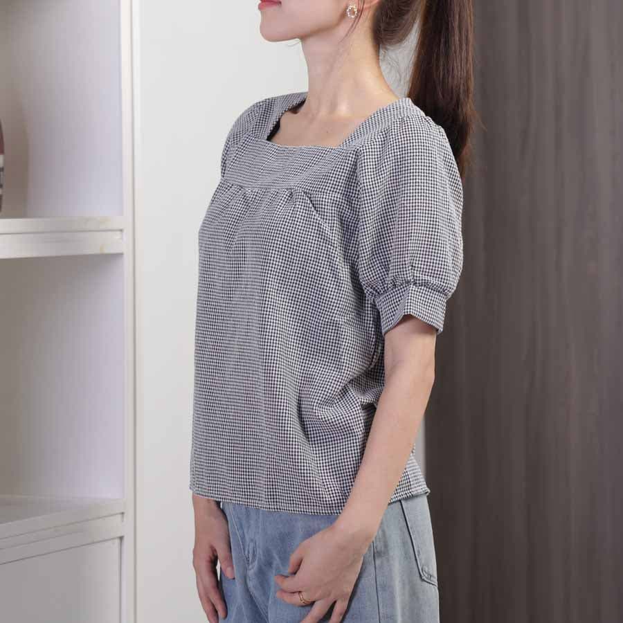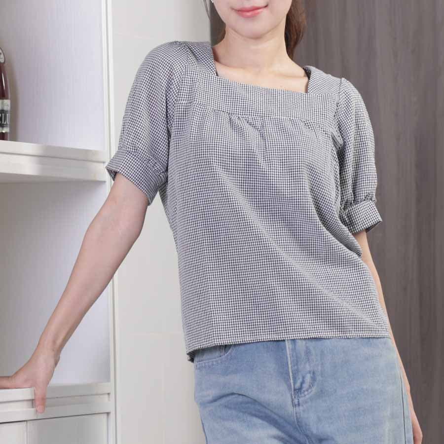 スクエアネックデザインが立体感を演出してくれるギンガムチェックブラウス。