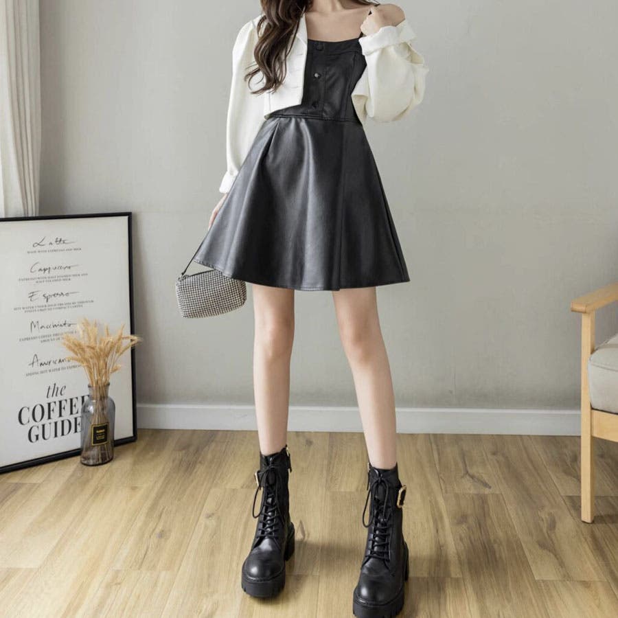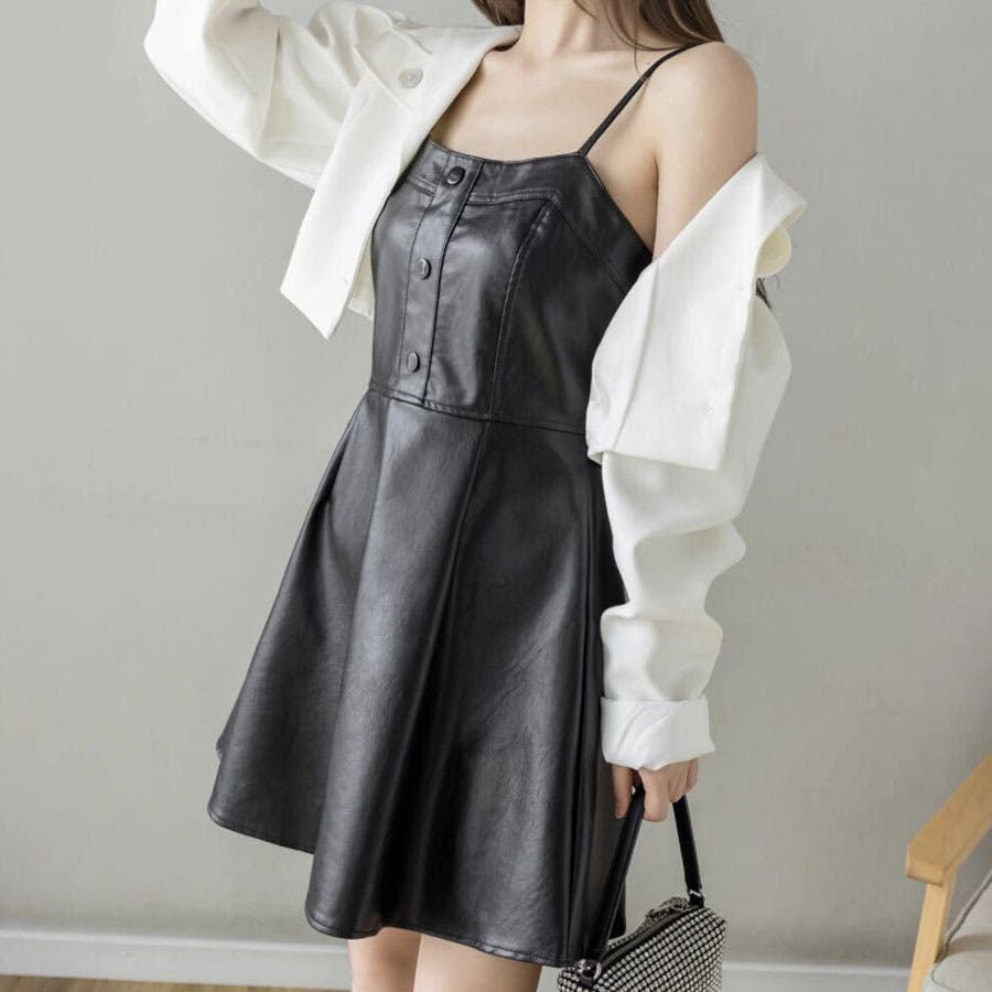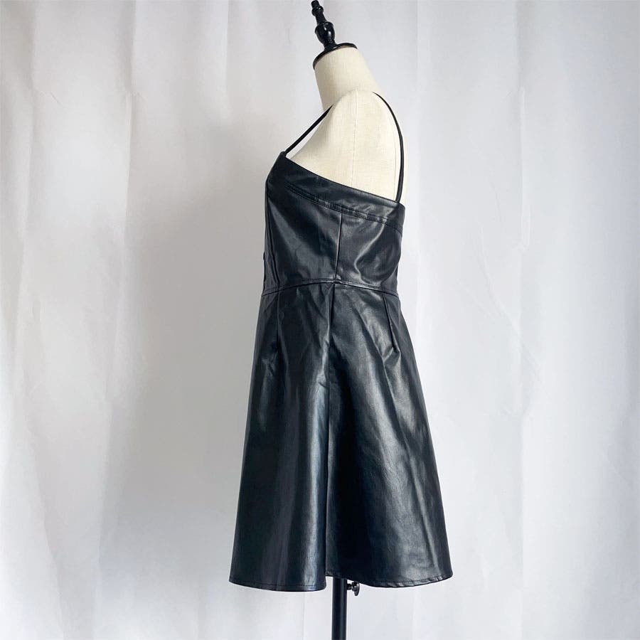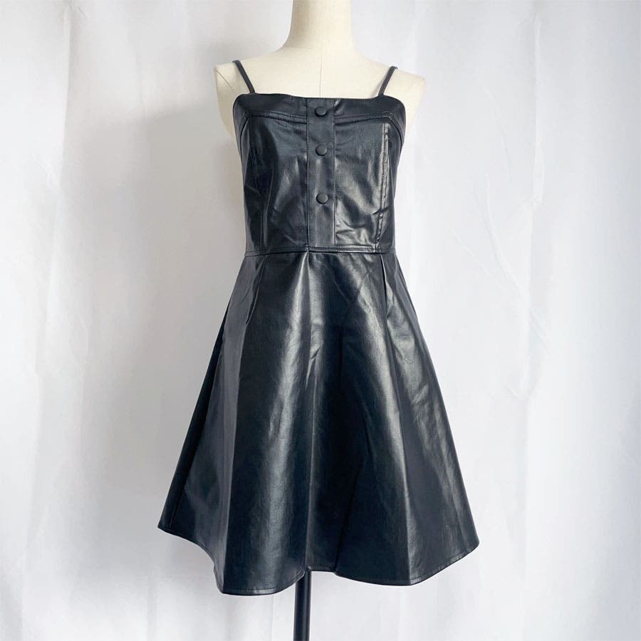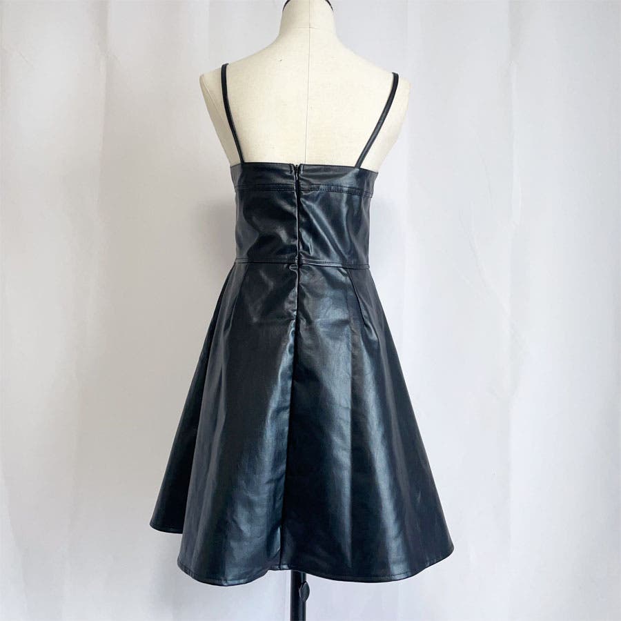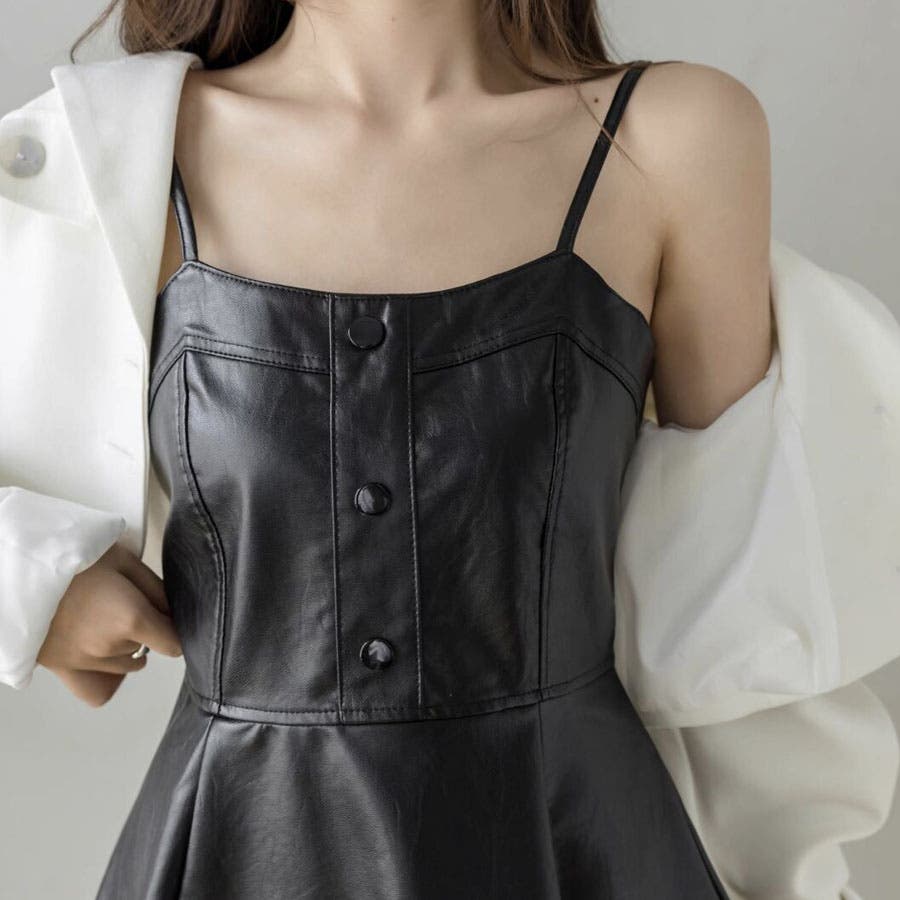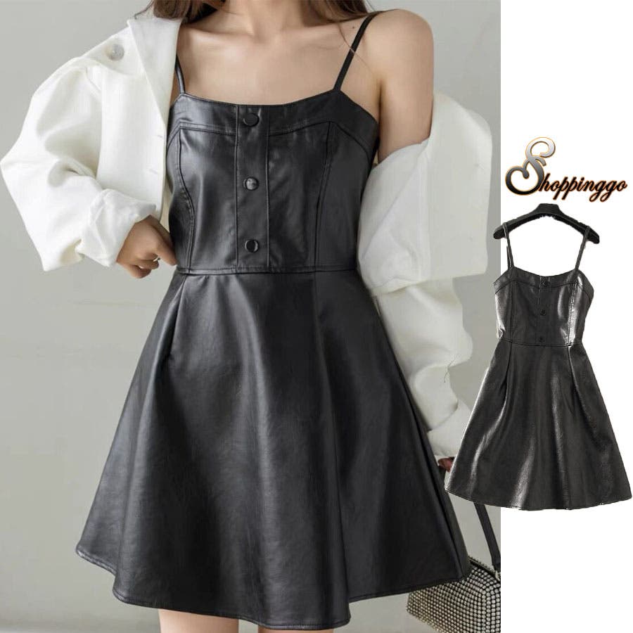 フレアキャミワンピース ジャンパ―スカート フェイクレザーワンピース