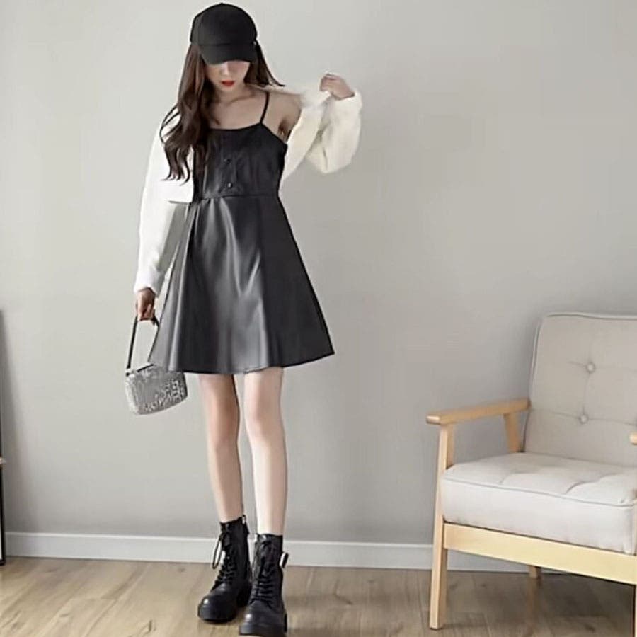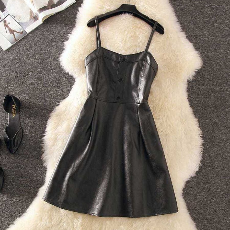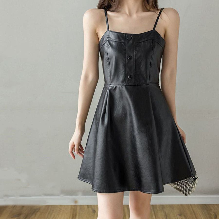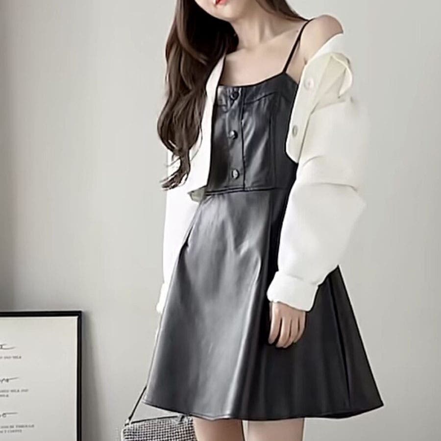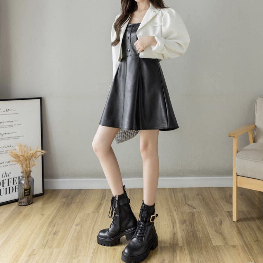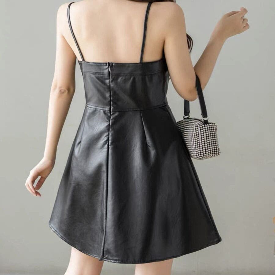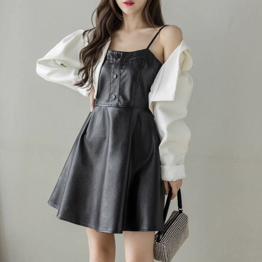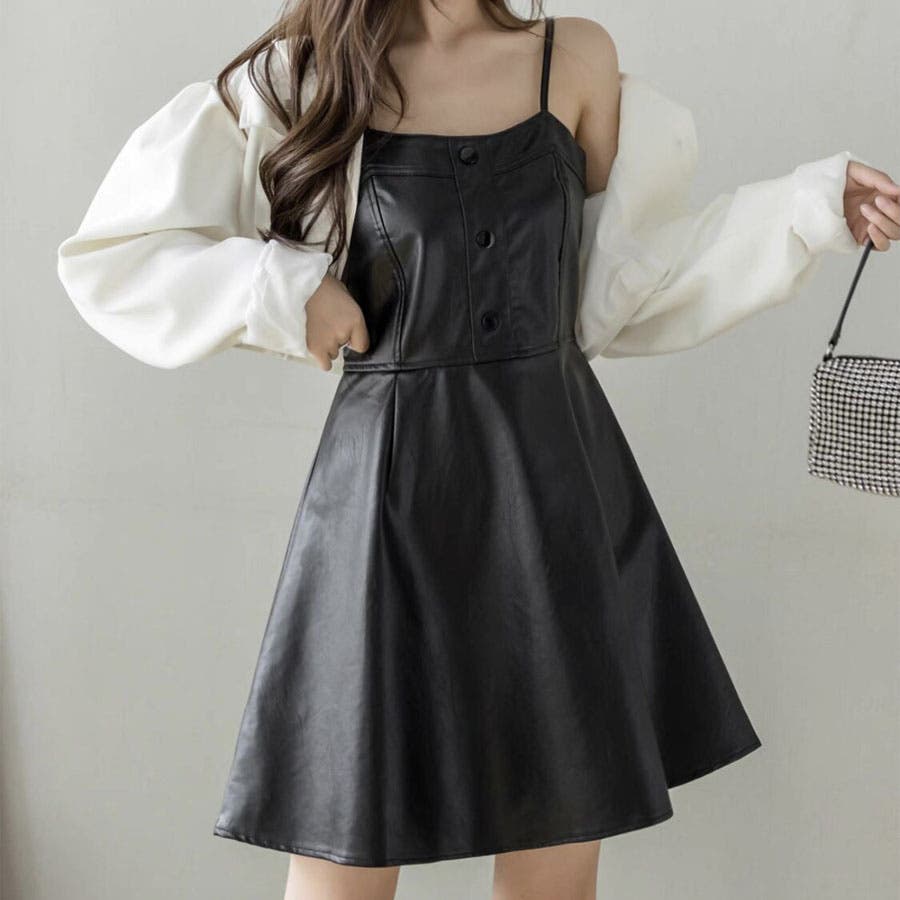 フレアキャミワンピース ジャンパ―スカート フェイクレザーワンピース