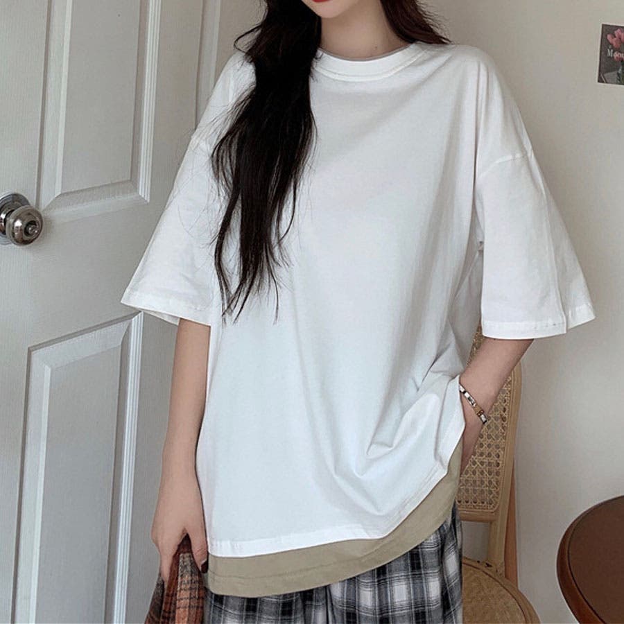 Tシャツ 重ね着 レイヤード風 大きめ カジュアル 無地 カットソー サマーTシャツ レディース 切り替え半袖 夏 春 韓国 ファッション