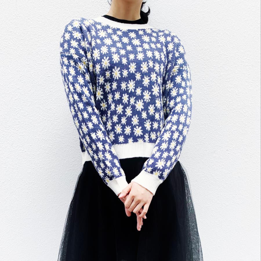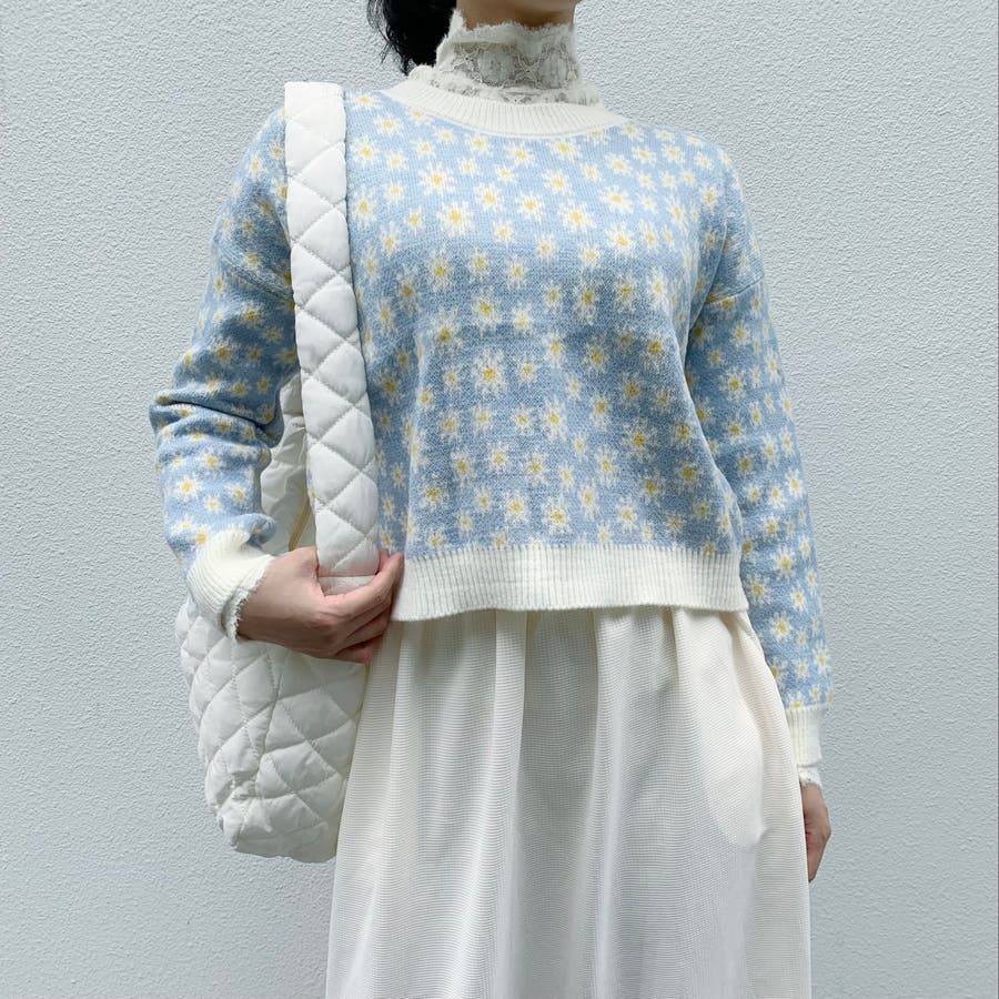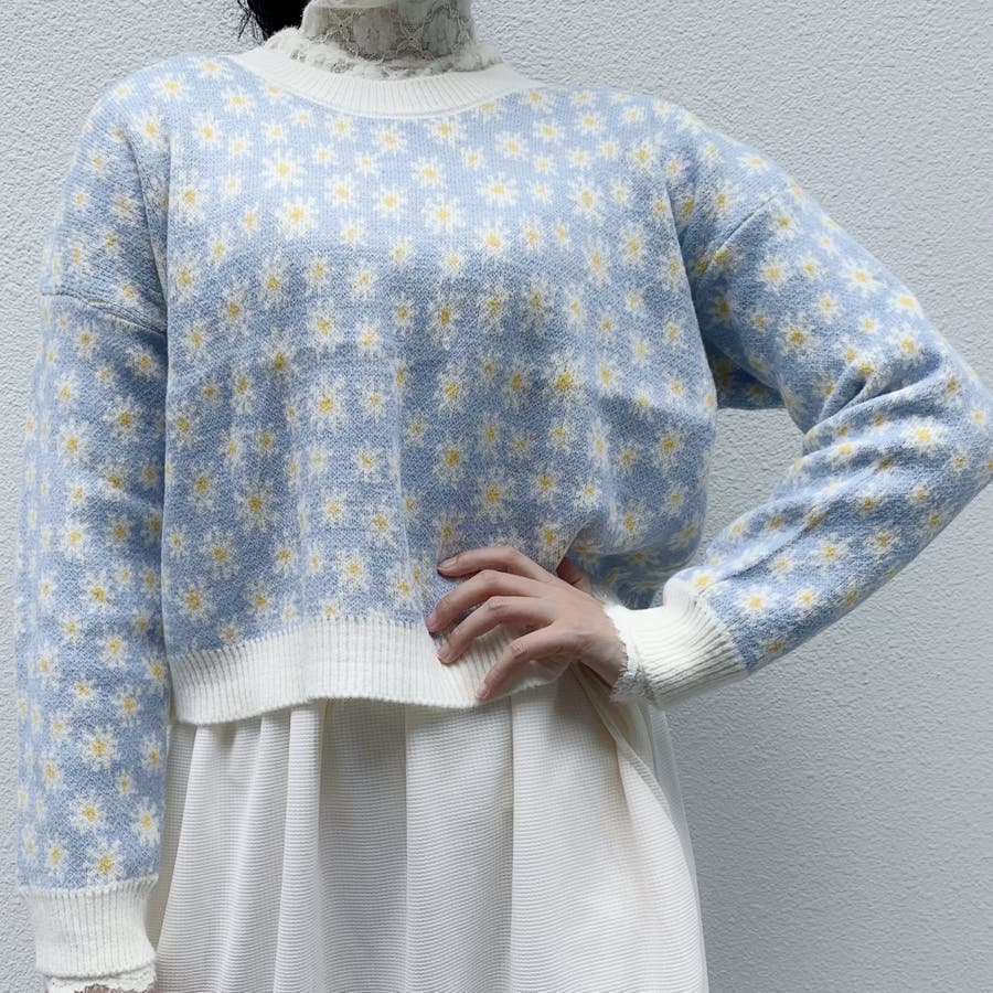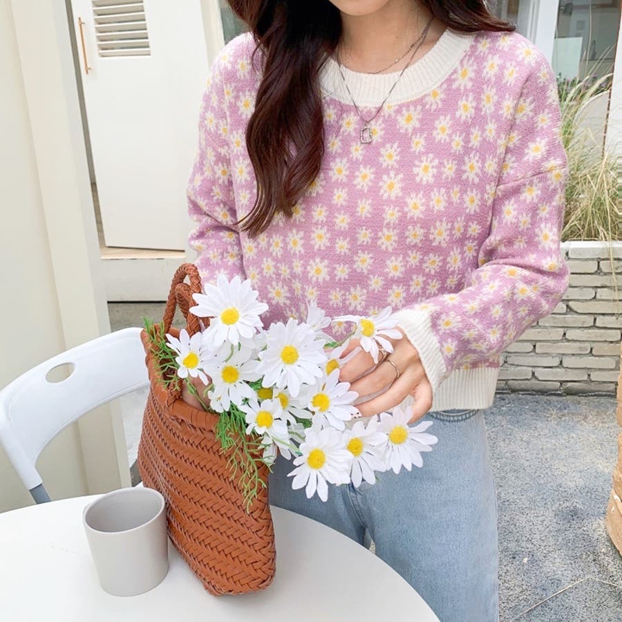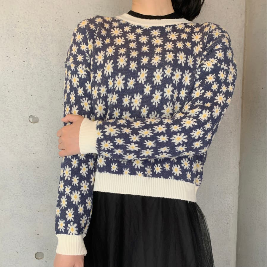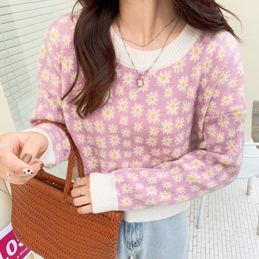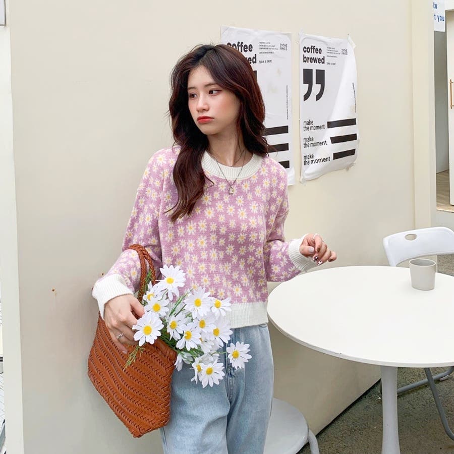 フラワ-柄ニットプルオーバー 韓国ファッション 可愛い