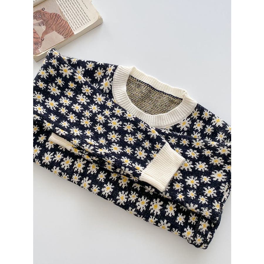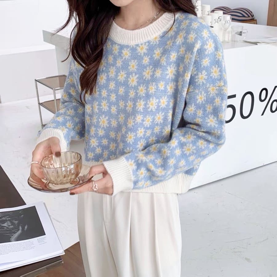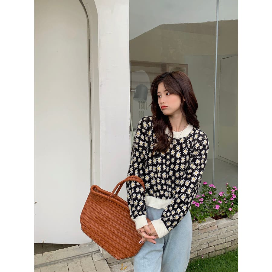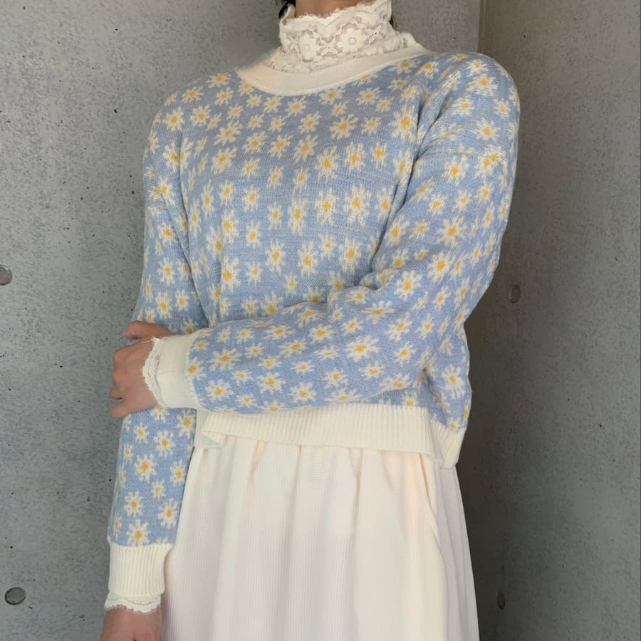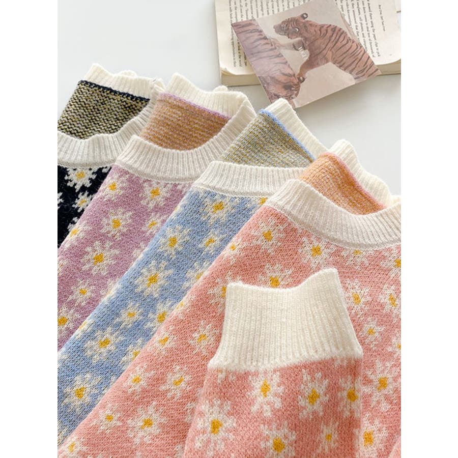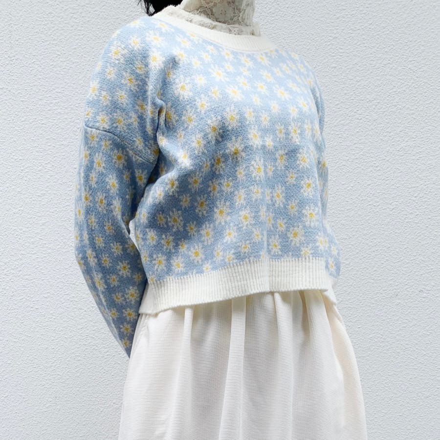 フラワ-柄ニットプルオーバー 韓国ファッション 可愛い