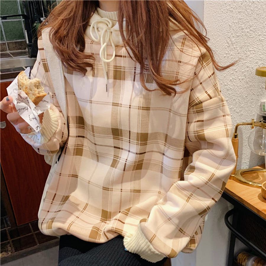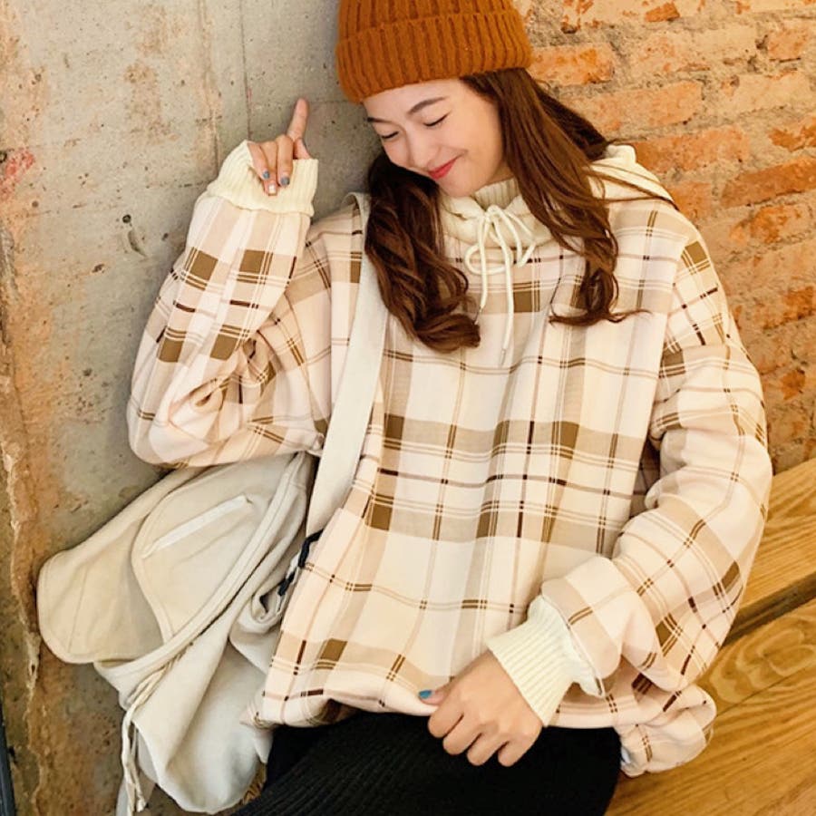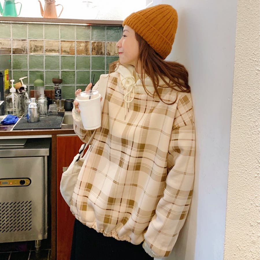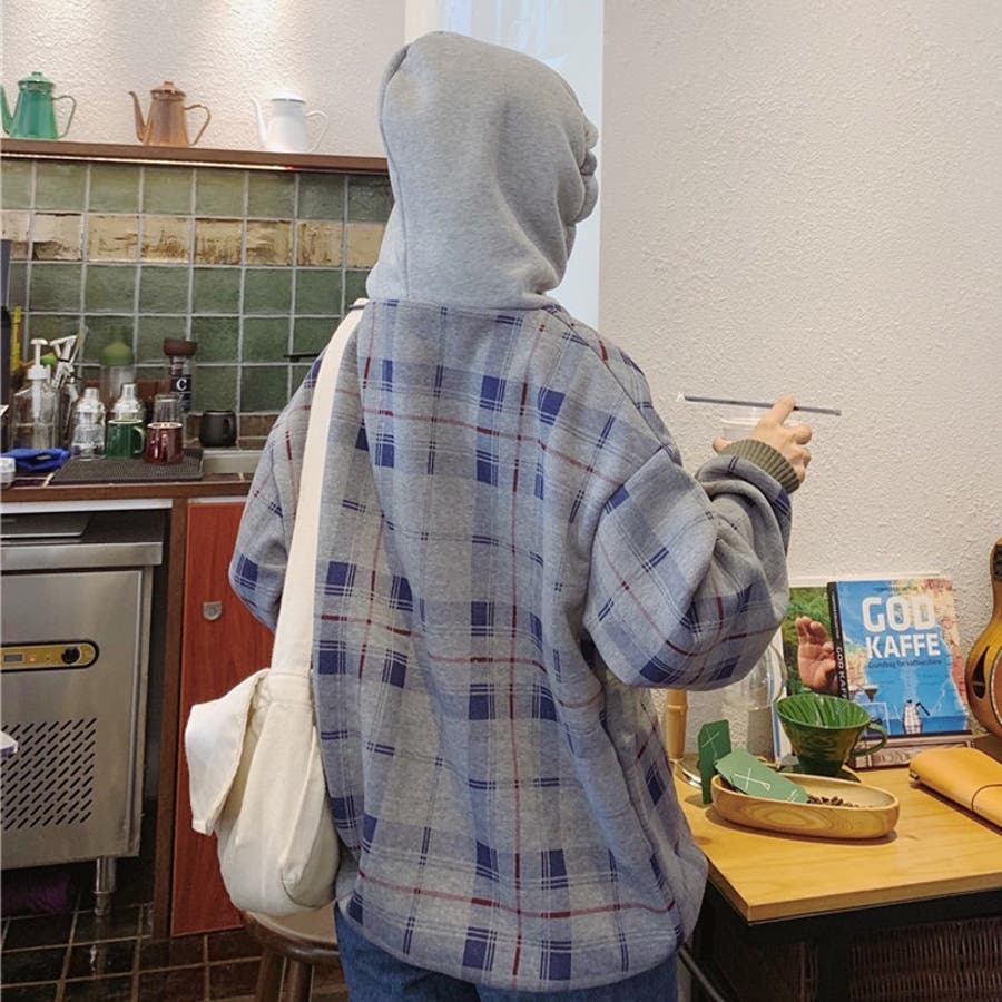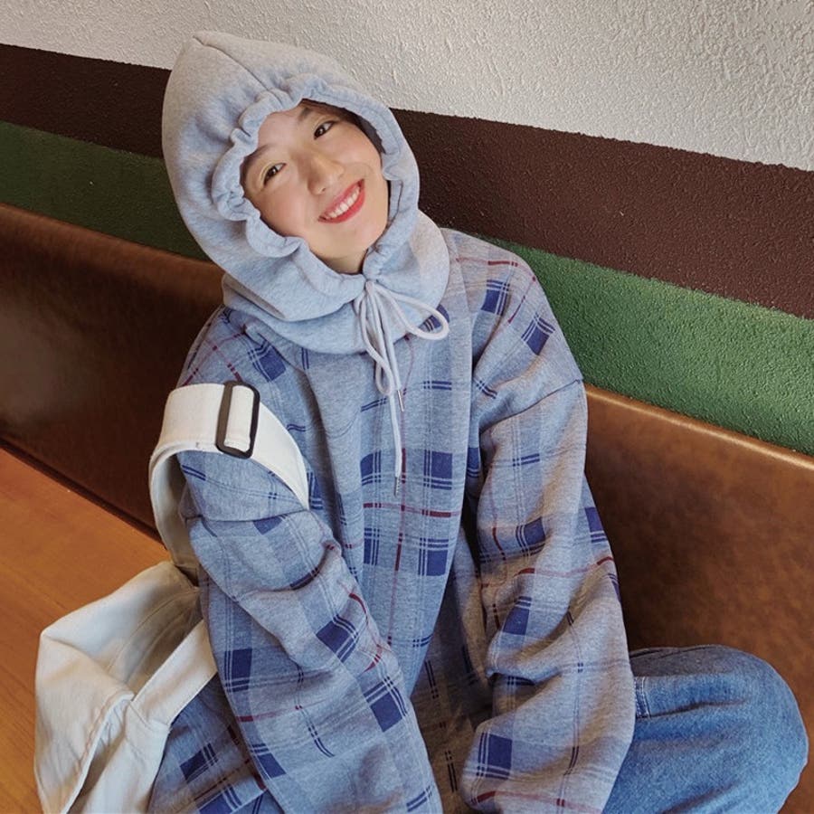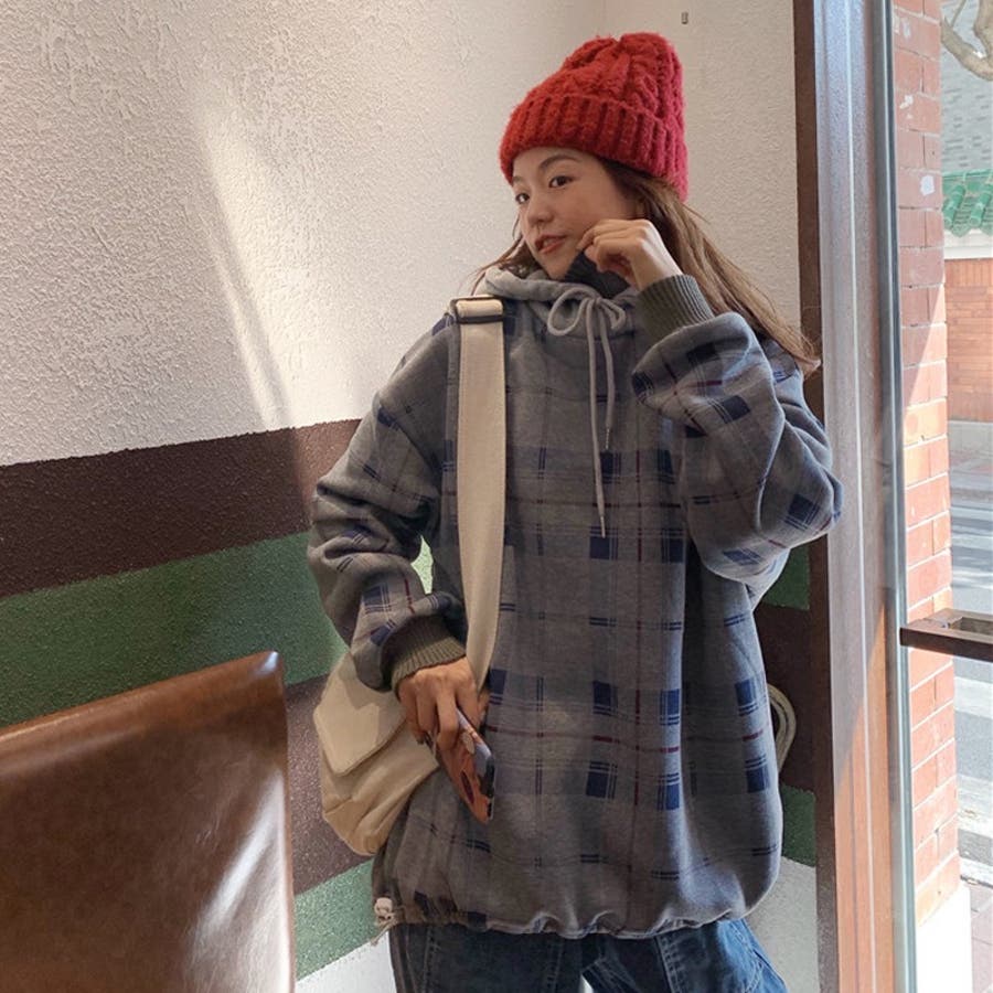 裏毛チェック柄パーカ- フード付き 韓国ファッション