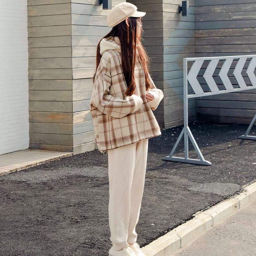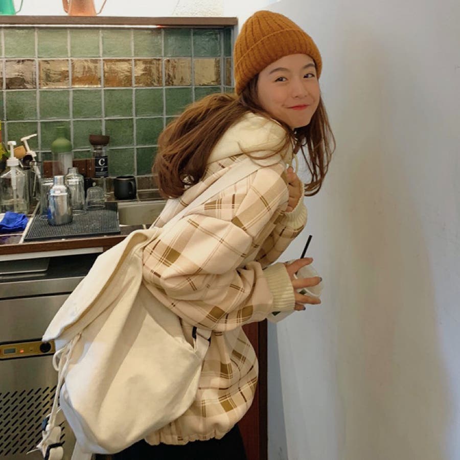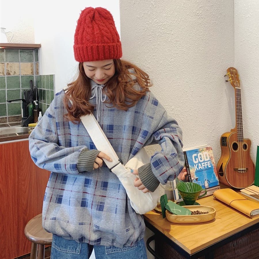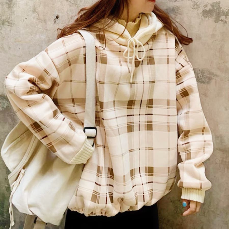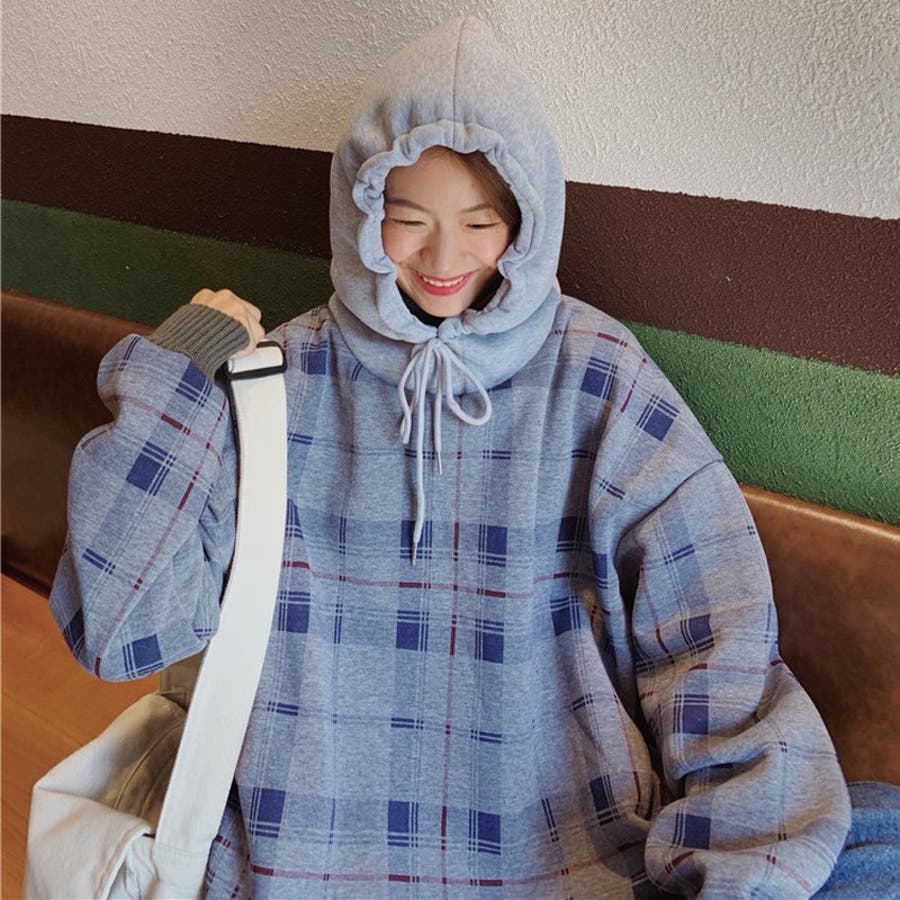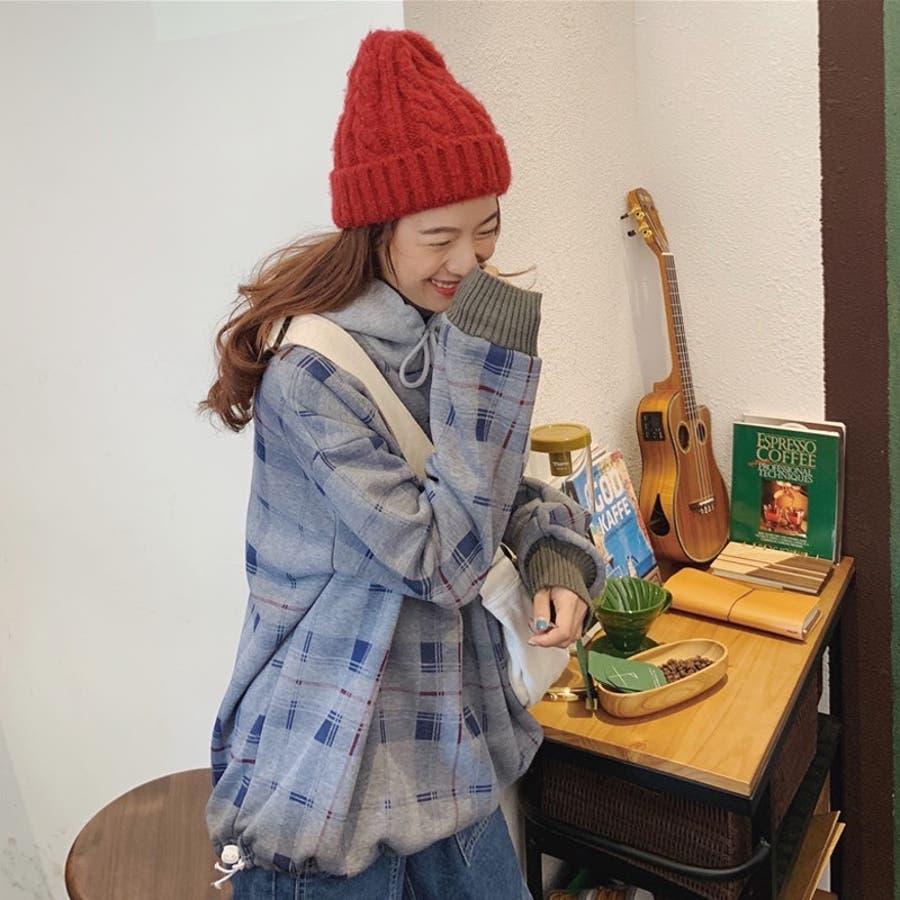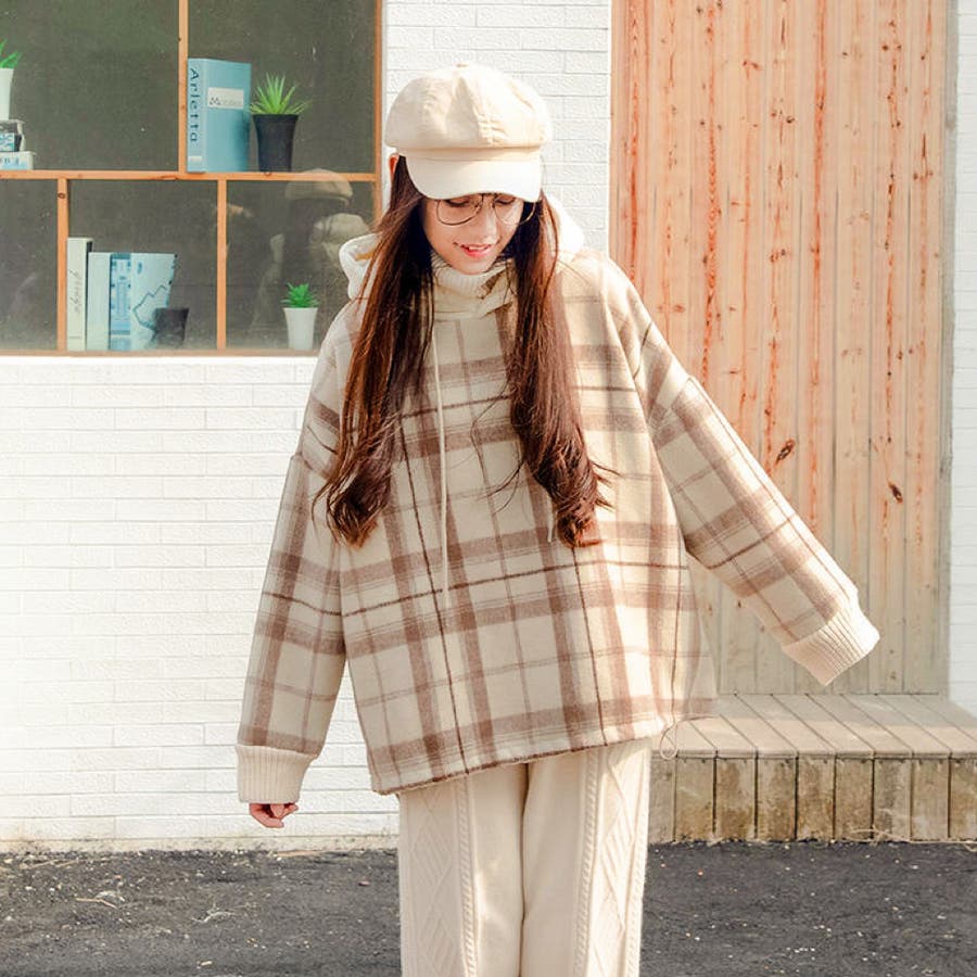 裏毛チェック柄パーカ- フード付き 韓国ファッション