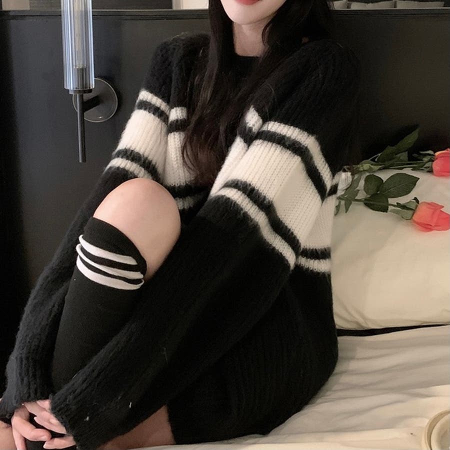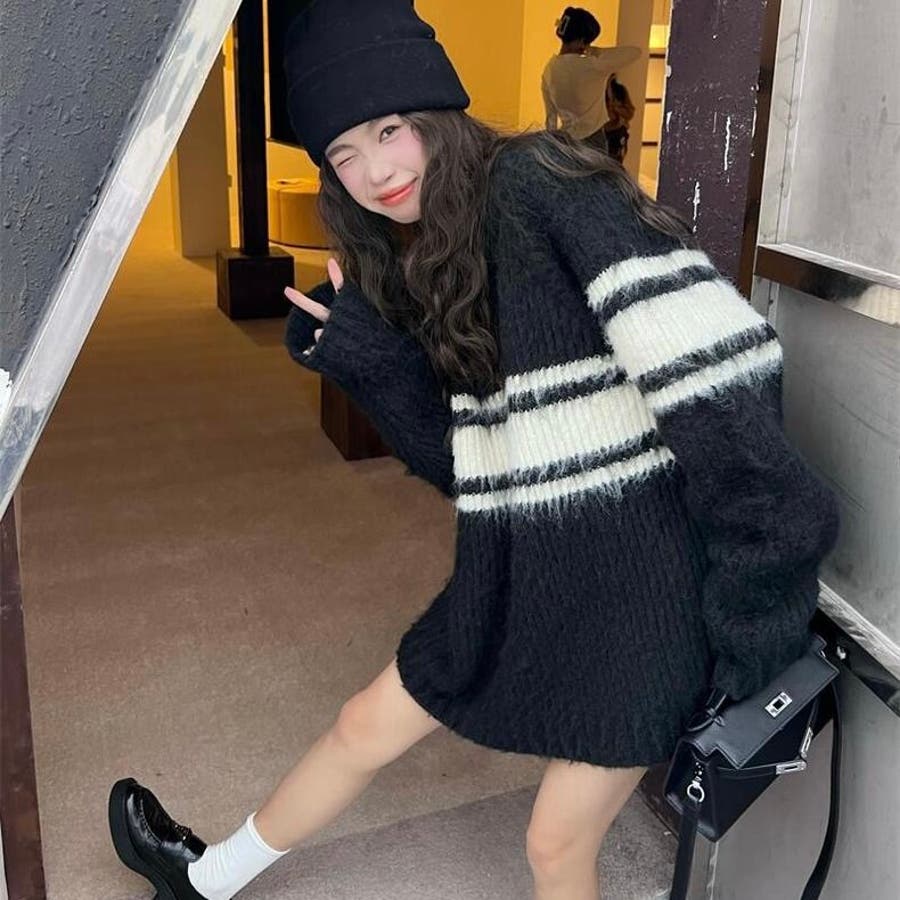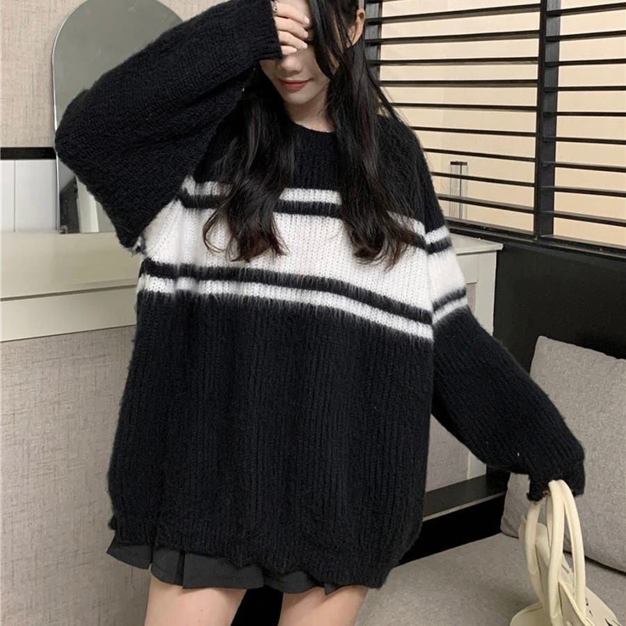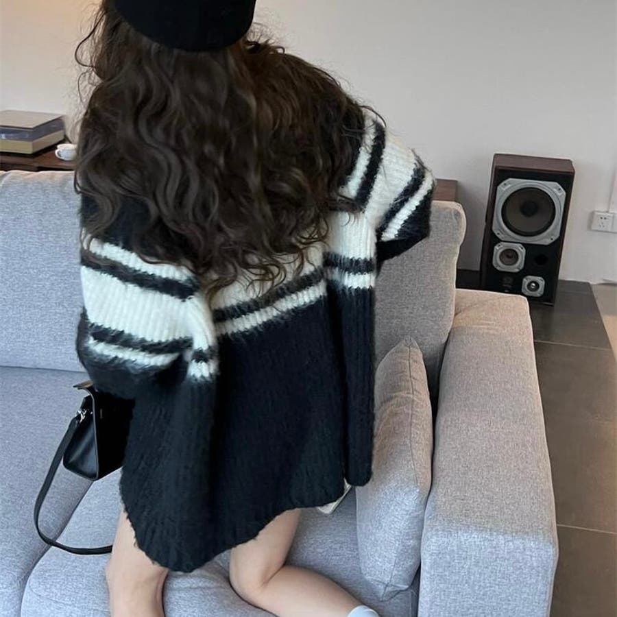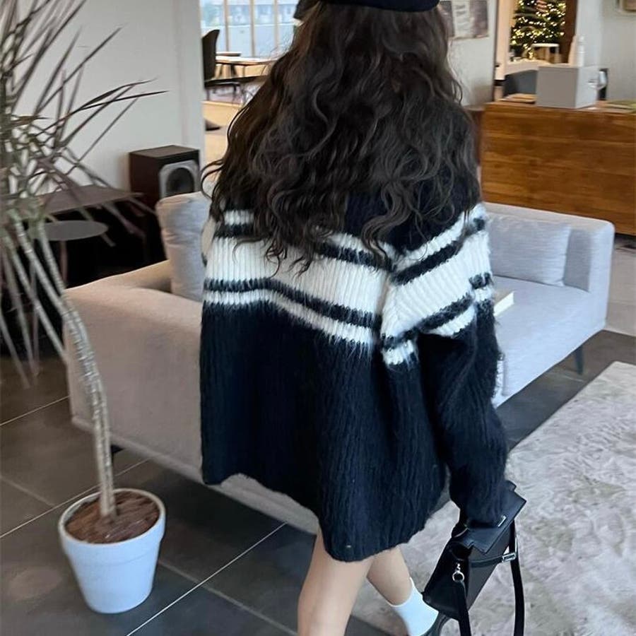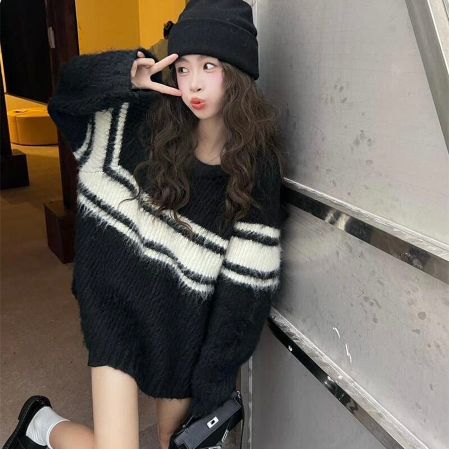 ストリート感のある目を惹くビッグシルエットデザインで旬な着こなしと存在感を発揮するボーダーニットセーター
