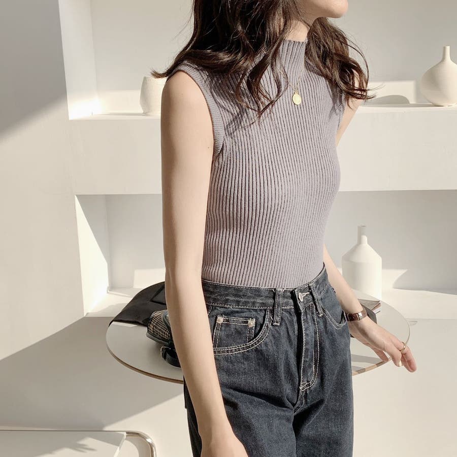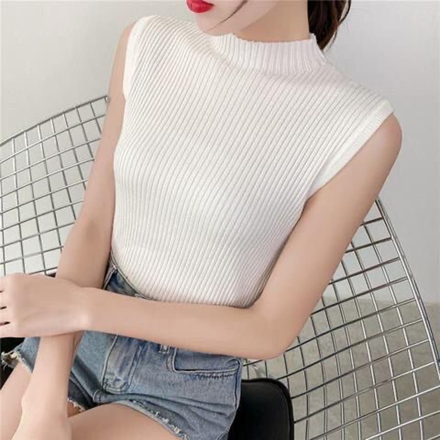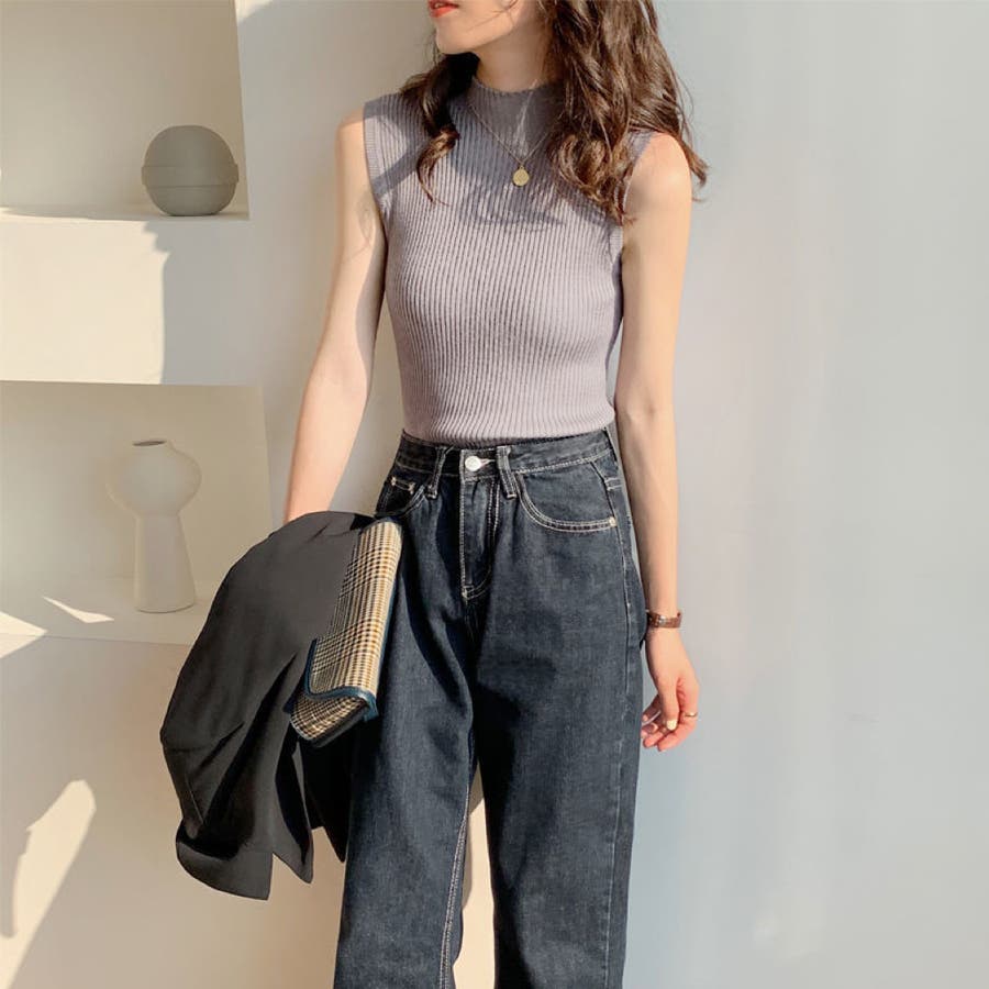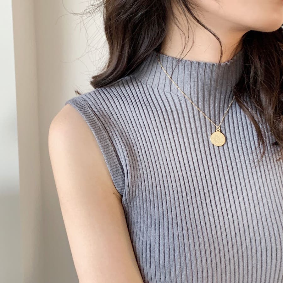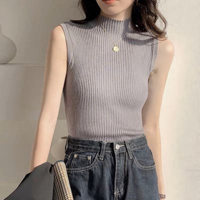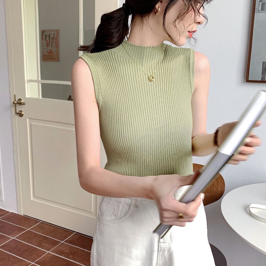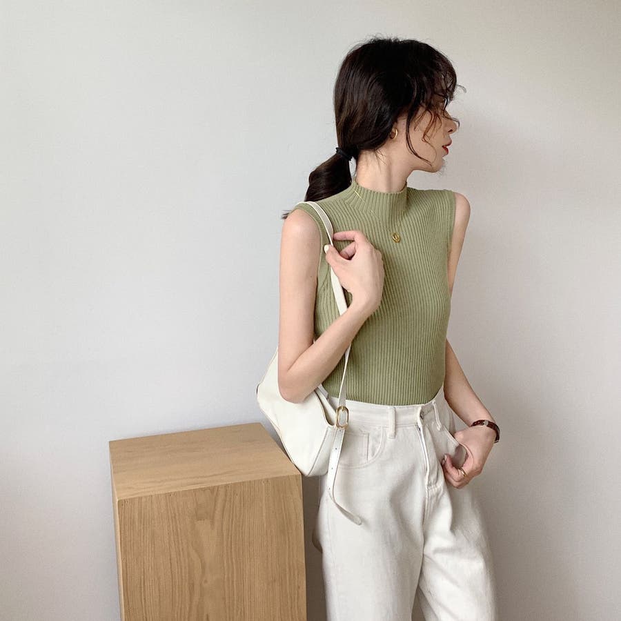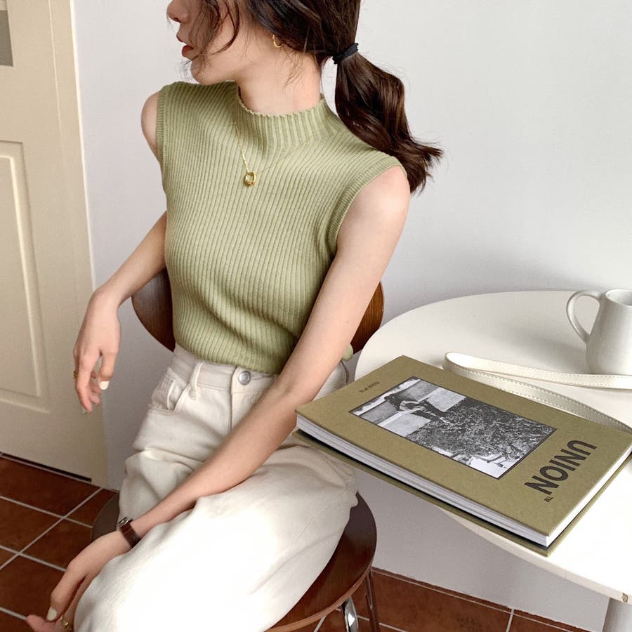 さらっと大人シンプル。ハイネックノースリーブニットトップス 春 韓国ファッション