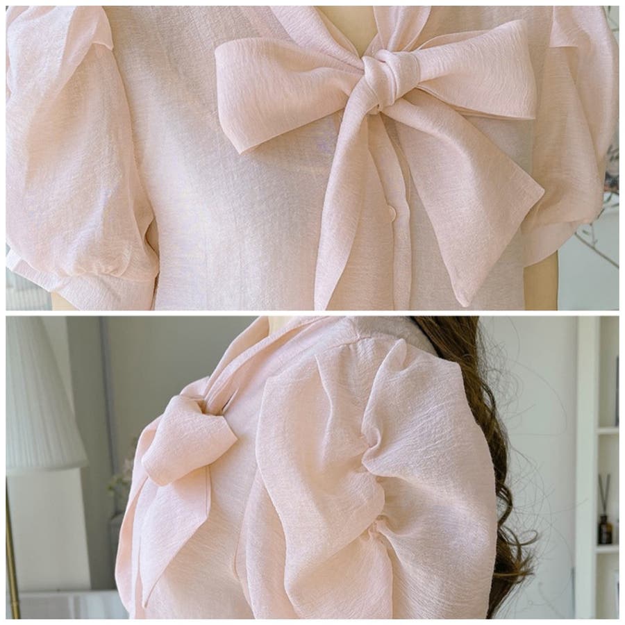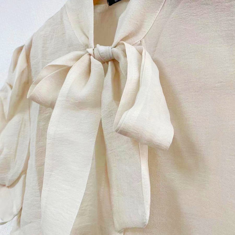 ギャザーをたっぷりと施した袖はボリューム感が大人かわいい印象に。