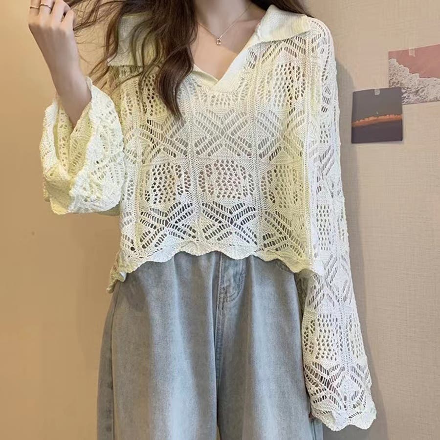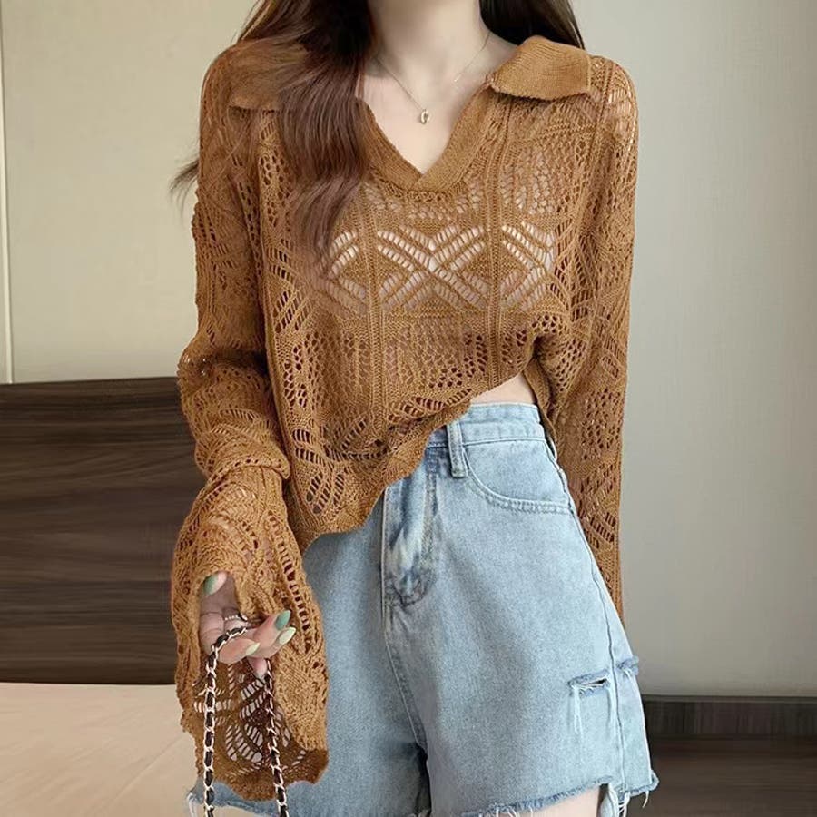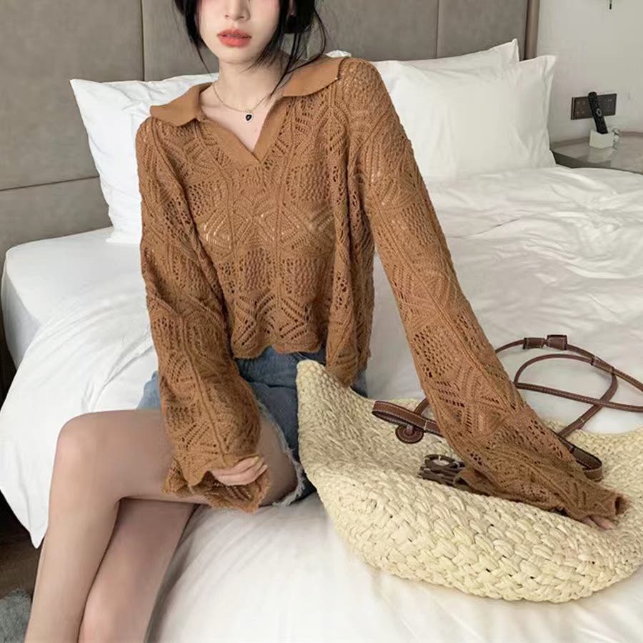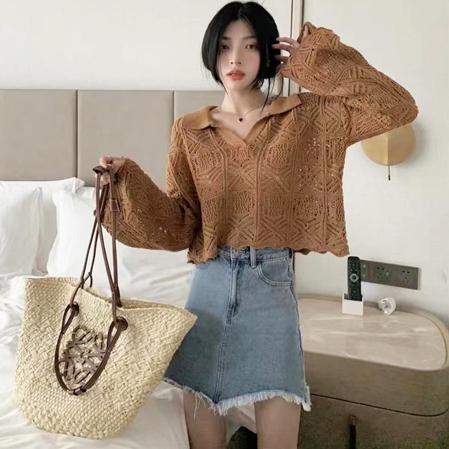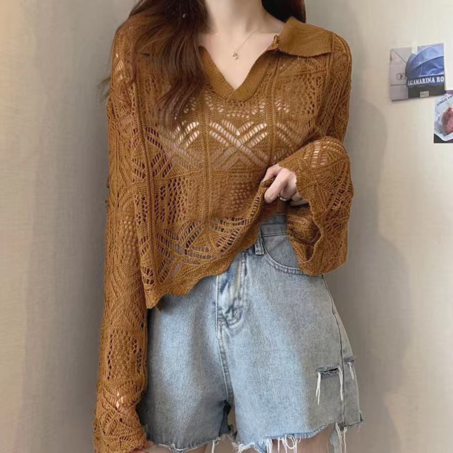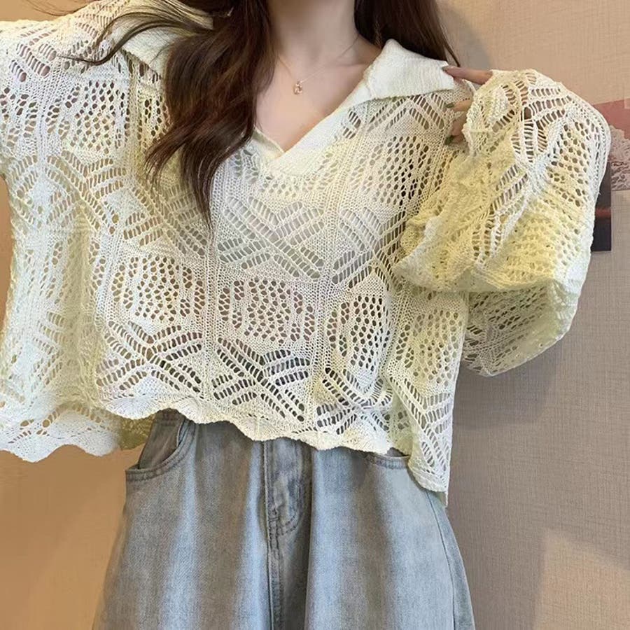 Vネックかぎ針編みニットトップス インナー 透け感トップス
