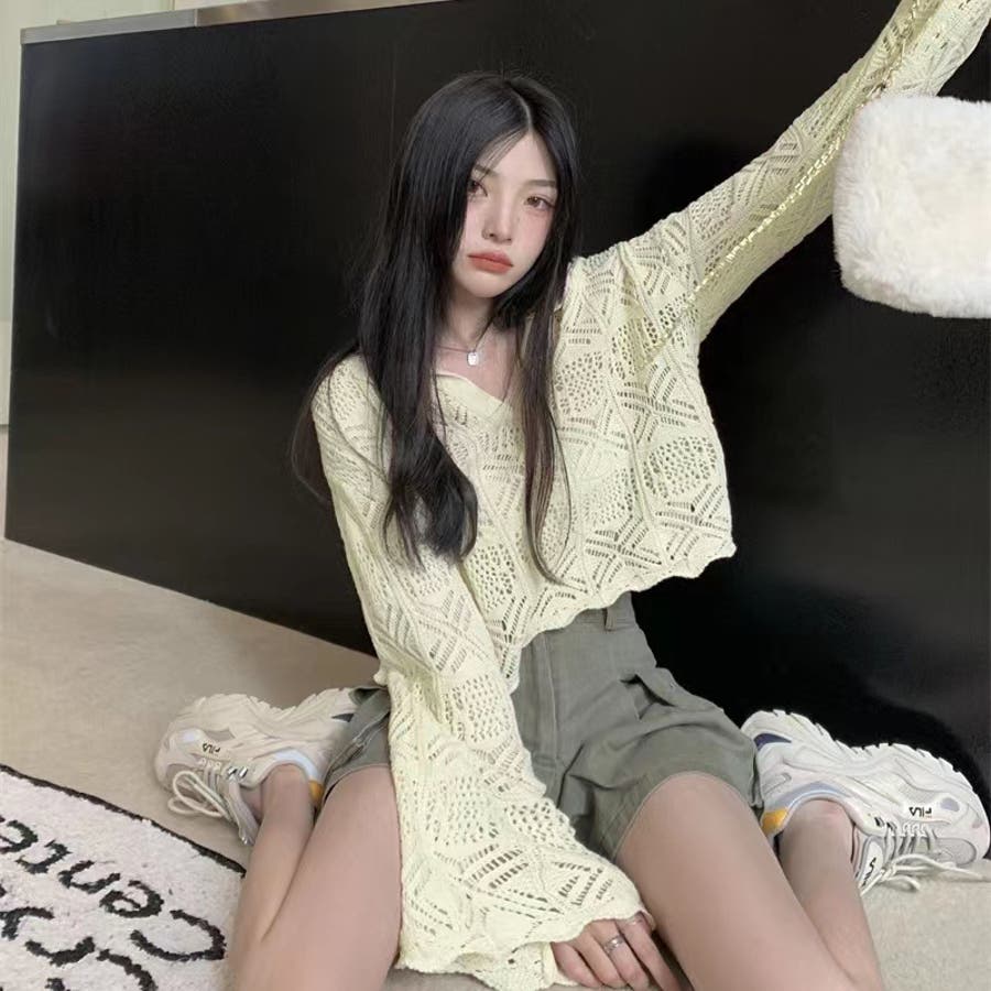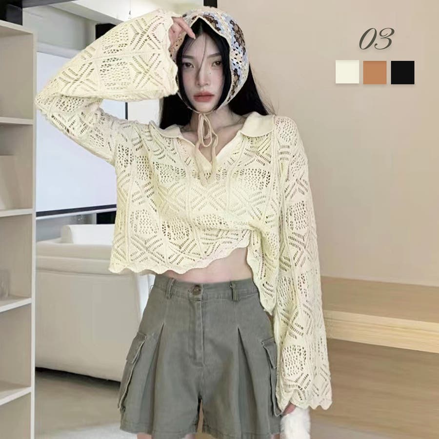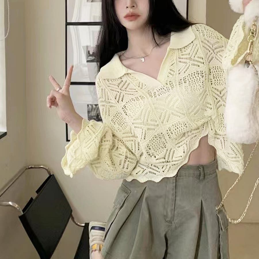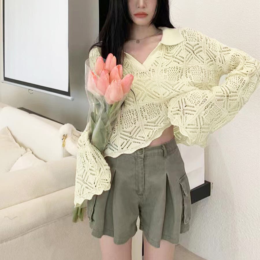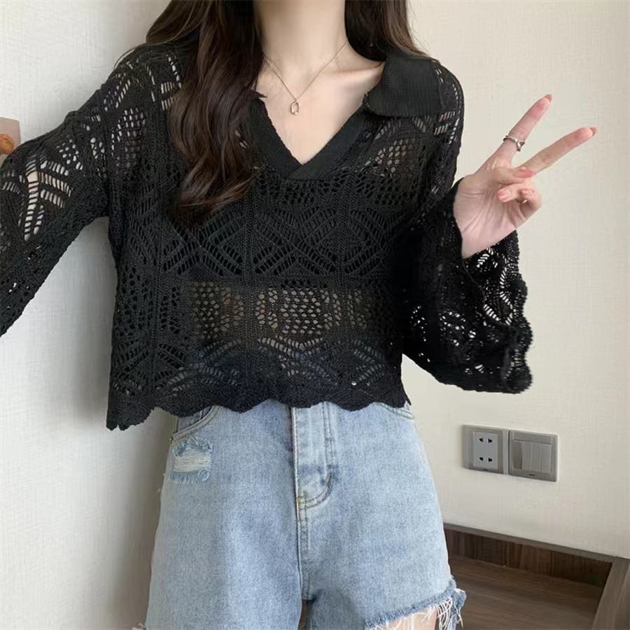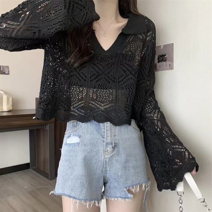 Vネックかぎ針編みニットトップス インナー 透け感トップス