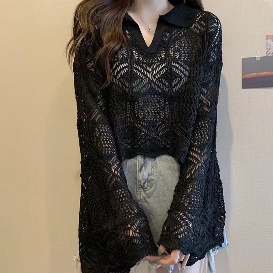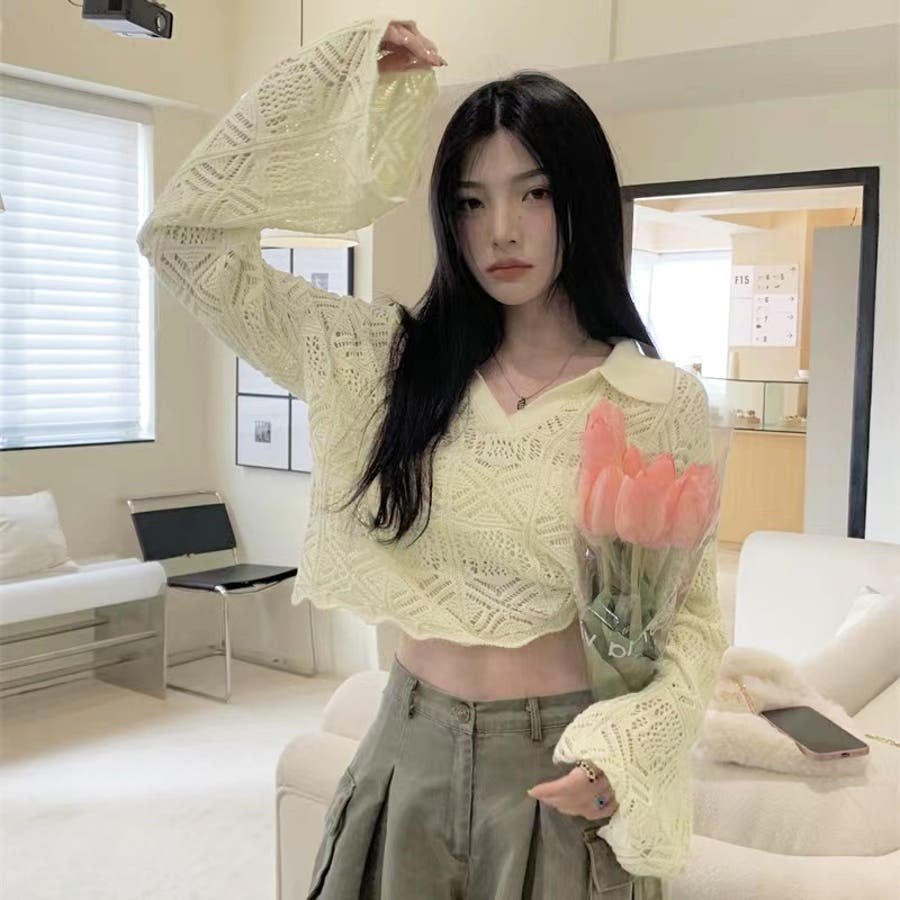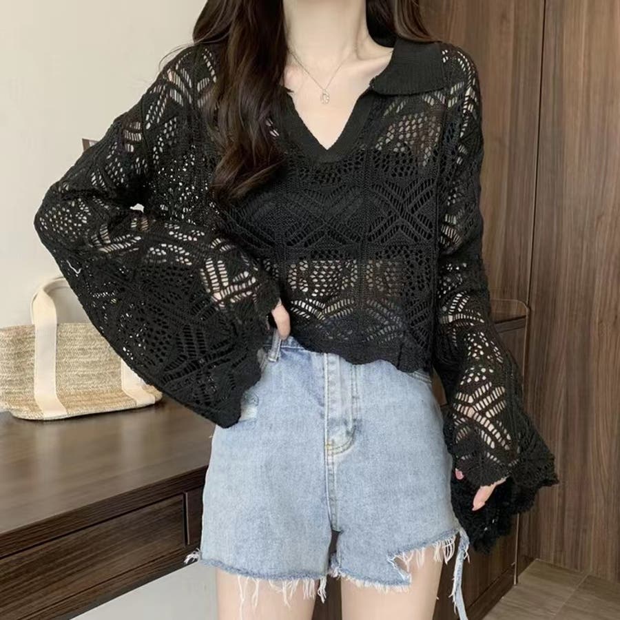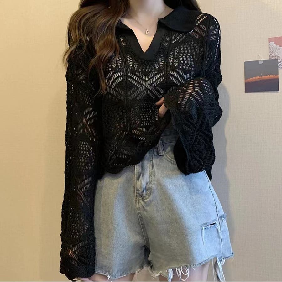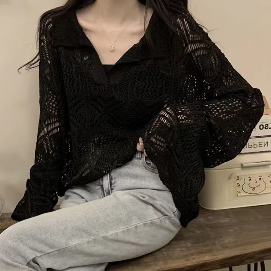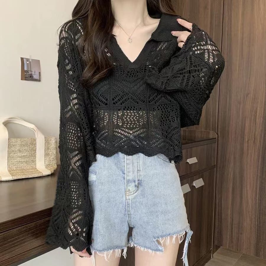 Vネックかぎ針編みニットトップス インナー 透け感トップス