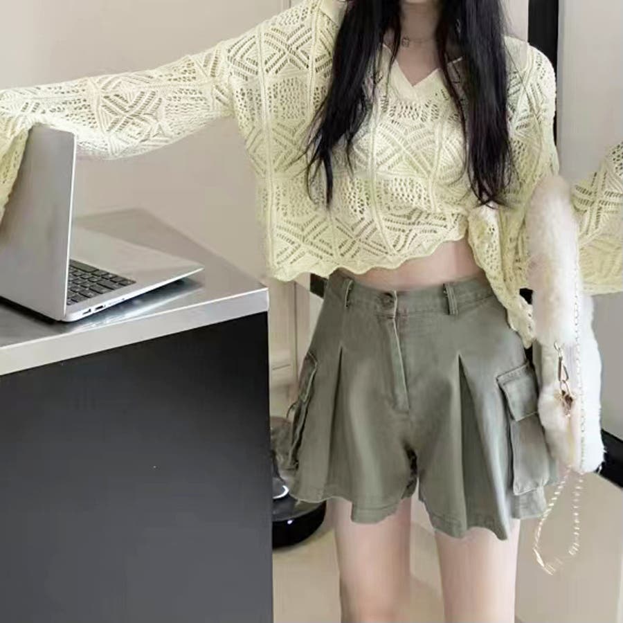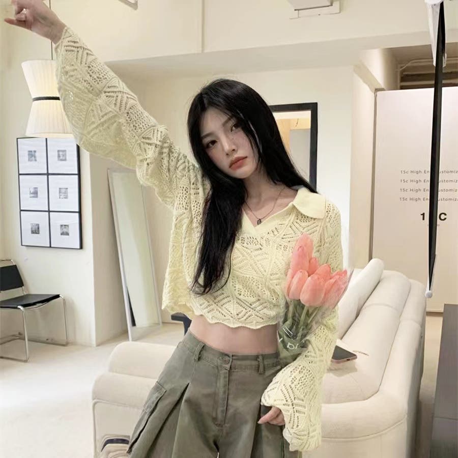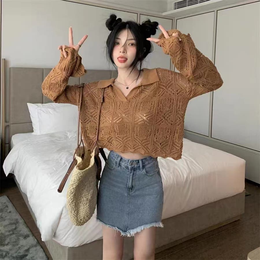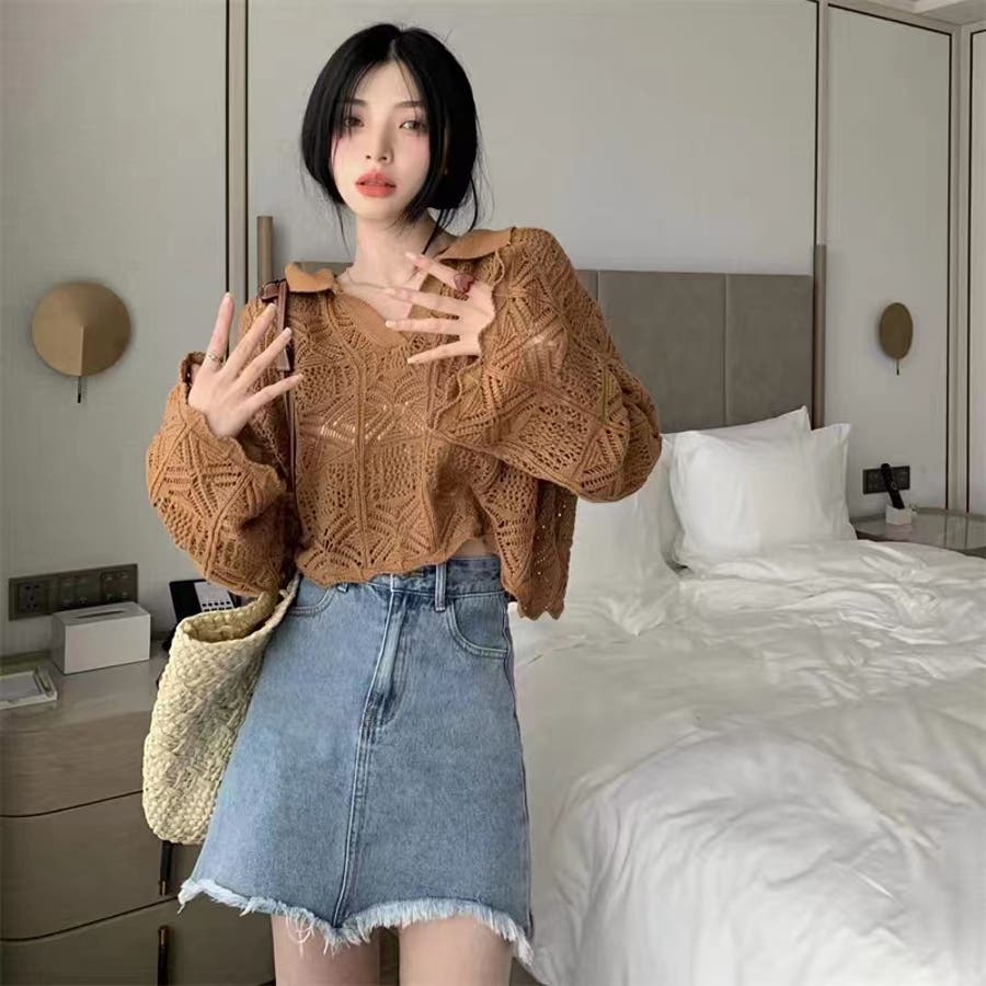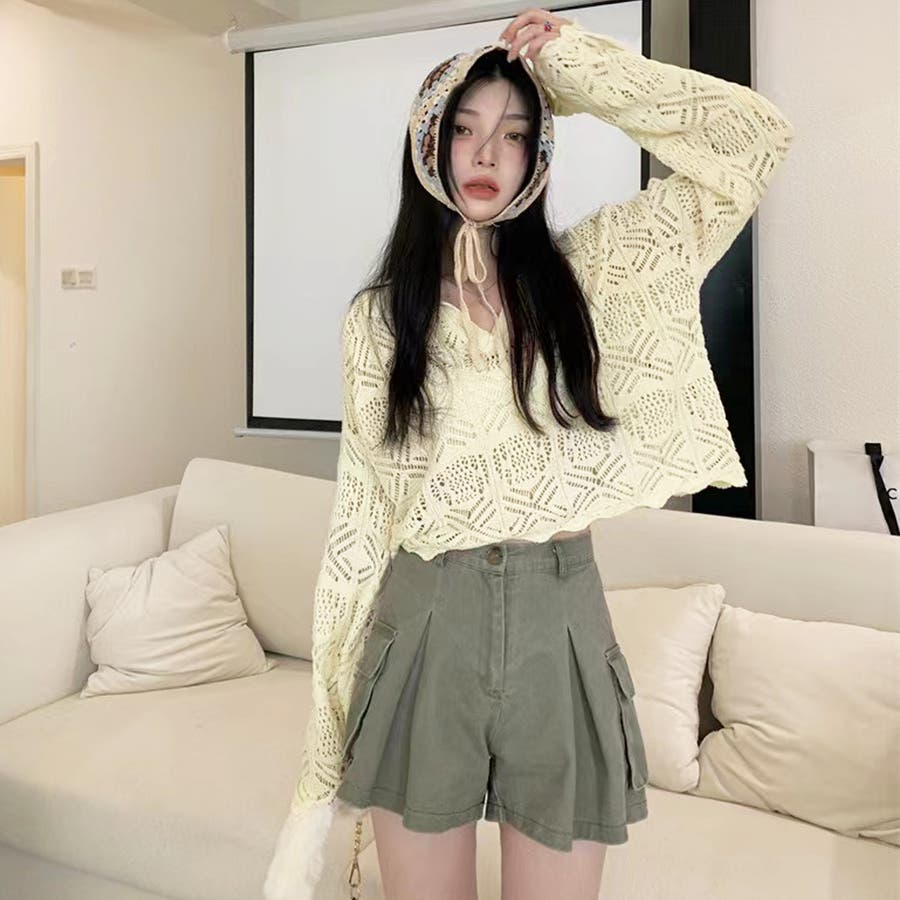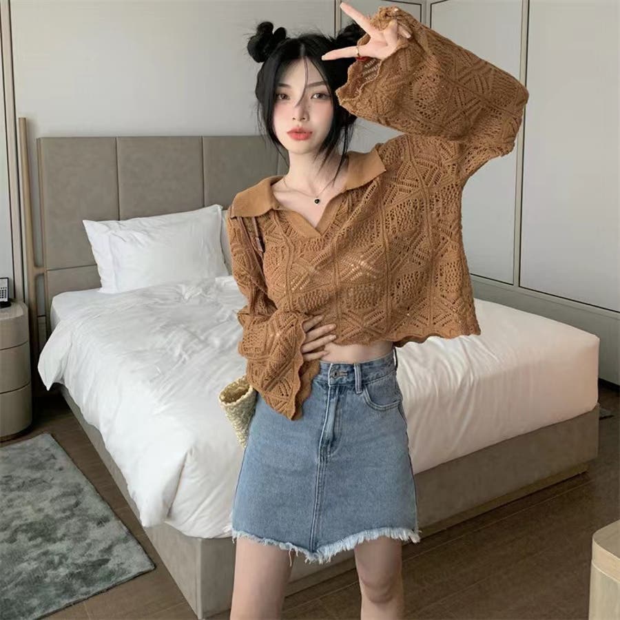 Vネックかぎ針編みニットトップス インナー 透け感トップス