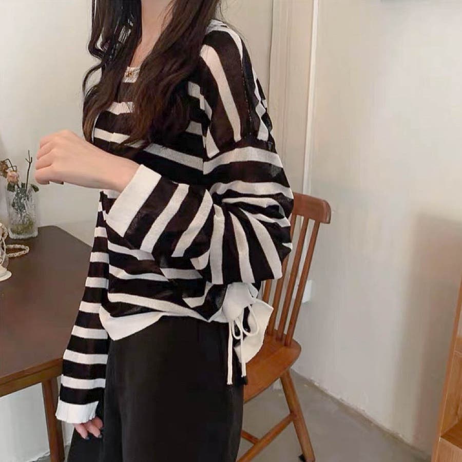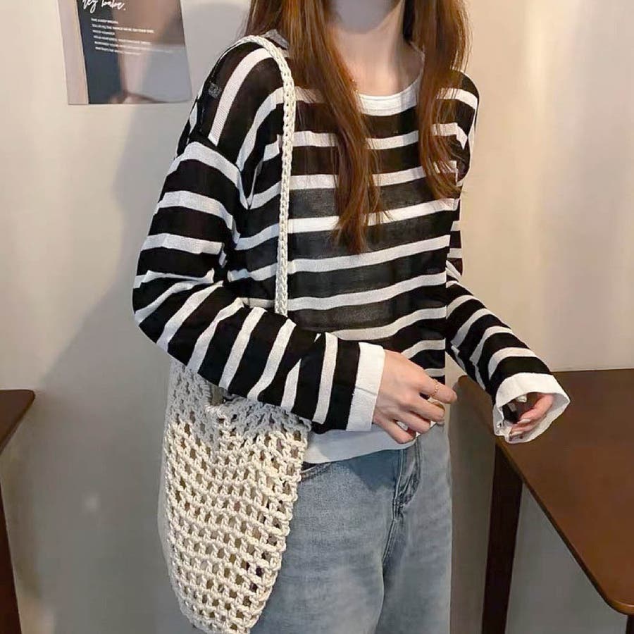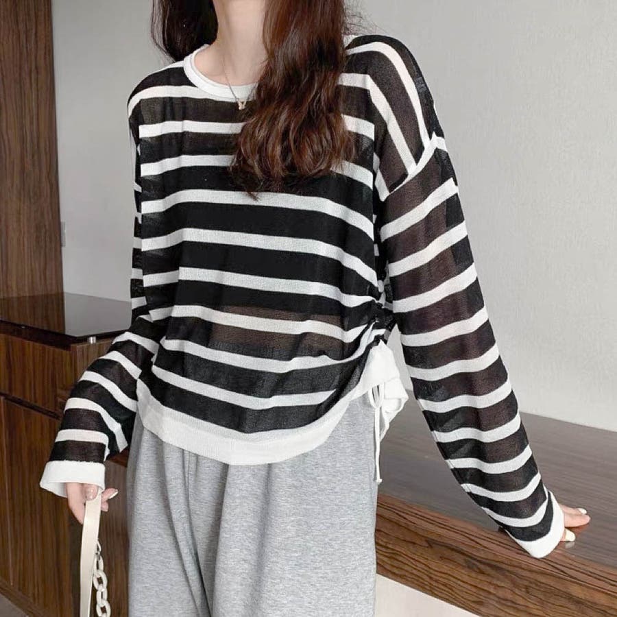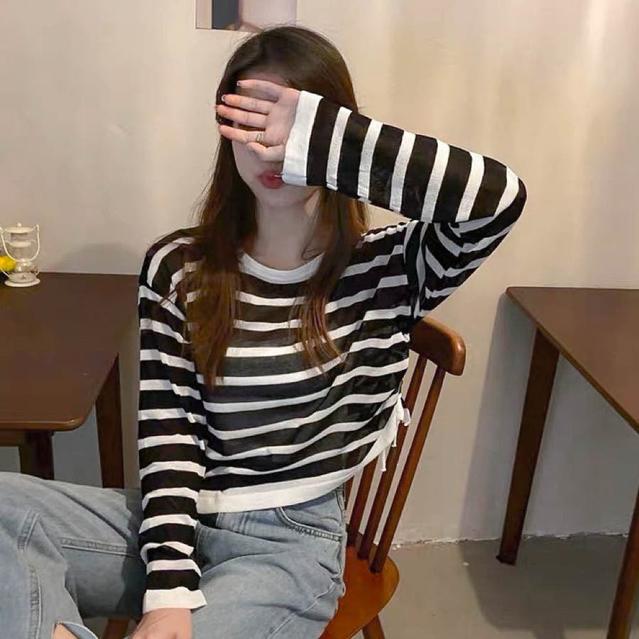 春夏新作。透かしニットトップス 韓国ファッション 夏服 冷房対策 クルーネック 丸首 日焼け止め アウター セクシー 胸元 爽やか 人気 シンプル カットソー 長袖 スウェット 可愛い スポーツ ロンT 体型カバー 無地 透け感 大きいサイズ オーバーサイズ トップス ストリート