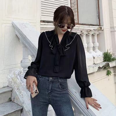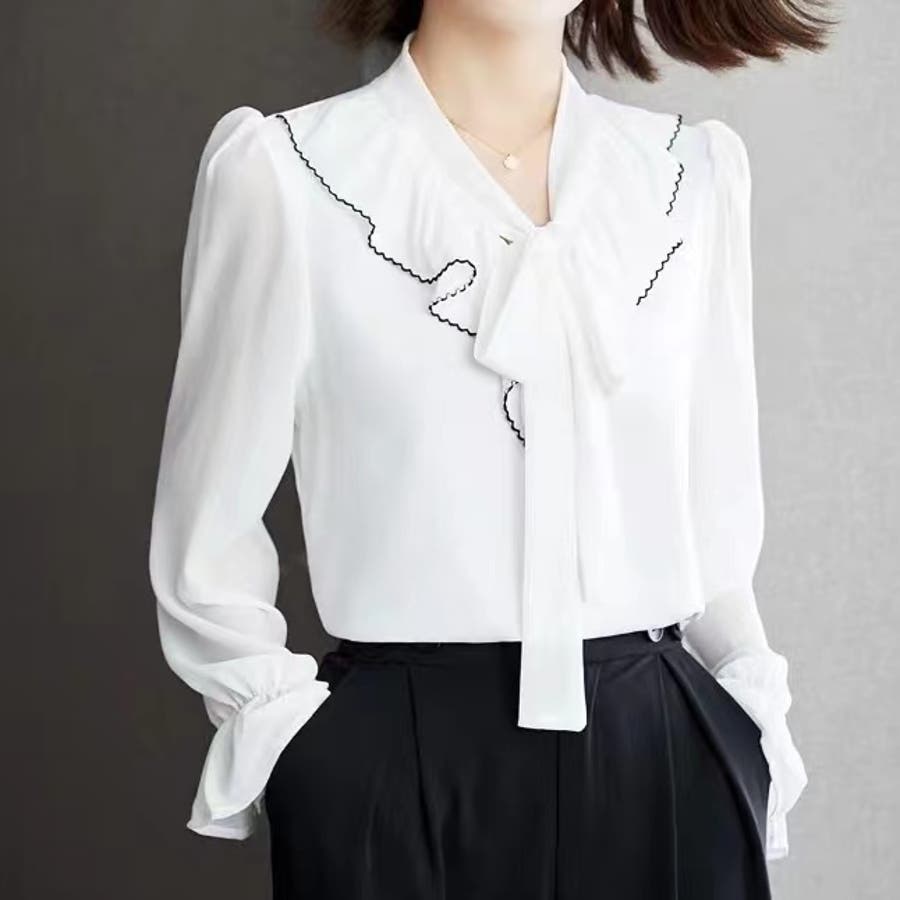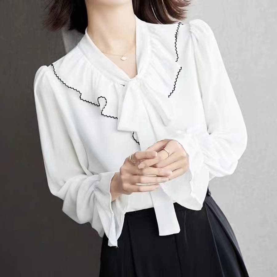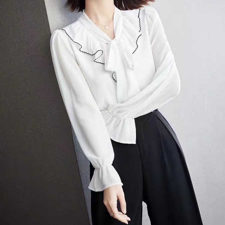 フリルスリーブVネックボウタイリボンブラウス 春 韓国ファッション