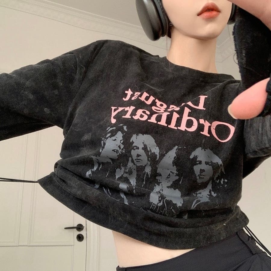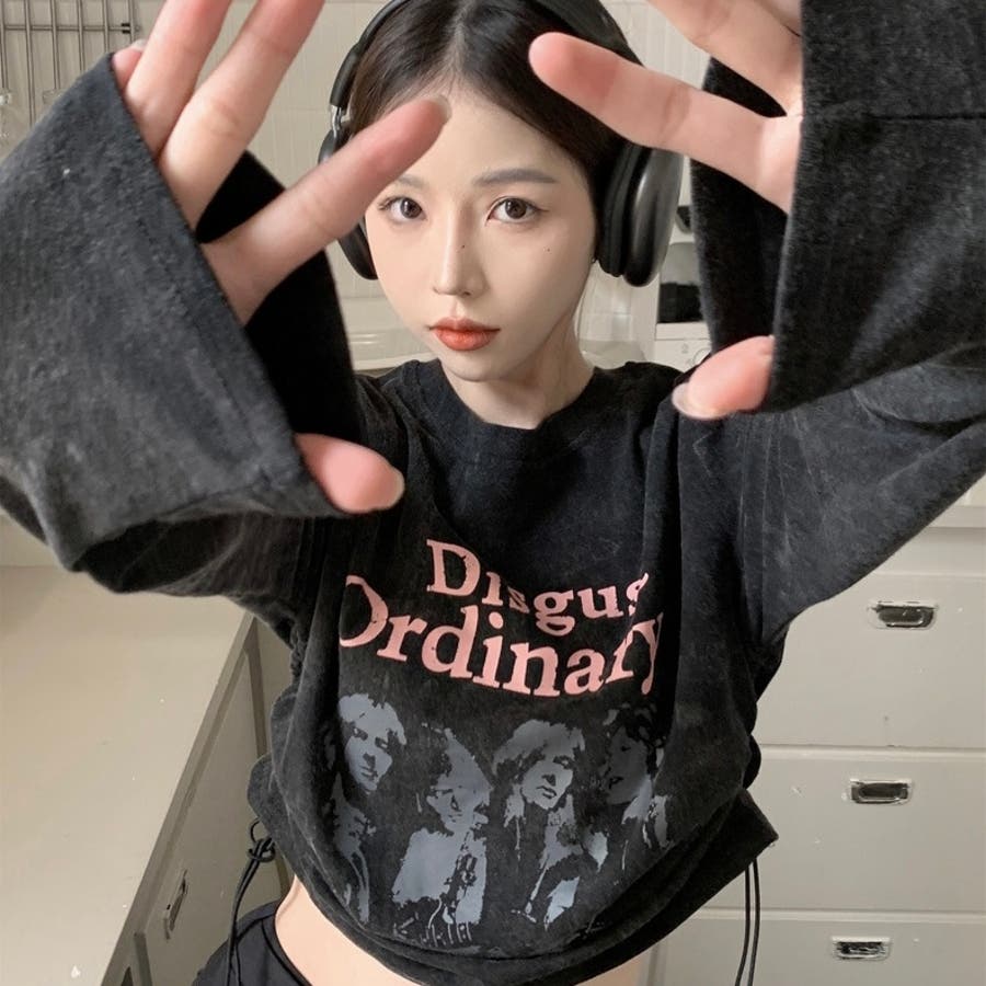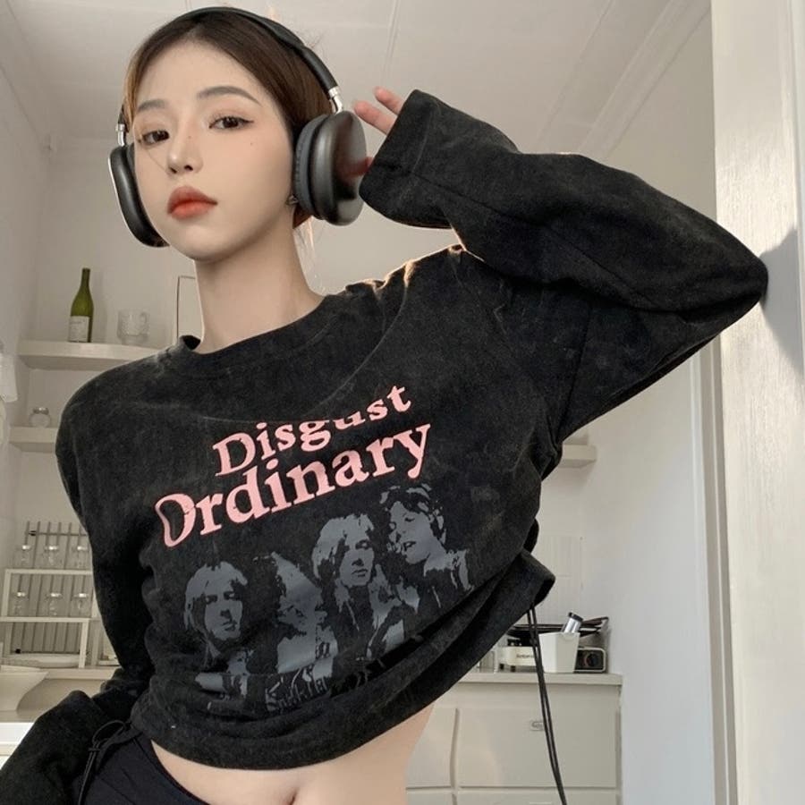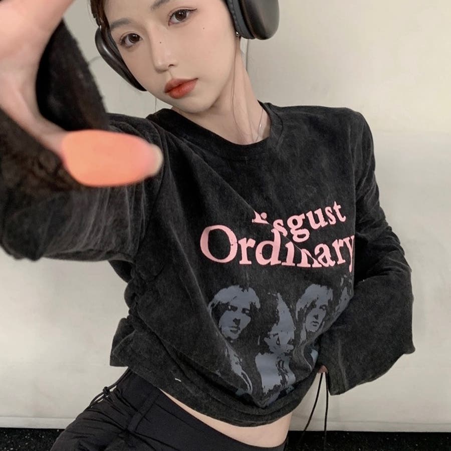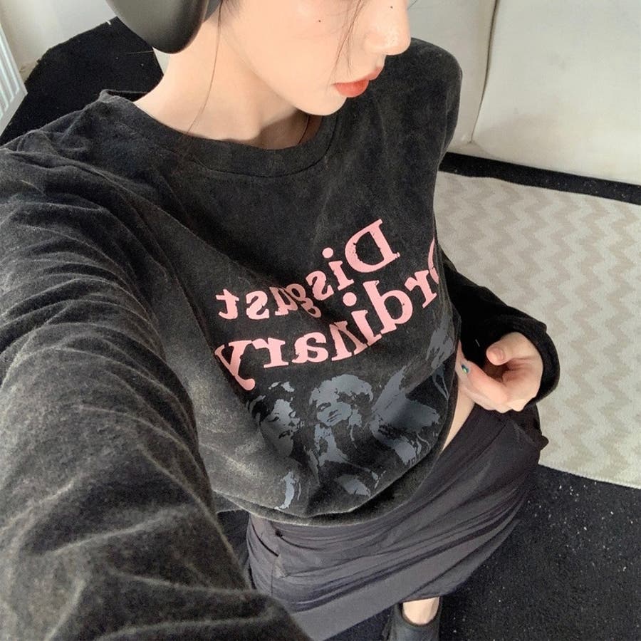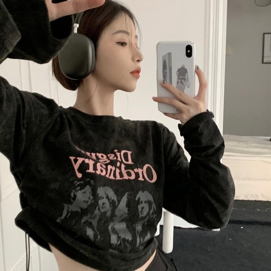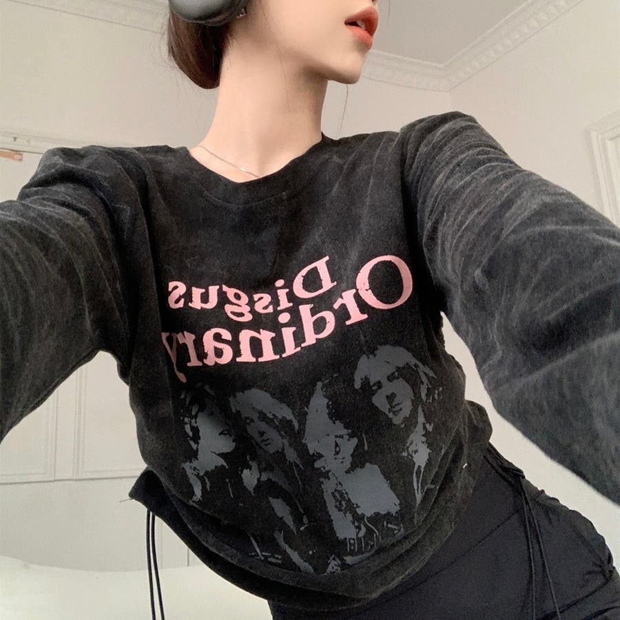 両側ギャザープリントトップス 韓国ファッション 秋 韓国