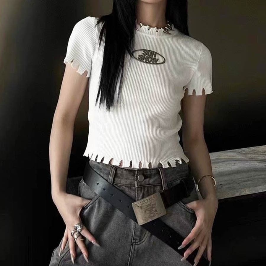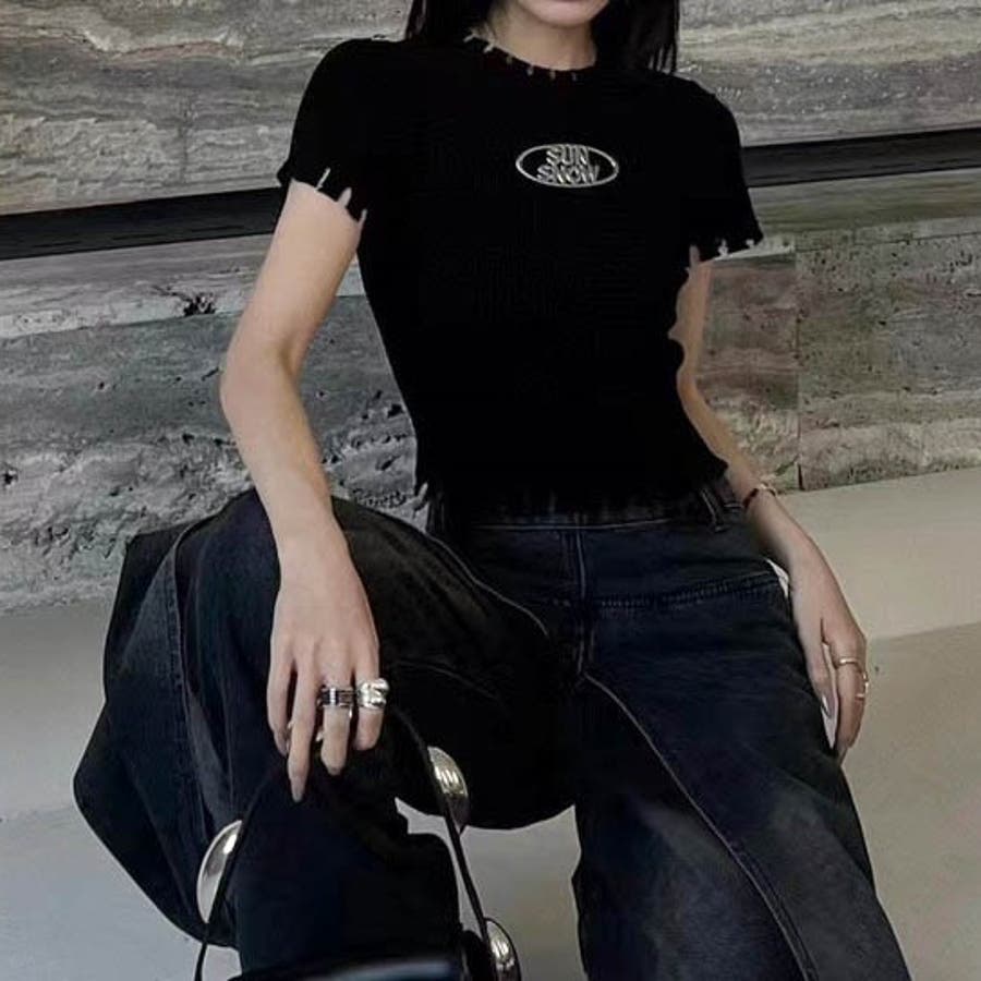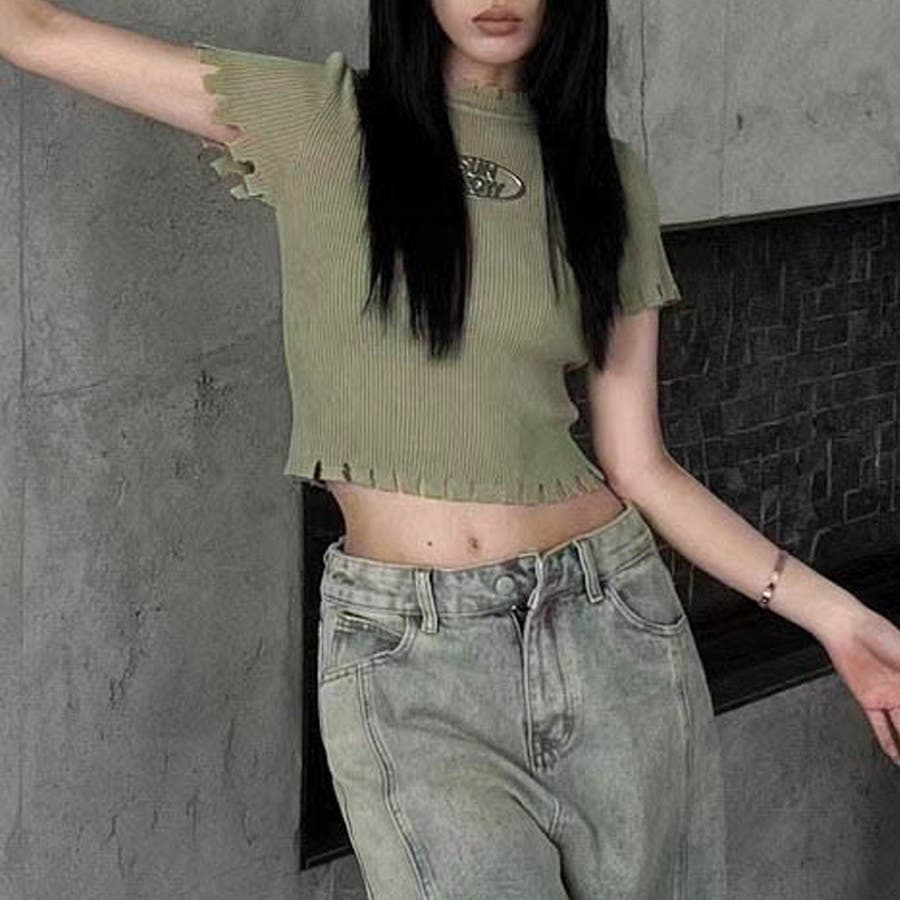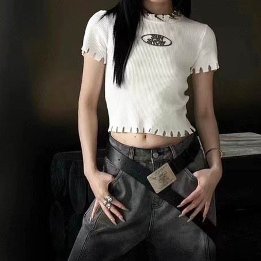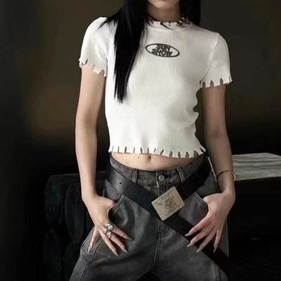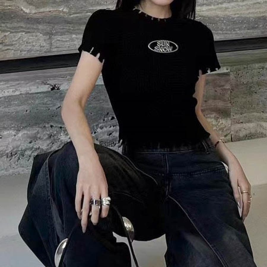 配色がこなれ感をプラスまたダメージ加工が裾、袖、ネック部分に施されており、今っぽいアイテムに仕上げました♪