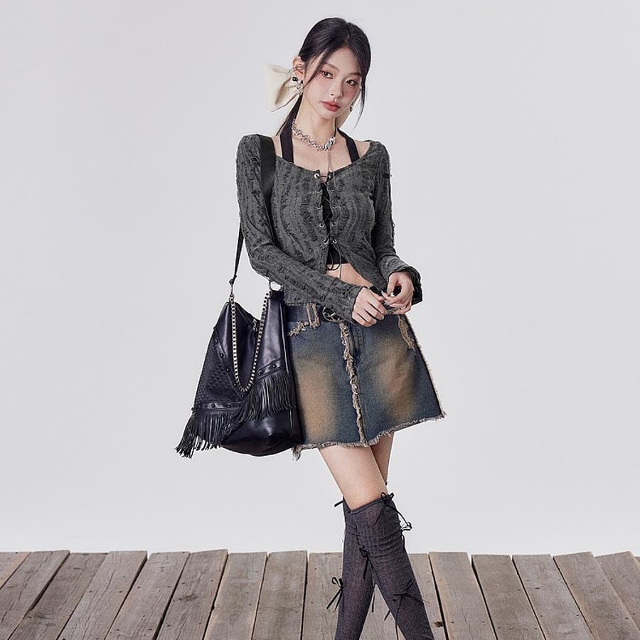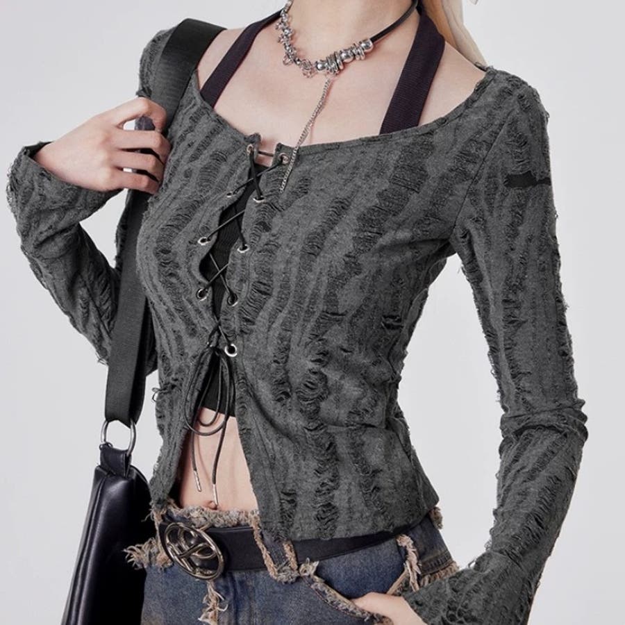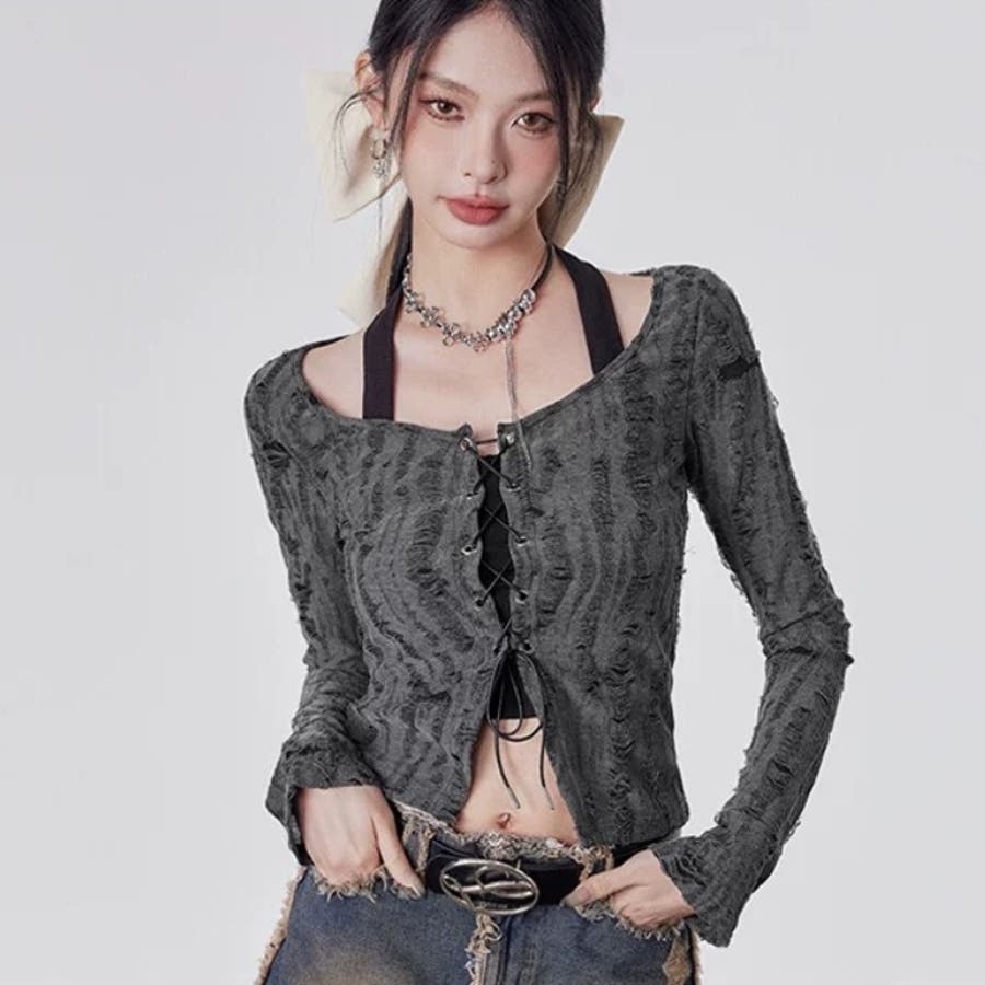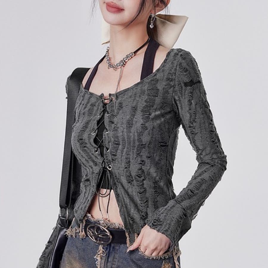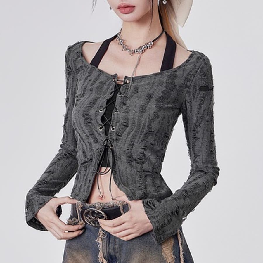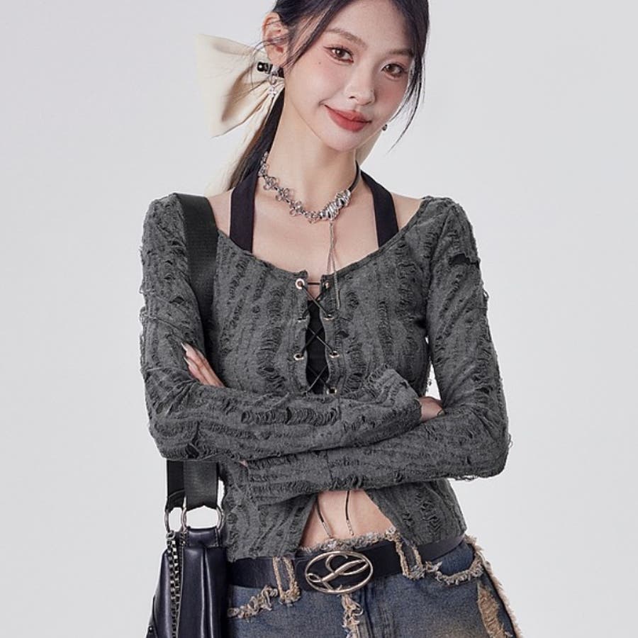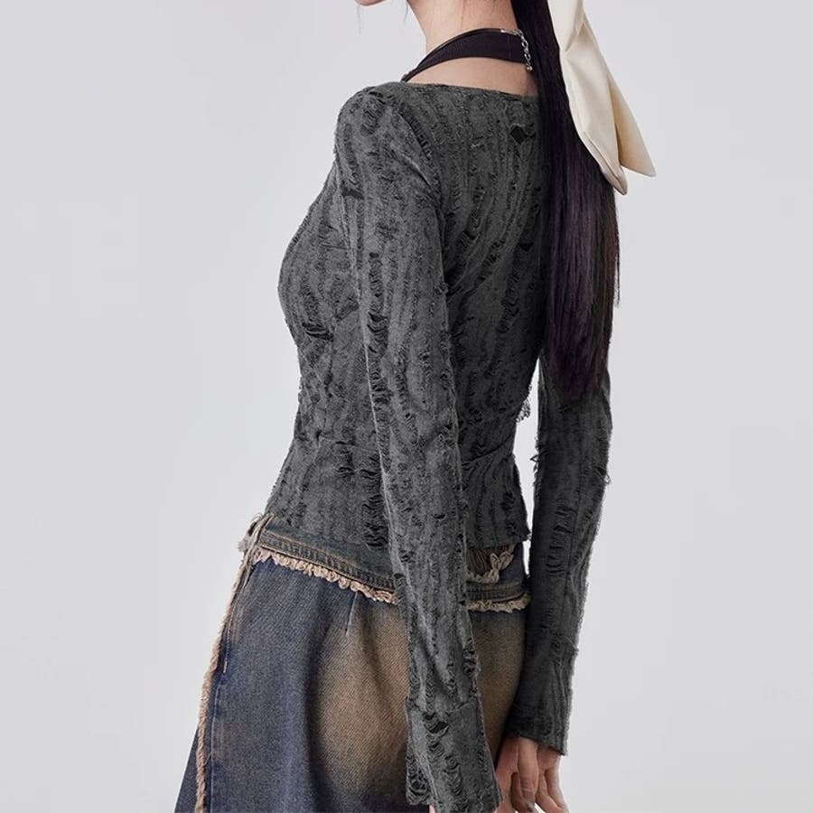 表情豊かなメランジニットにダメージ加工がアクセントになったUネックニット。