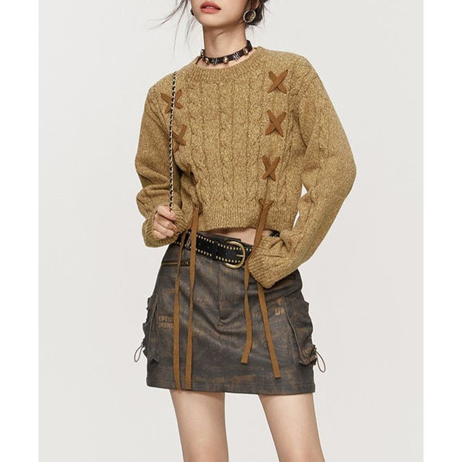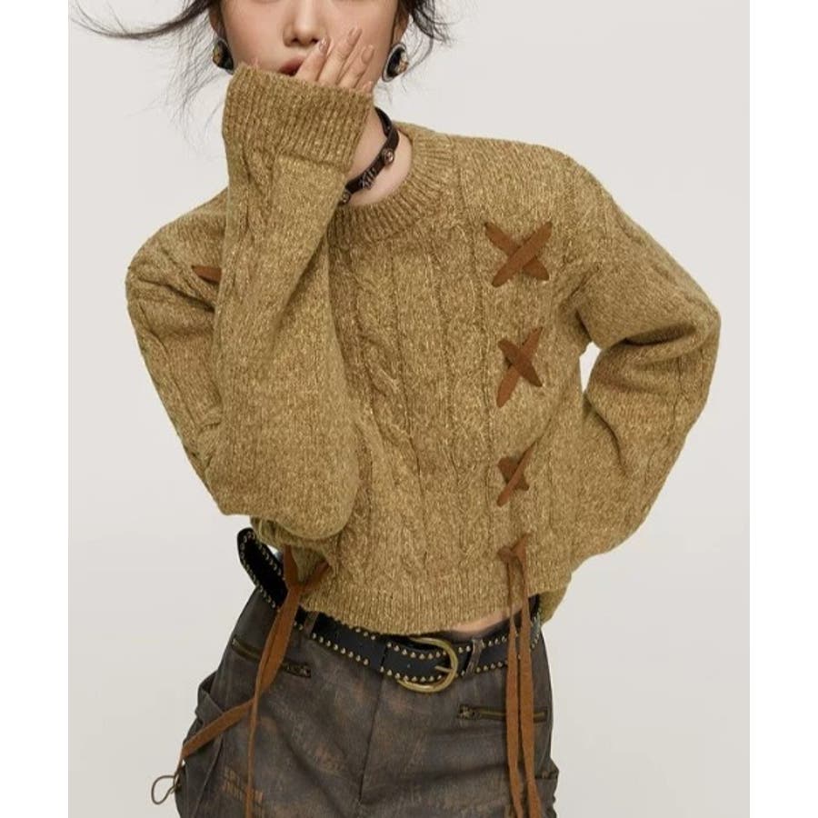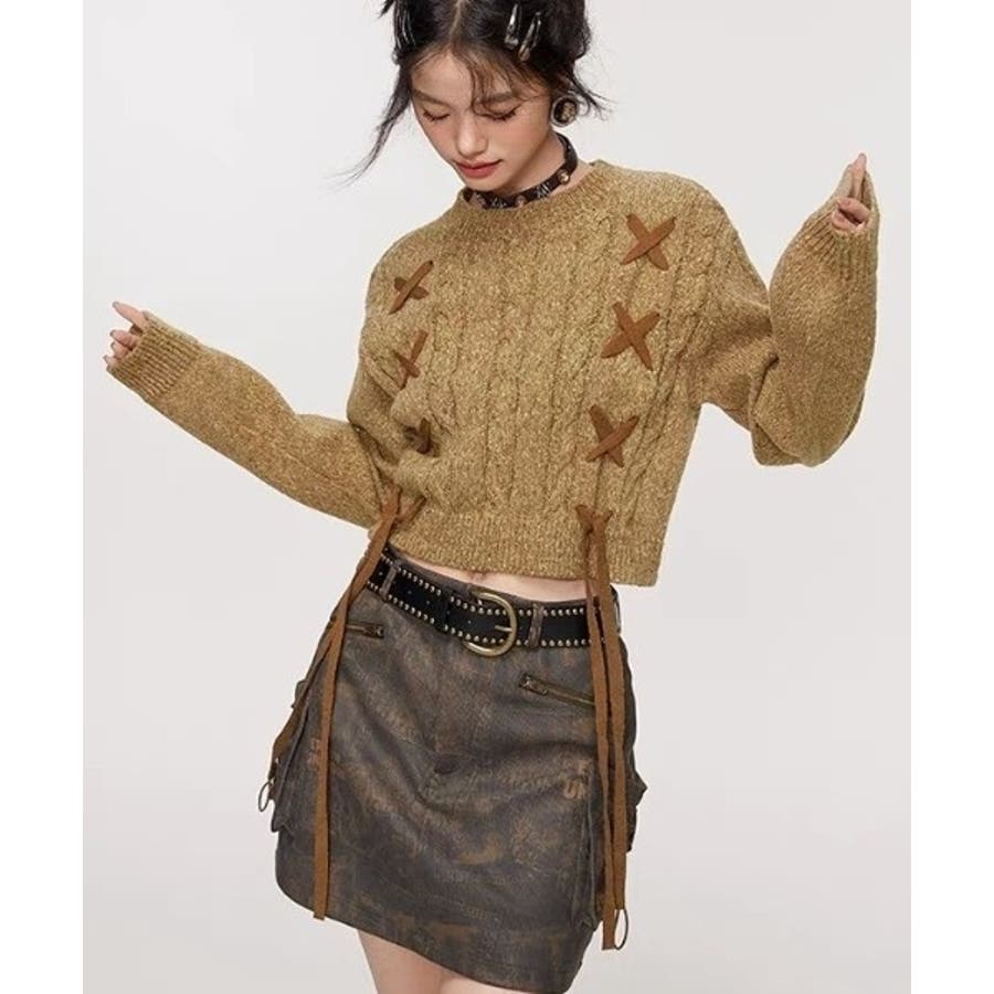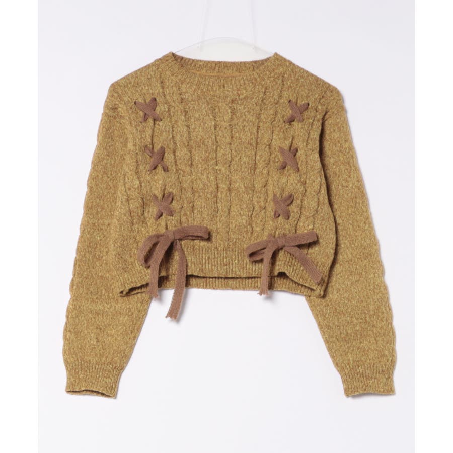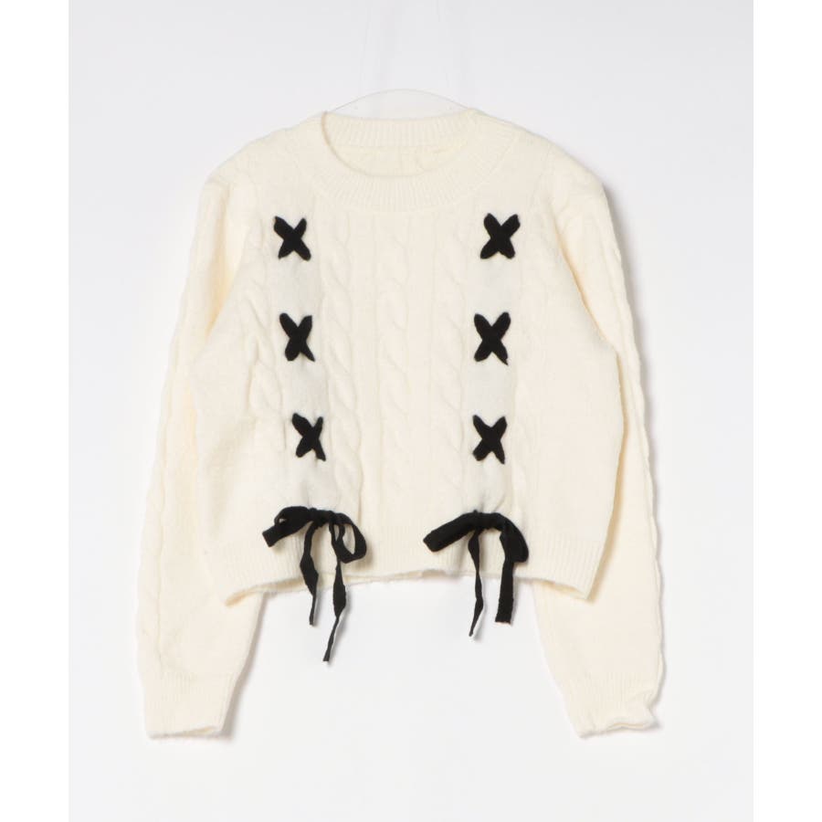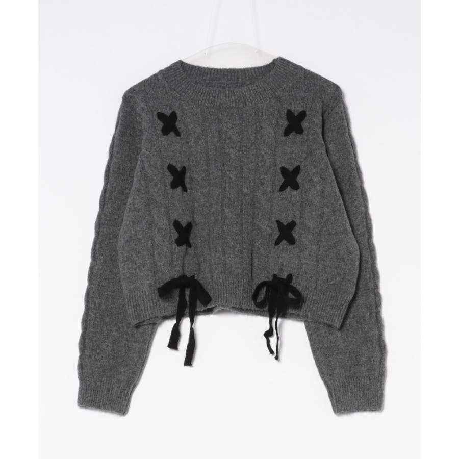 【商品詳細】 秋冬コーディネートを格上げする、リボンディテールが特徴のクロスマークニットセーター。フロントにデザインされたX字型のリボンが個性的なアクセントを加え、一枚で存在感を放ちます。調整可能なリボンはスタイリングに合わせて異なる表情を楽しめるため、着こなしの幅が広がります。