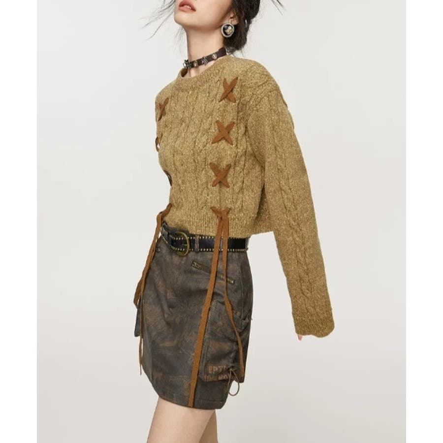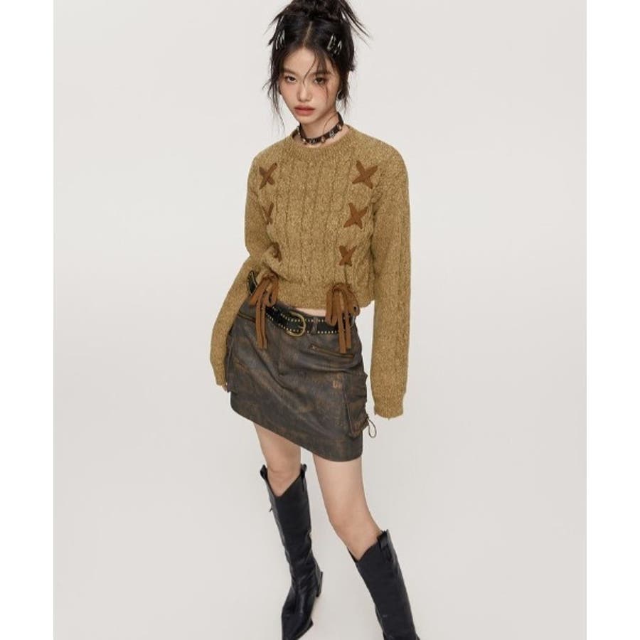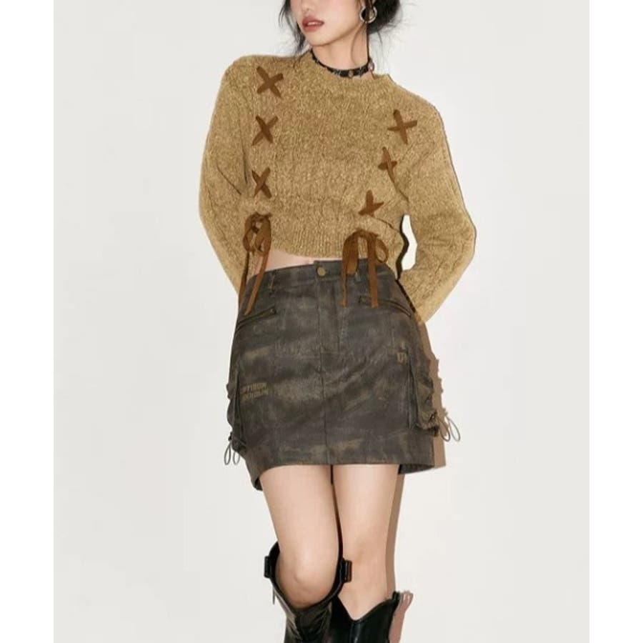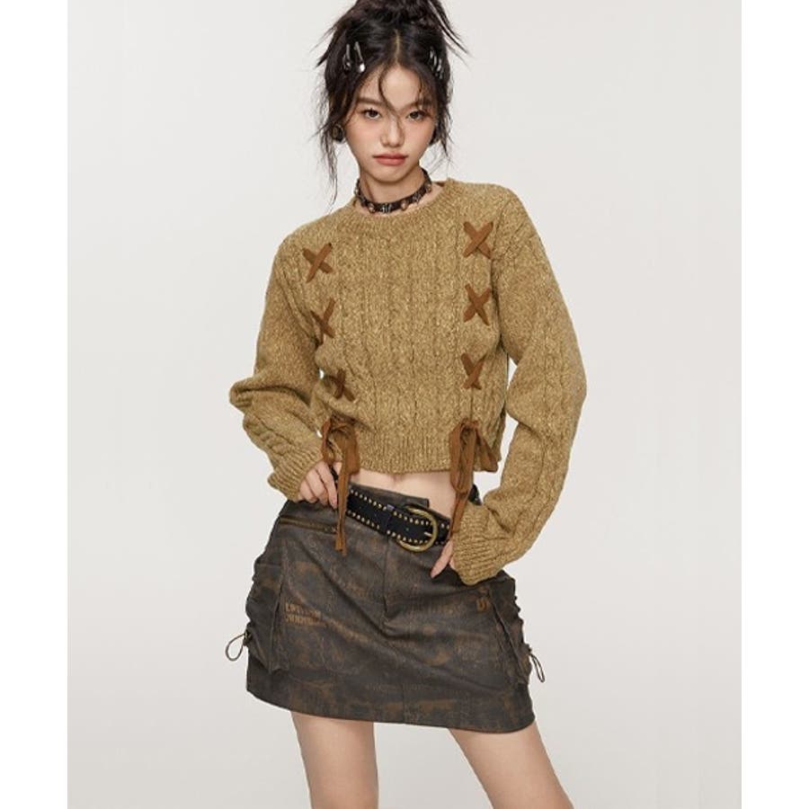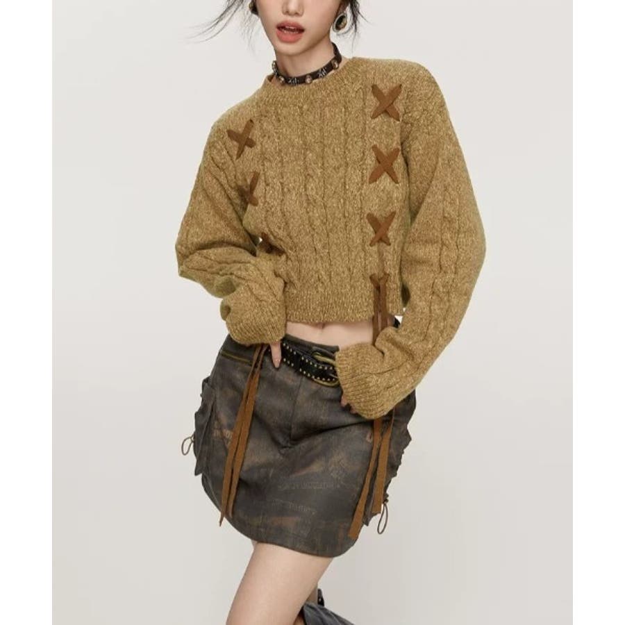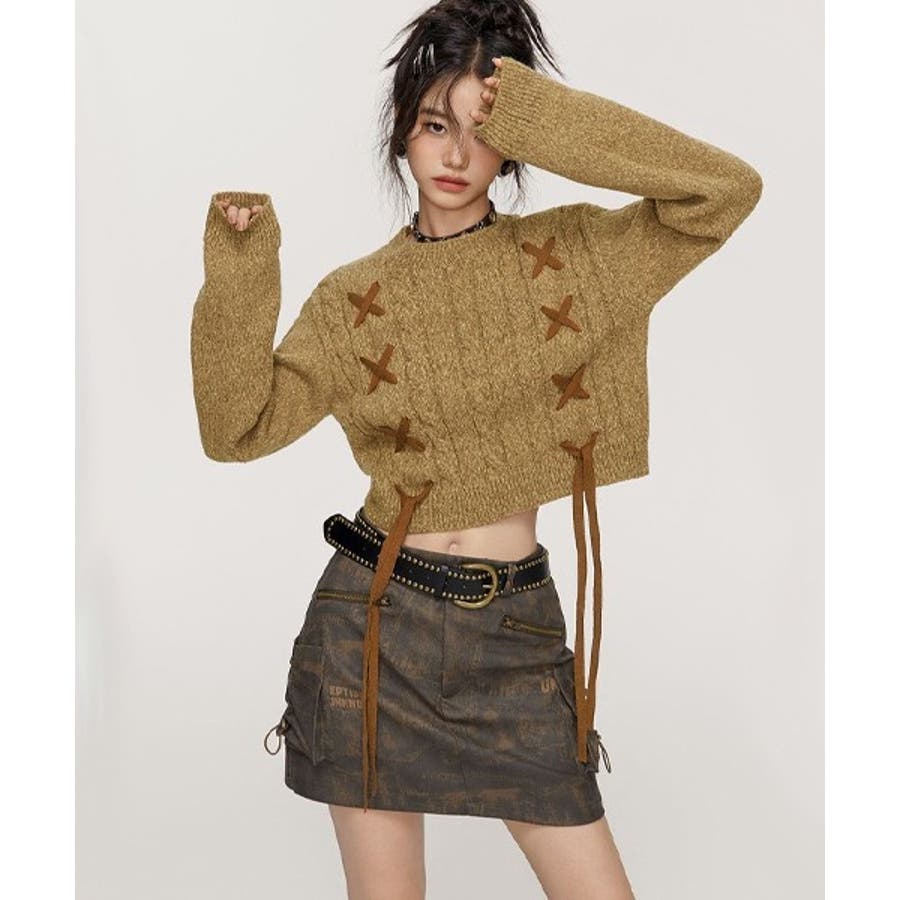 【商品詳細】 秋冬コーディネートを格上げする、リボンディテールが特徴のクロスマークニットセーター。フロントにデザインされたX字型のリボンが個性的なアクセントを加え、一枚で存在感を放ちます。調整可能なリボンはスタイリングに合わせて異なる表情を楽しめるため、着こなしの幅が広がります。