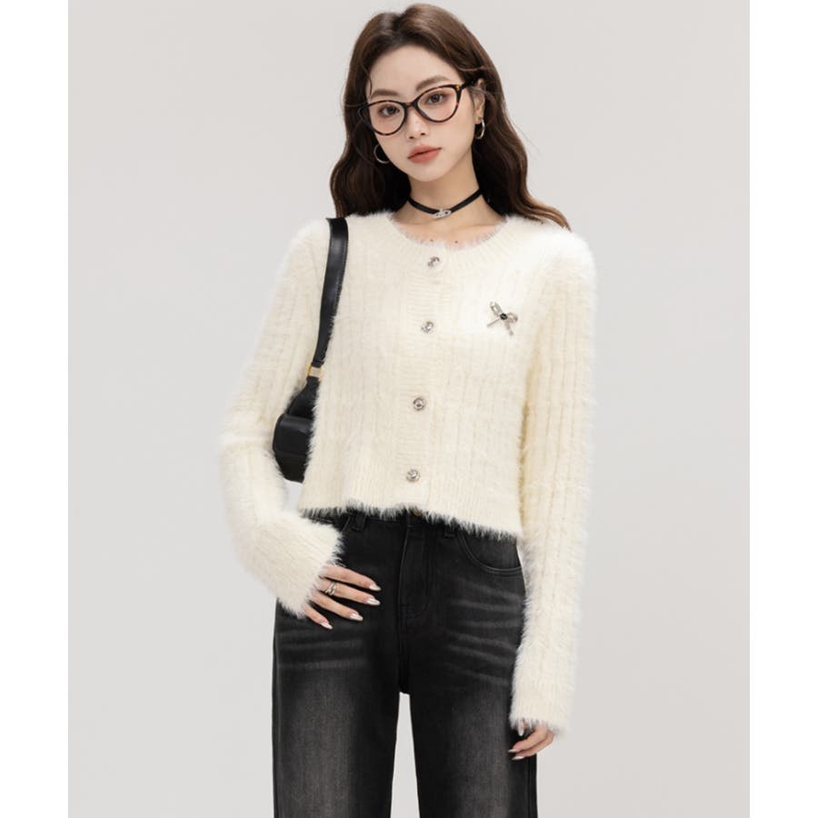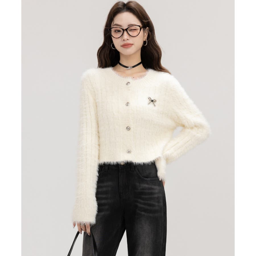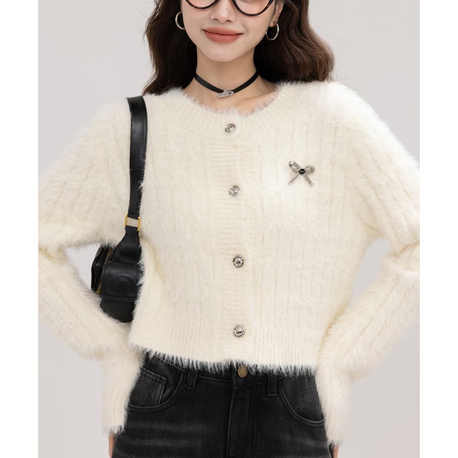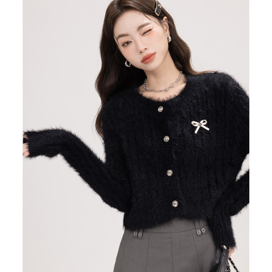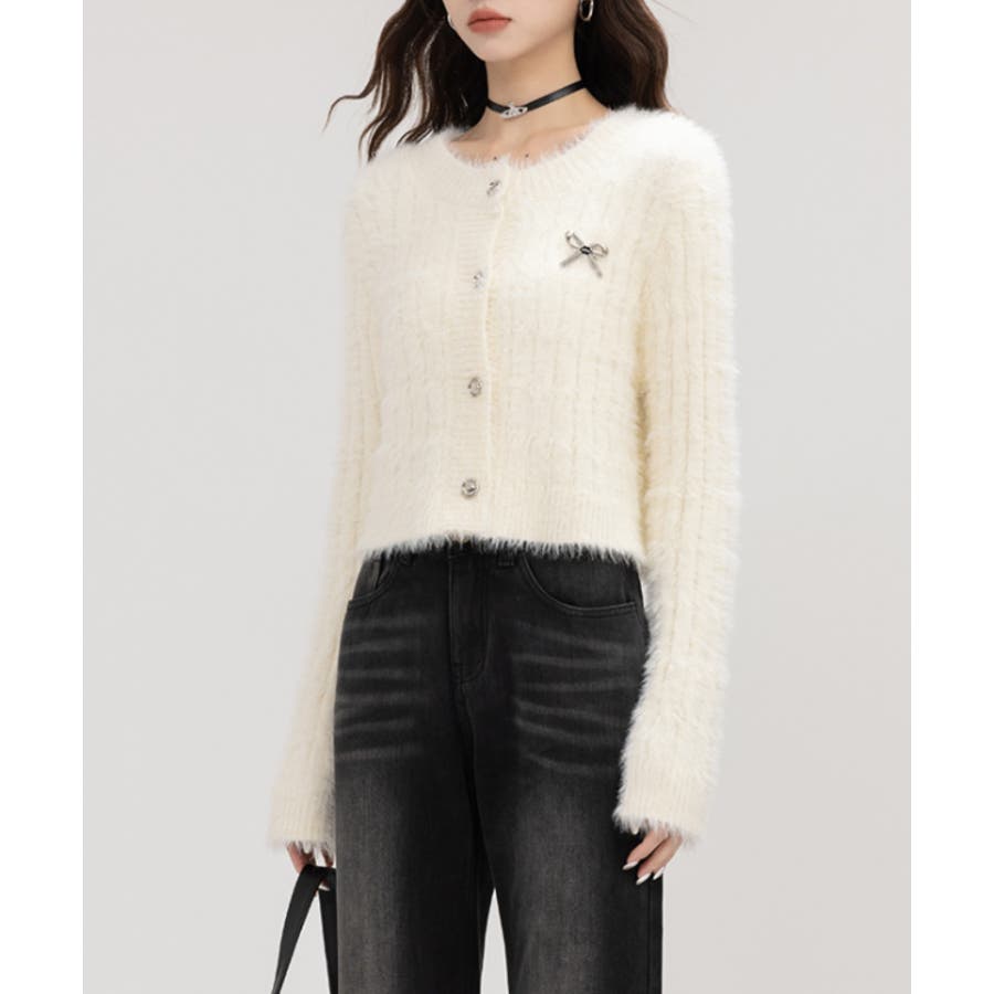 フェミニンな装いを引き立てるリボンブローチ付きフワフワカーディガン カーディガン…